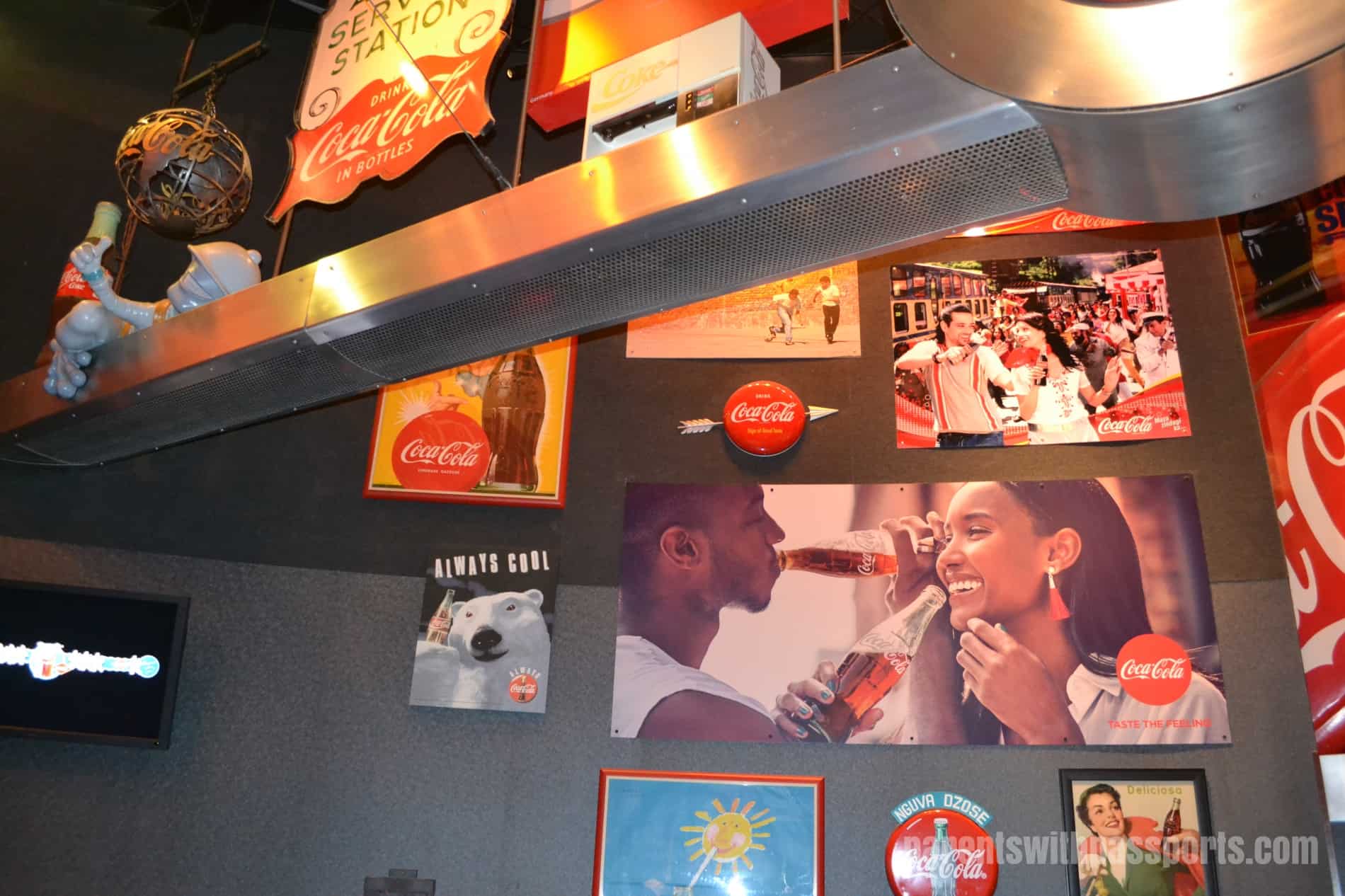 After purchasing your ticket or using your CitiPASS, you enter into the main lobby where there is a bar area set up to hand out mini Coke cans (or a mini can of your Coca-Cola beverage of choice). You can enjoy your ice cold Coke while waiting on line to enter the theater. There were a few artistic bottle displays in the lobby but the Coca-Cola Loft on your way to the theater is your first real dose of Coke advertising. A combination of old timey and foreign coke signs hung from the ceilings and walls.