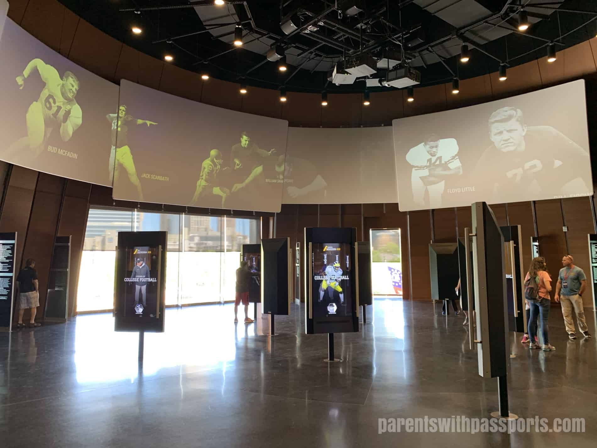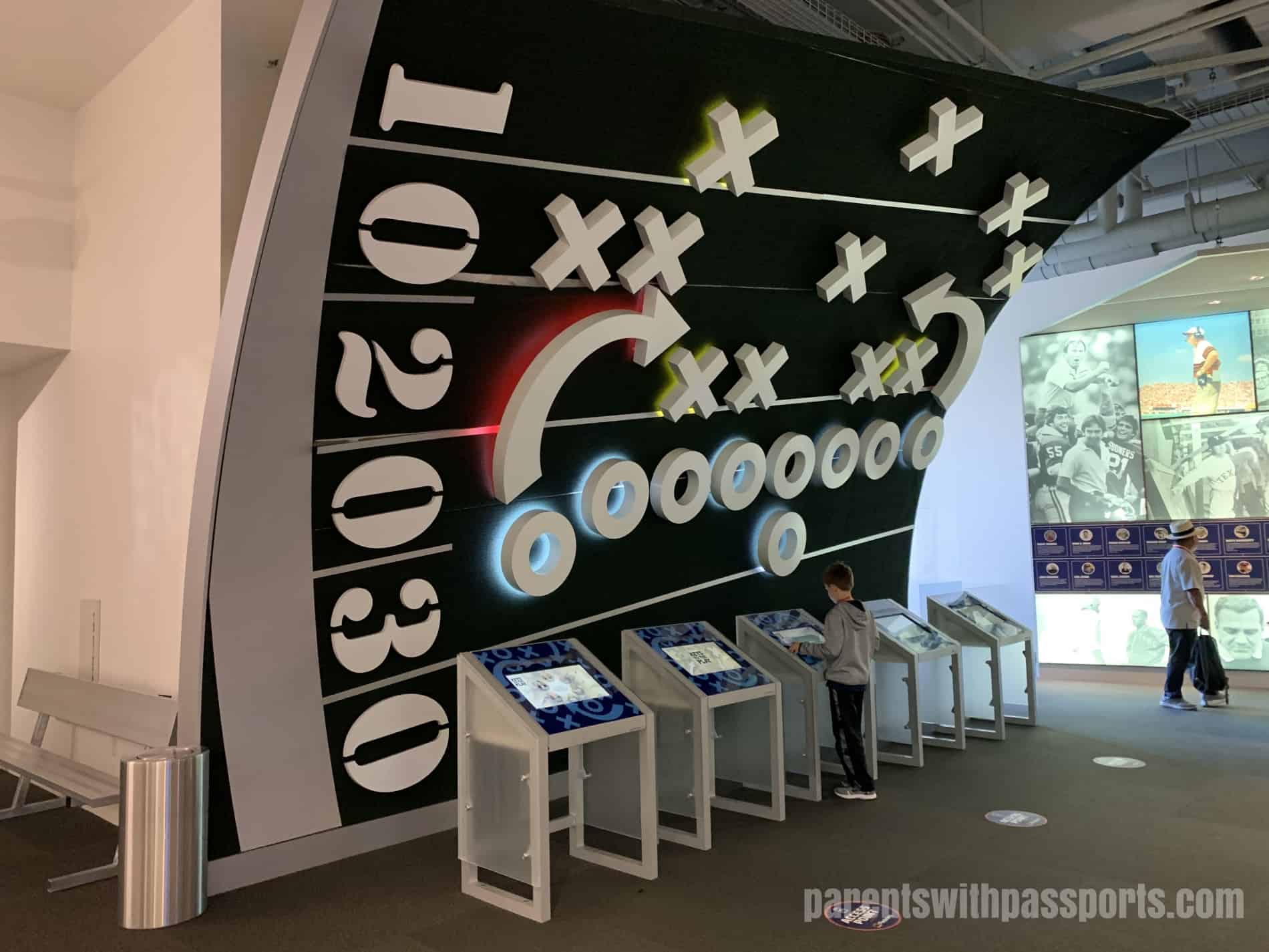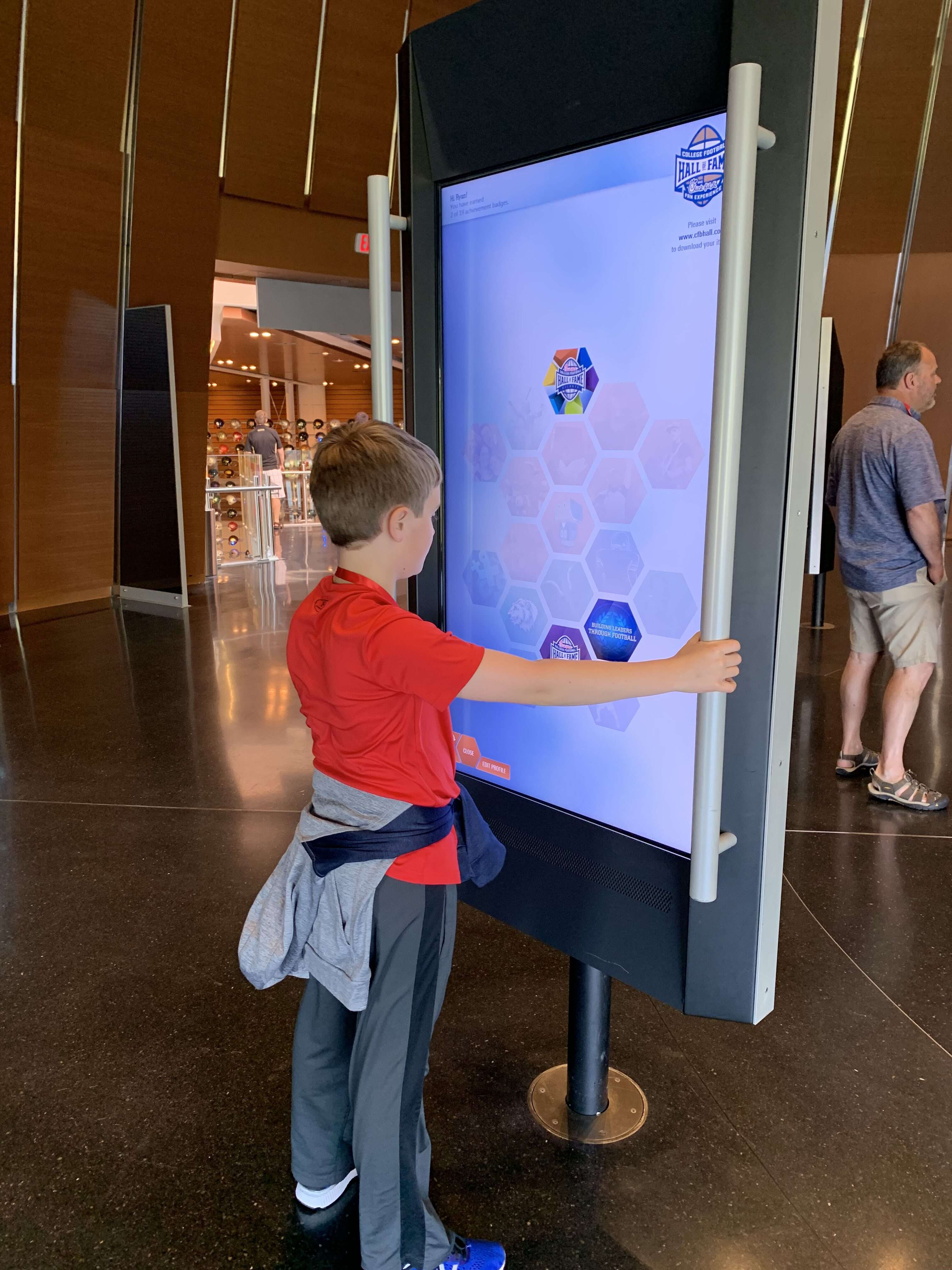 Everybody is given an “All-Access Pass” and a lanyard. You can personalize your experience by linking your name and favorite college team to your pass on the computers in the atrium. The boys thought that it was really cool that when you select your team, a light flashes under its helmet on the wall.
