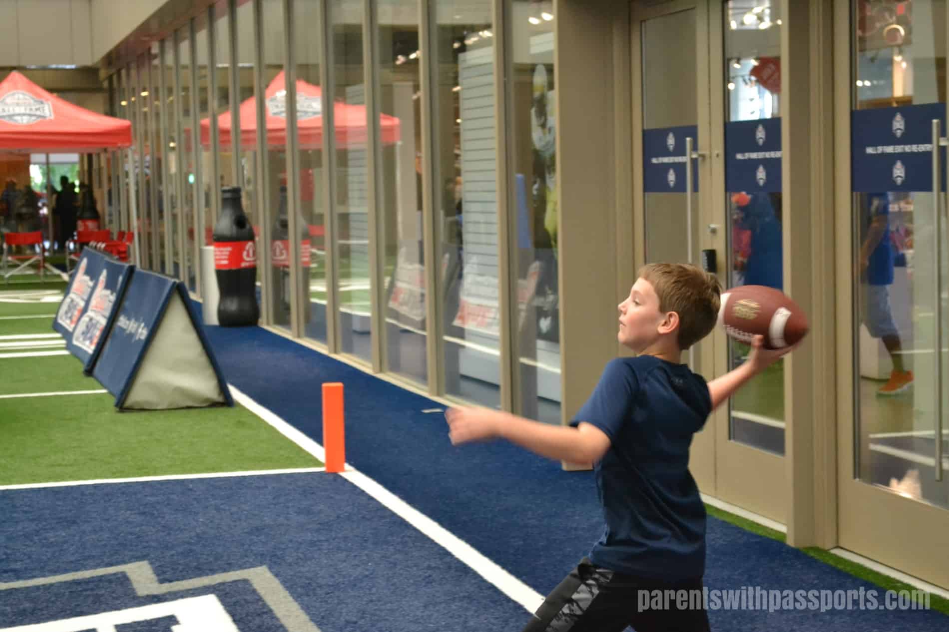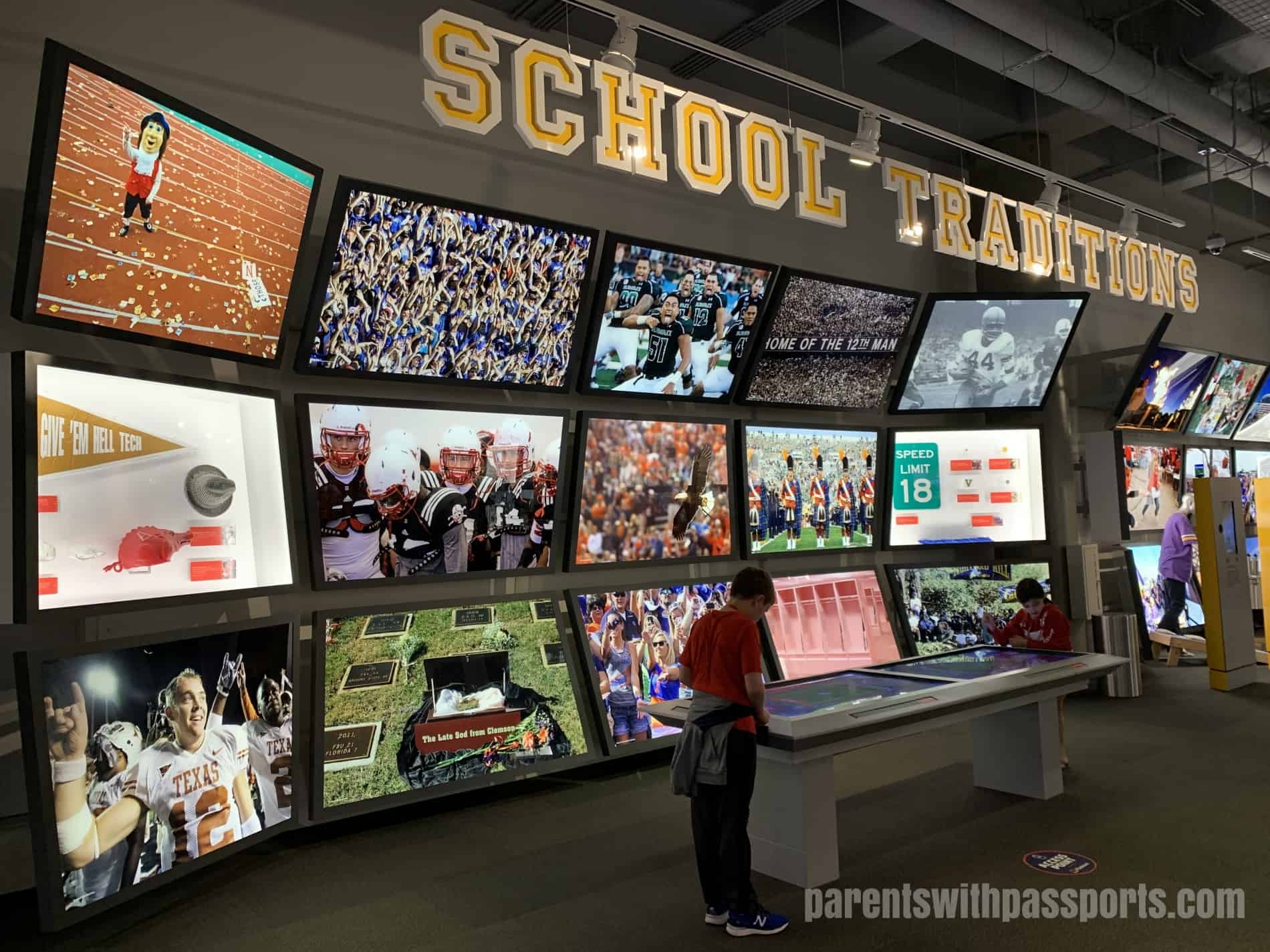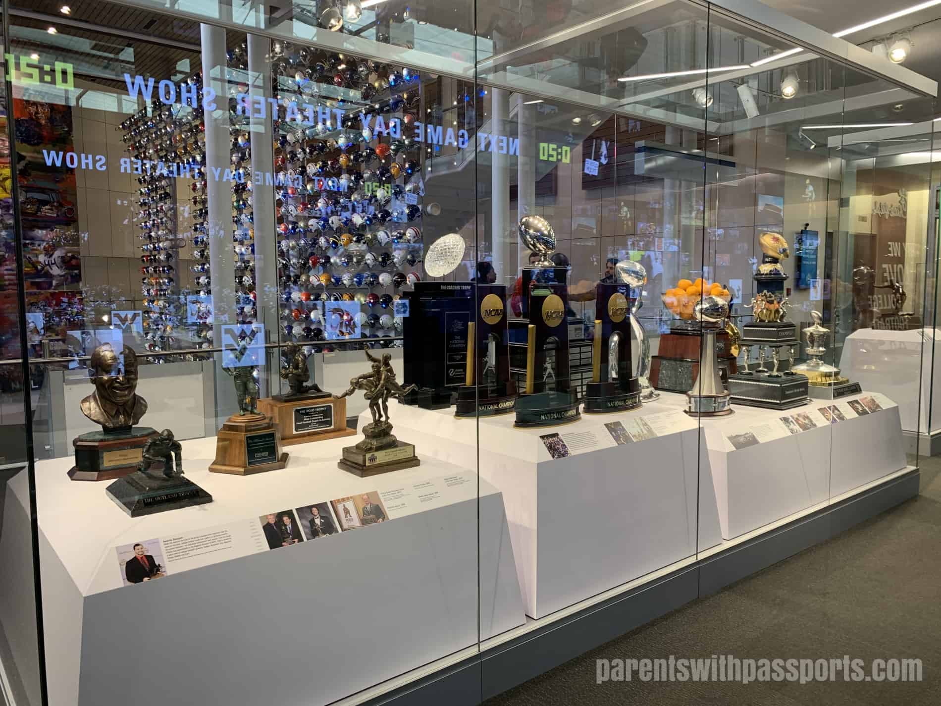 Everybody is given an “All-Access Pass” and a lanyard. You can personalize your experience by linking your name and favorite college team to your pass on the computers in the atrium. The boys thought that it was really cool that when you select your team, a light flashes under its helmet on the wall.