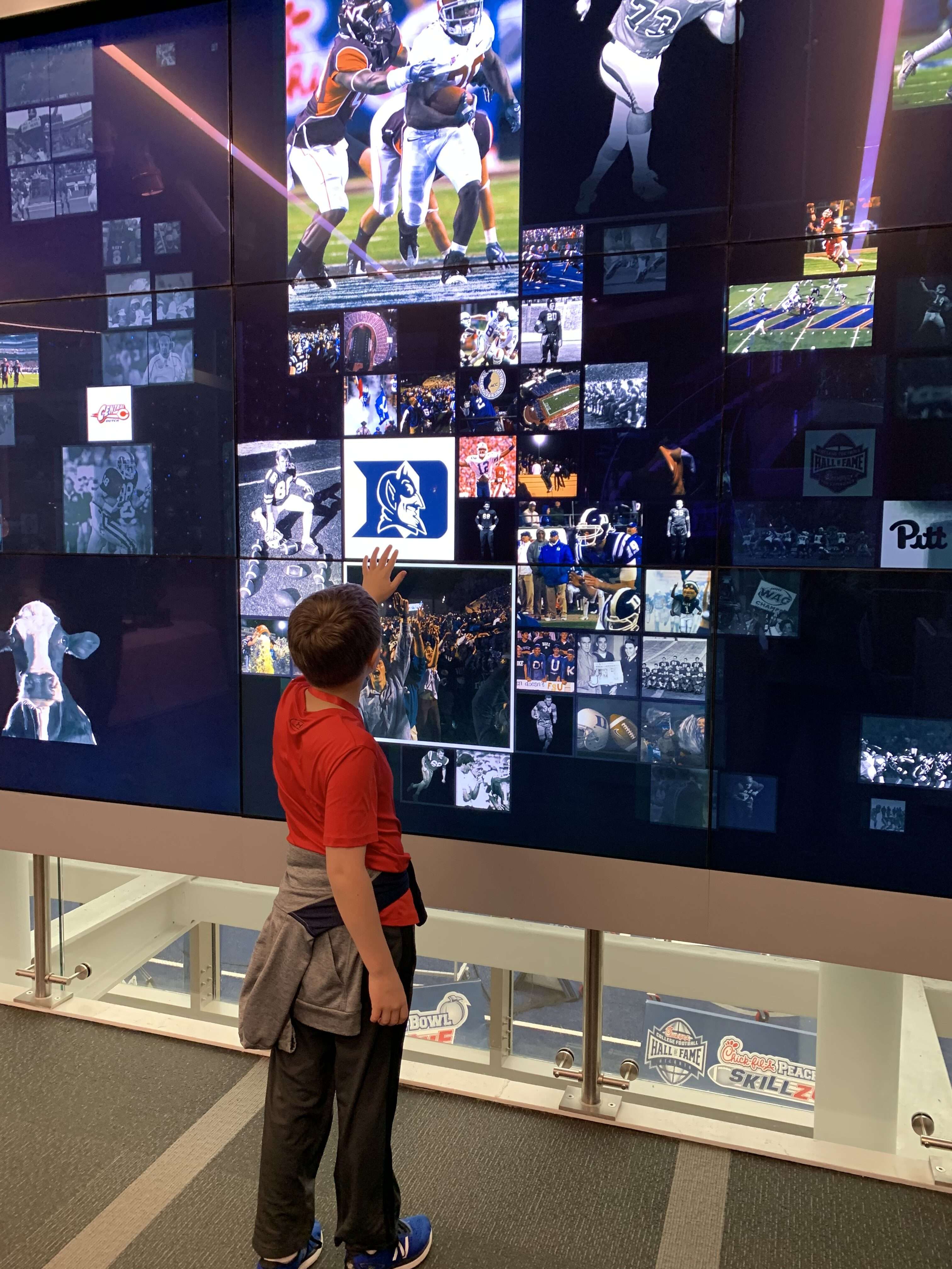 This personalization comes into play throughout the museum. There are multiple activities where you can scan your card for a personal interaction. The coolest use of this technology was definitely the huge touch-screen “Chick-Fil-A Why We Love College Football” exhibit. As you walk by, a Chick-Fil-A cow pops up on the screen, greets you by name and says “We got no beef with {your favorite team’s name}.” The boys went by again and again just to see him pop up.