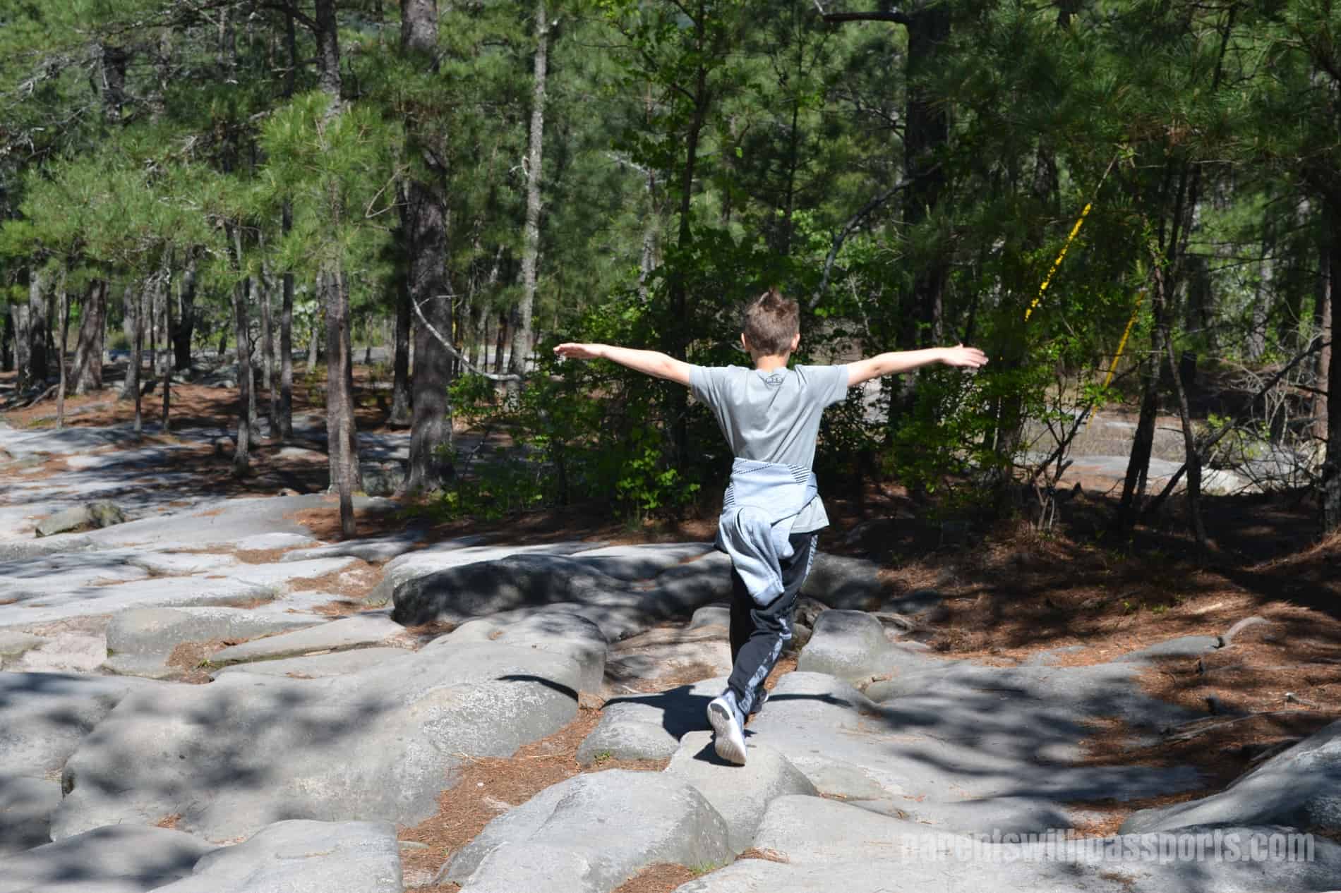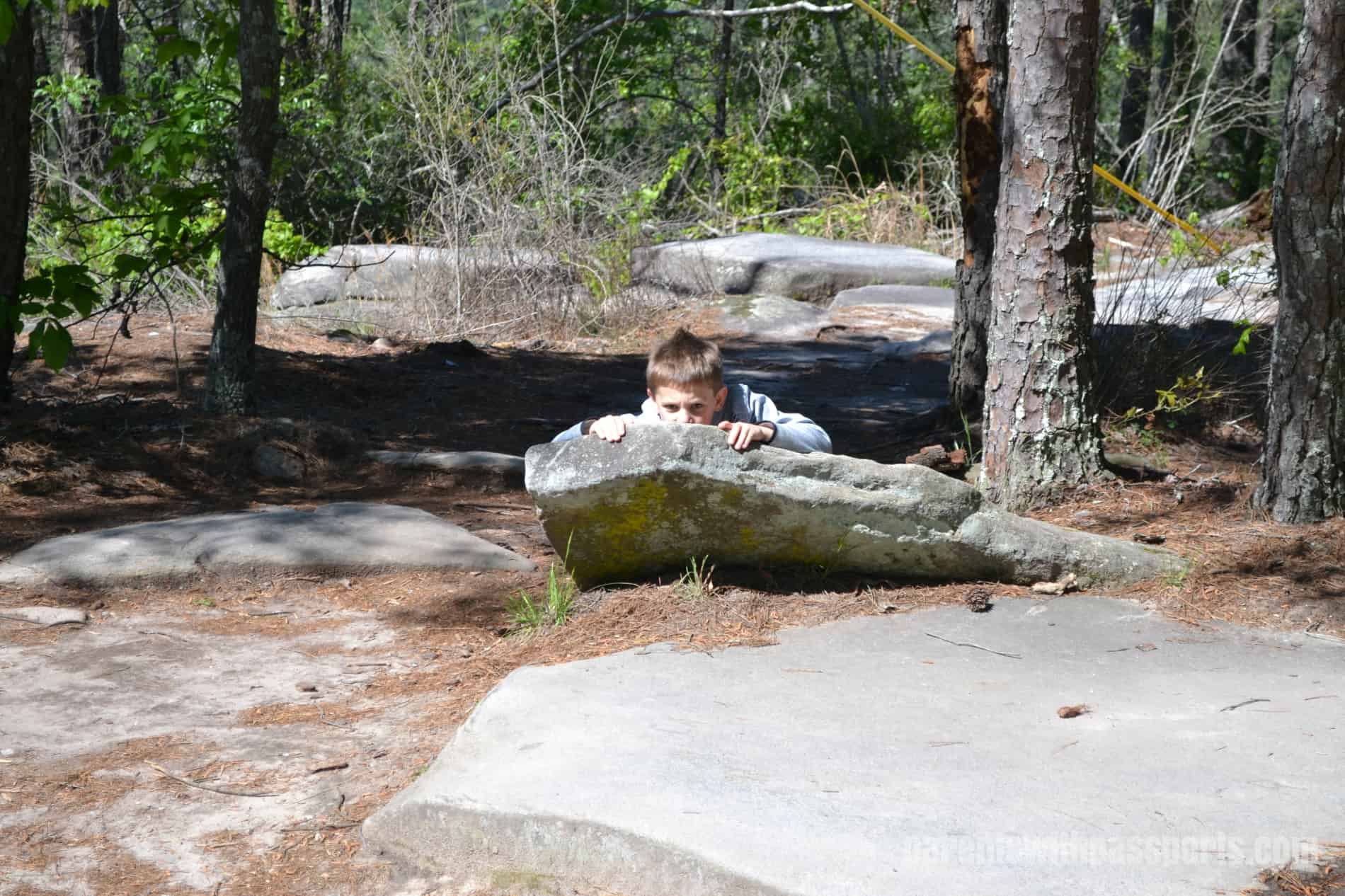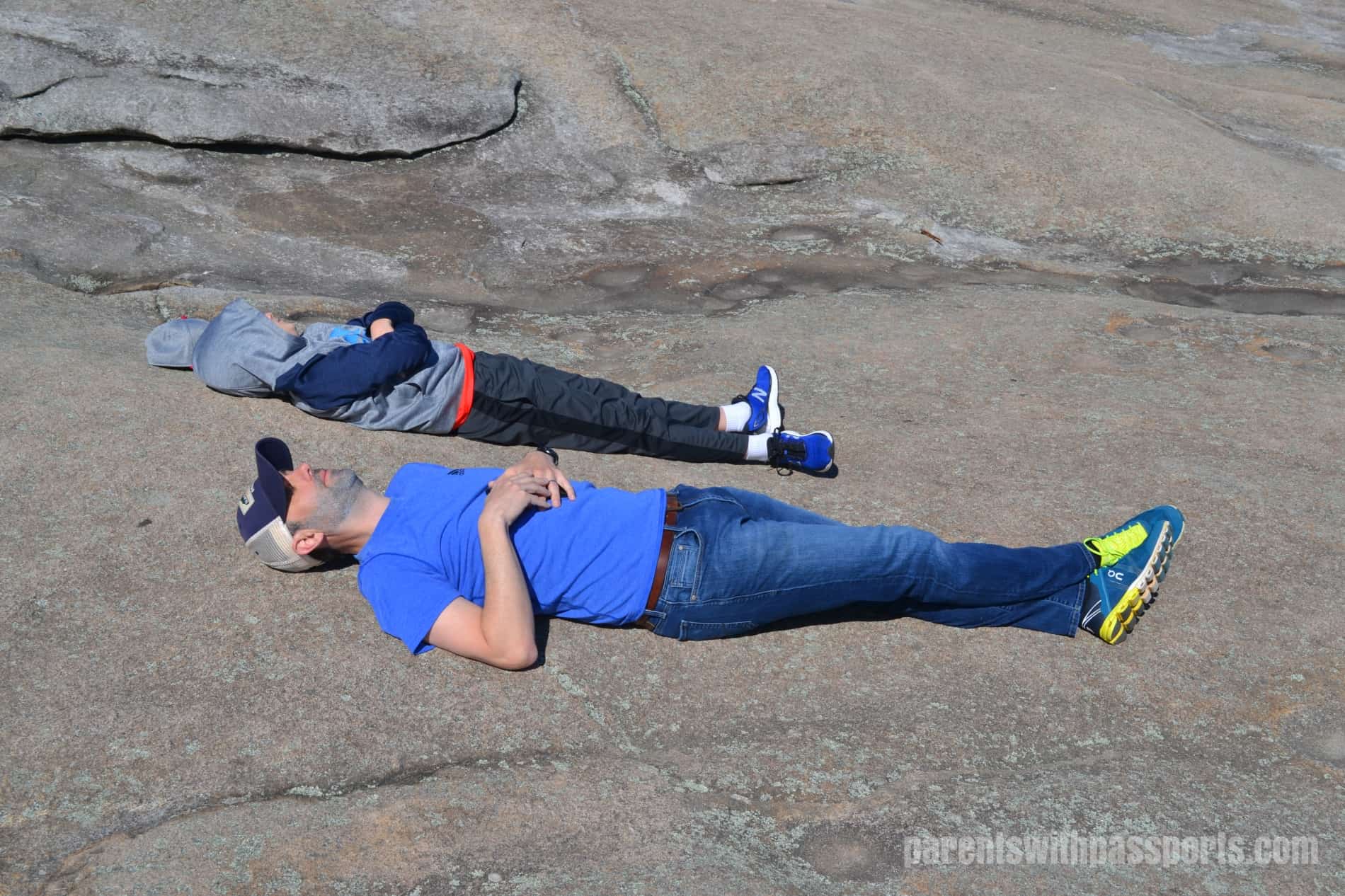 As we made our way down the mountain, it was painfully obvious that we were going straight down a different side of the mountain than the cable car had brought us up.  This brought considerable stress to my oldest son (clearly NOT the one playing and meditating in the pictures above).  After consulting the map several times, we did indeed confirm that we would come out approximately a mile away from where we parked.  When we were almost at the bottom, we hung a right to take a shortcut on the white blaze trail (Cherokee Trail) and followed parallel to the railroad tracks to head back to the parking lot.  (Alternately we could have continued to the base of the Walk Up trail, ending at Confederate Hall, and then followed the longer trail back to Skyride Plaza.  But we definitely had one hiker among us that was not in the mood for that.)
