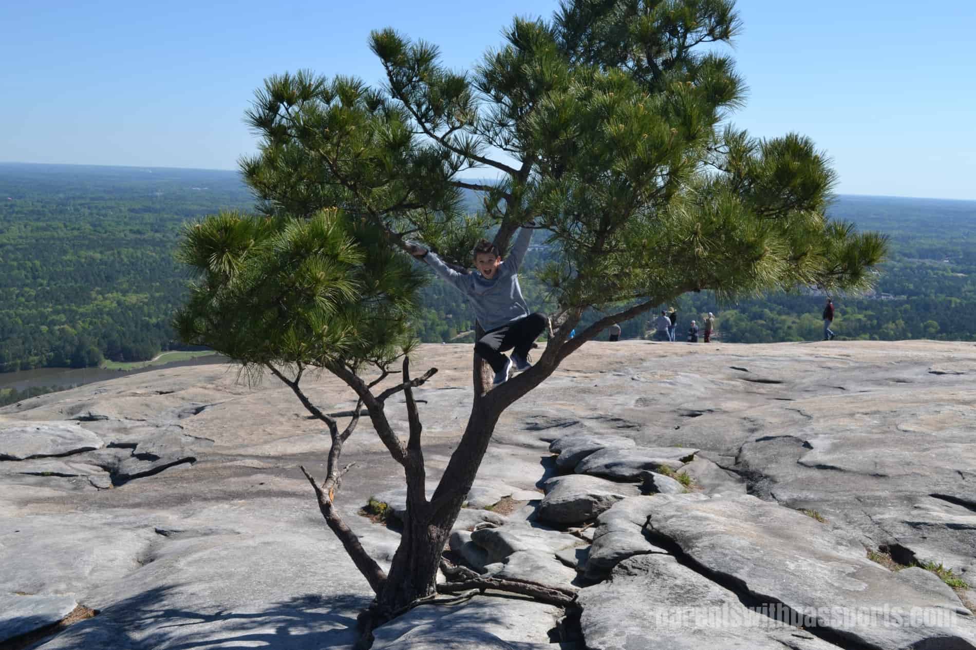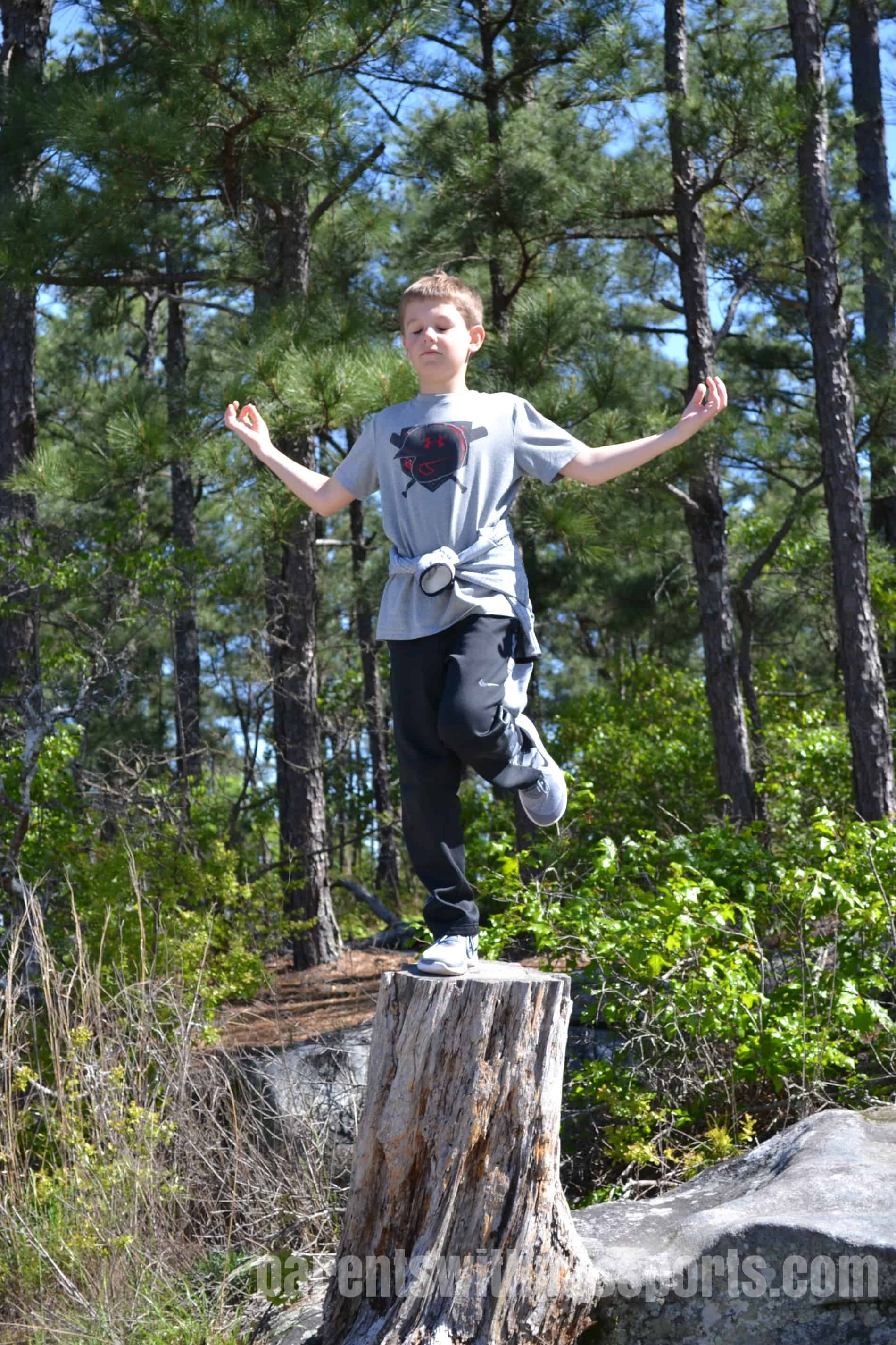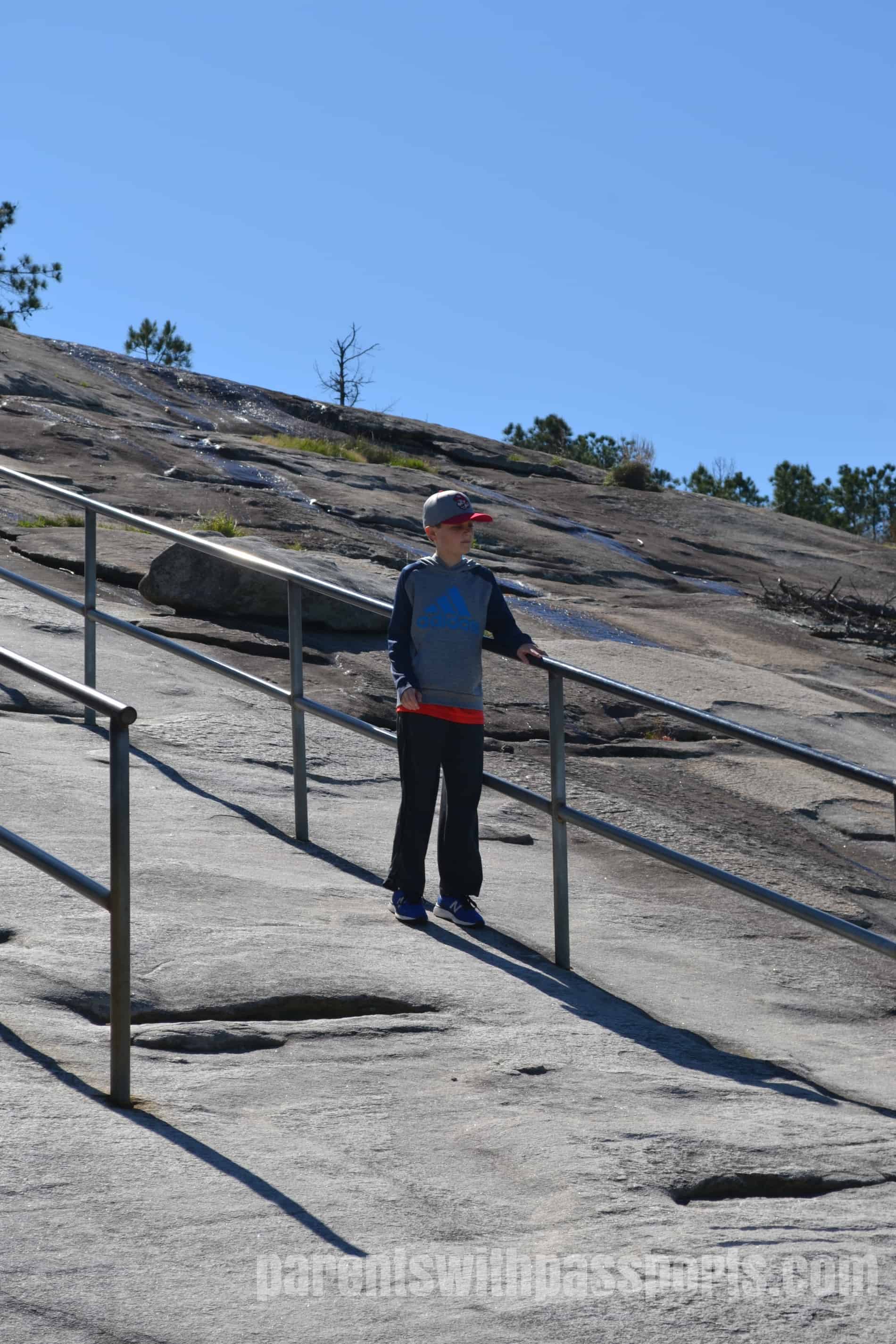 As we made our way down the mountain, it was painfully obvious that we were going straight down a different side of the mountain than the cable car had brought us up.  This brought considerable stress to my oldest son (clearly NOT the one playing and meditating in the pictures above).  After consulting the map several times, we did indeed confirm that we would come out approximately a mile away from where we parked.  When we were almost at the bottom, we hung a right to take a shortcut on the white blaze trail (Cherokee Trail) and followed parallel to the railroad tracks to head back to the parking lot.  (Alternately we could have continued to the base of the Walk Up trail, ending at Confederate Hall, and then followed the longer trail back to Skyride Plaza.  But we definitely had one hiker among us that was not in the mood for that.)