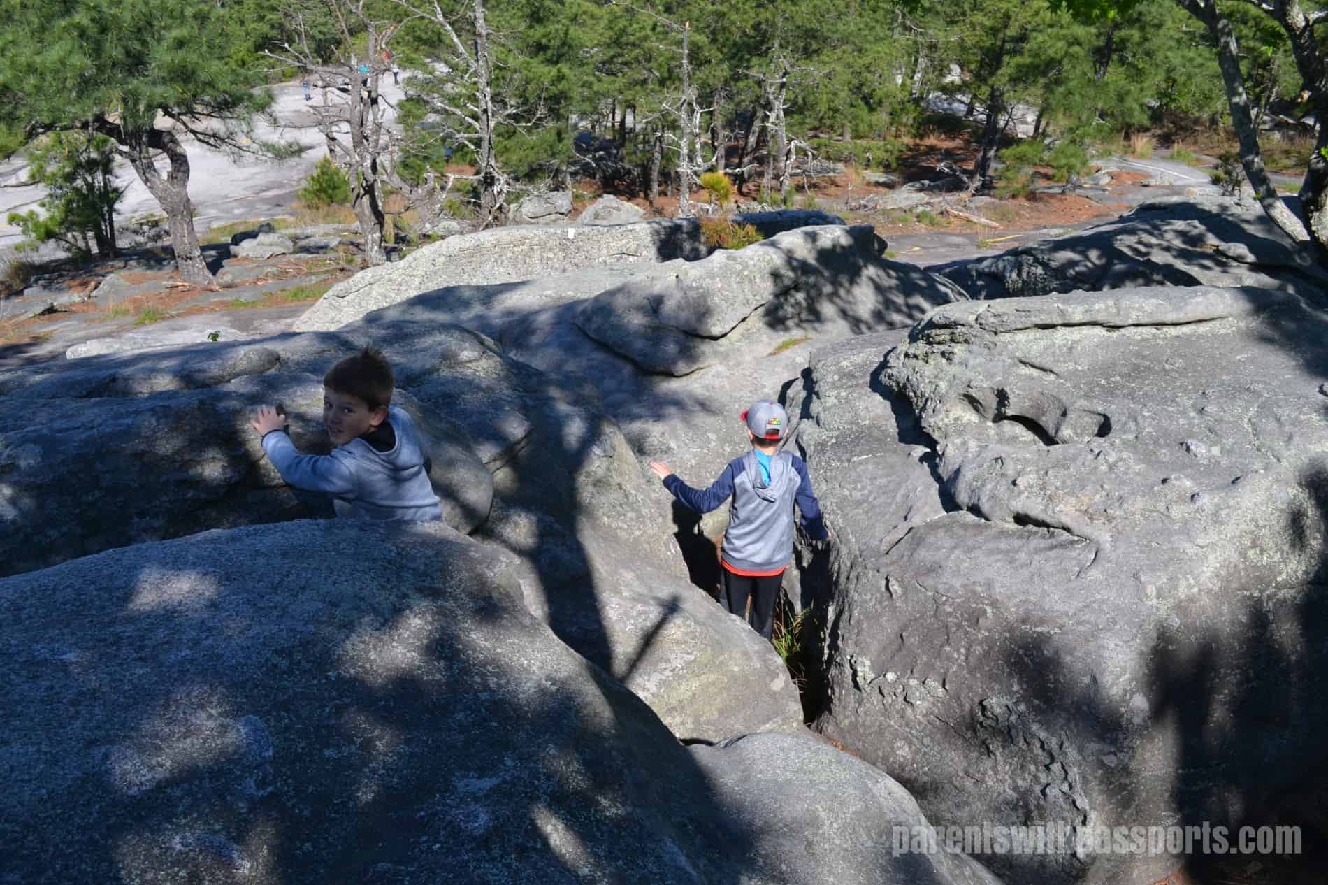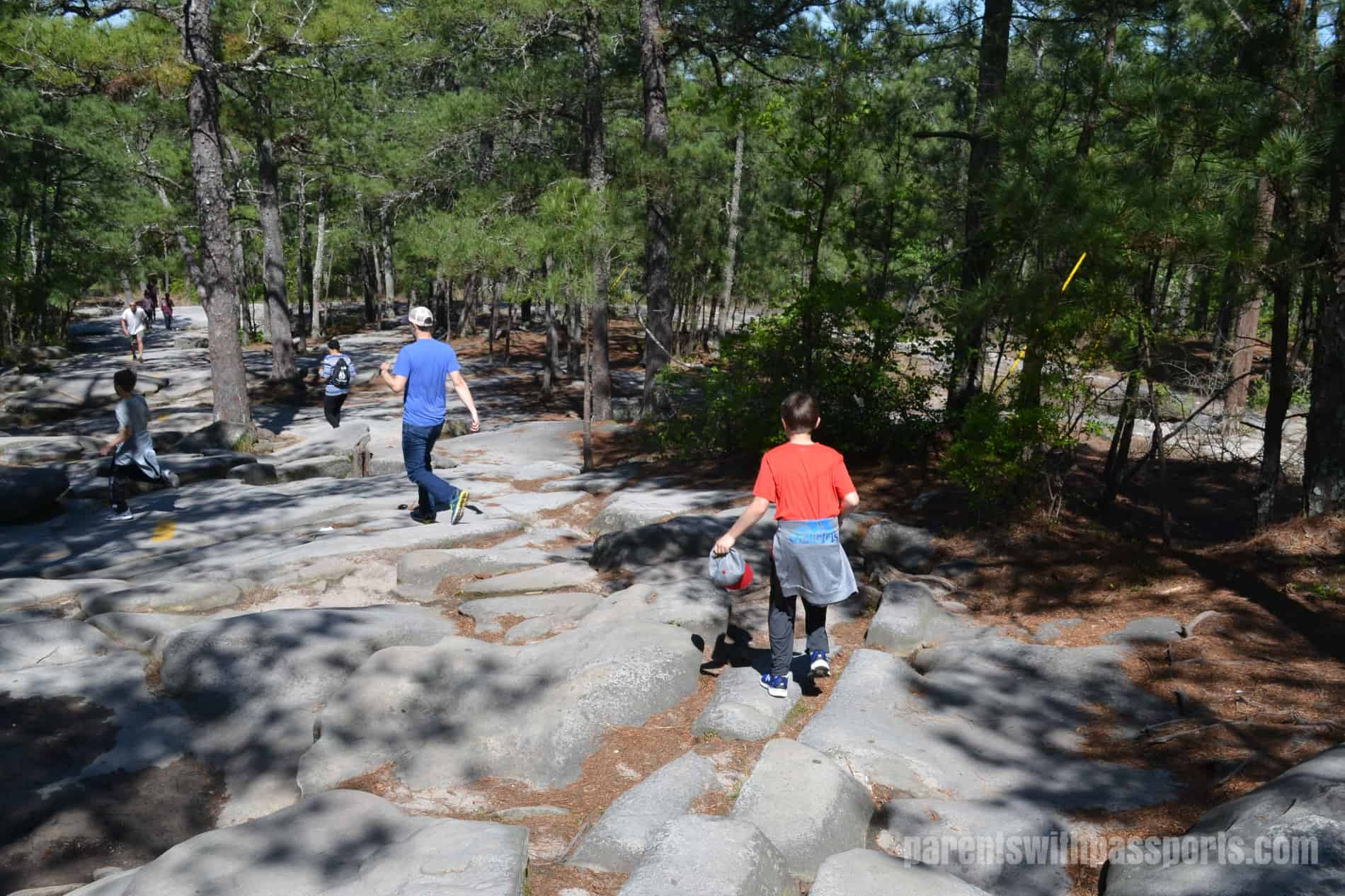 The trail up/down the mountain is approximately 1 mile long.  It’s steeper and rockier towards the top and becomes more lush and rolling as you go down.  There were plenty of fun places for the kids to play and explore just off the path.