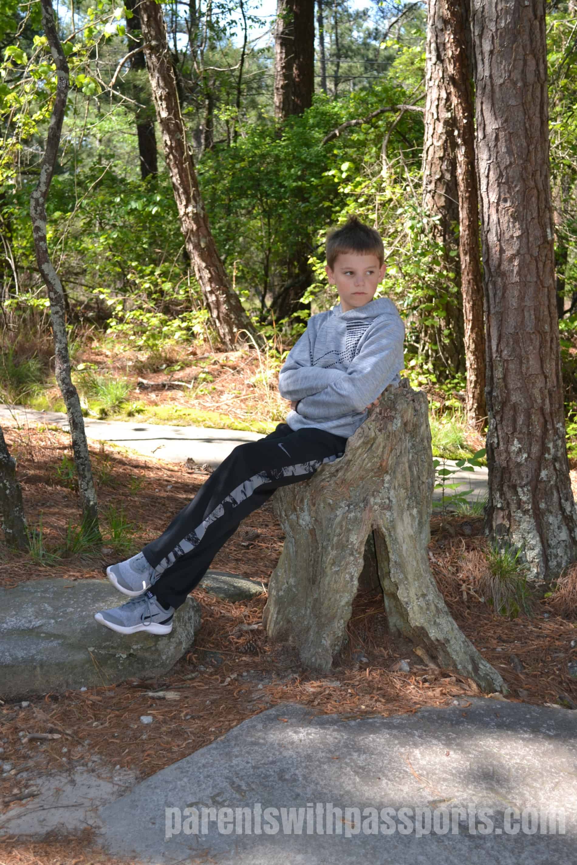 As we made our way down the mountain, it was painfully obvious that we were going straight down a different side of the mountain than the cable car had brought us up. This brought considerable stress to my oldest son (clearly NOT the one playing and meditating in the pictures above). After consulting the map several times, we did indeed confirm that we would come out approximately a mile away from where we parked. When we were almost at the bottom, we hung a right to take a shortcut on the white blaze trail (Cherokee Trail) and followed parallel to the railroad tracks to head back to the parking lot. (Alternately we could have continued to the base of the Walk Up trail, ending at Confederate Hall, and then followed the longer trail back to Skyride Plaza. But we definitely had one hiker among us that was not in the mood for that.)