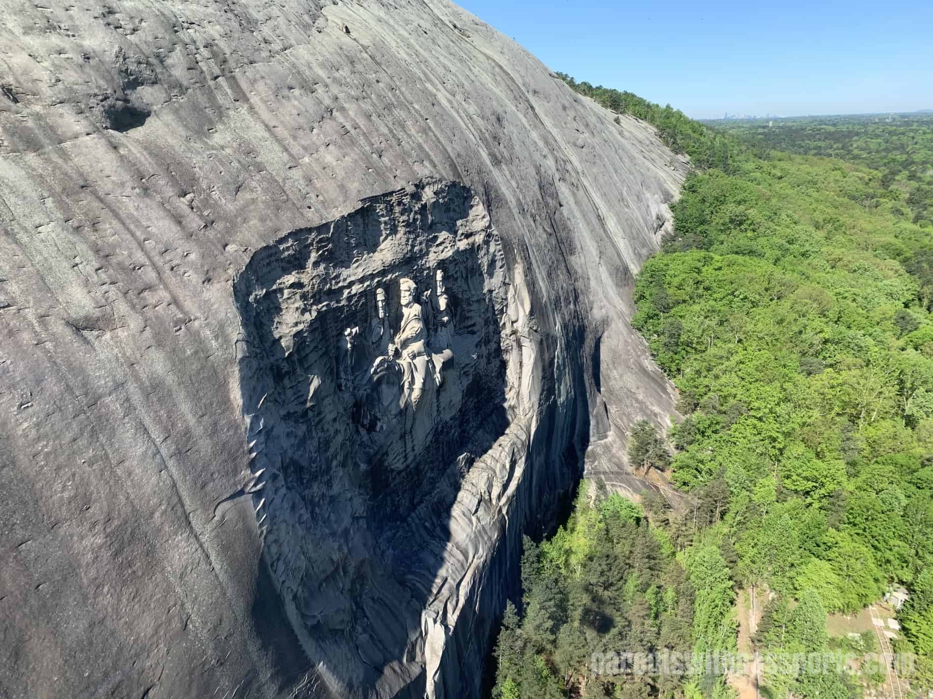 All in all Stone Mountain was a worthwhile stop.  The tram was fun, the views incredible, and the hike down unique.  The Confederate stone carving is worth seeing.  Regardless of the content, you can appreciate the effort that went into the carving and marvel at the result.  It is a little mind-boggling to think about how this was accomplished – a monument of this size (90 feet by 190 feet) and detail carved 42 feet deep into a side of a mountain 400 feet above ground.