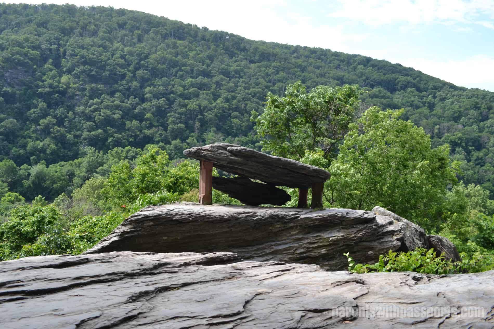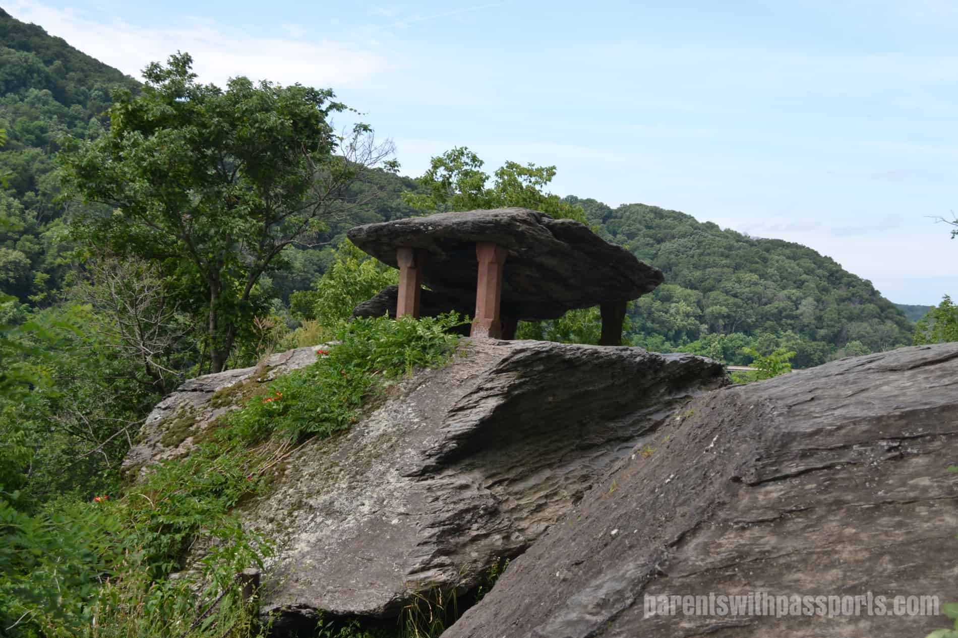 Just a bit further up the hill, Jefferson’s Rock comes into sight. The rock itself is made of multiple layers of shale stacked on top of each other. Over the years, the natural support of the uppermost rock began to weaken and four stone pillars were placed underneath it in the late 1850s to preserve this natural attraction. Despite the pillars, the rock is still unstable and climbing on it is not allowed.