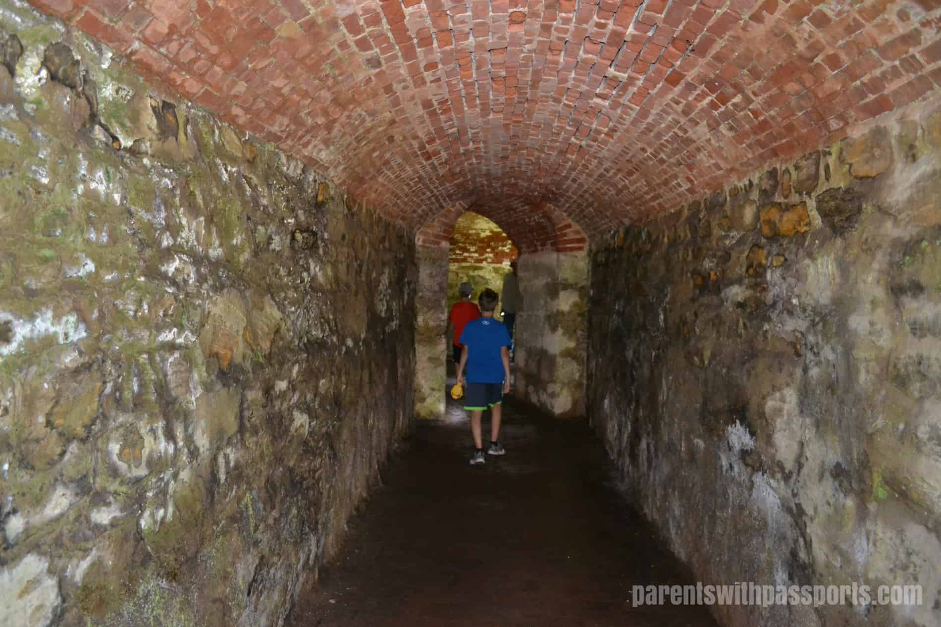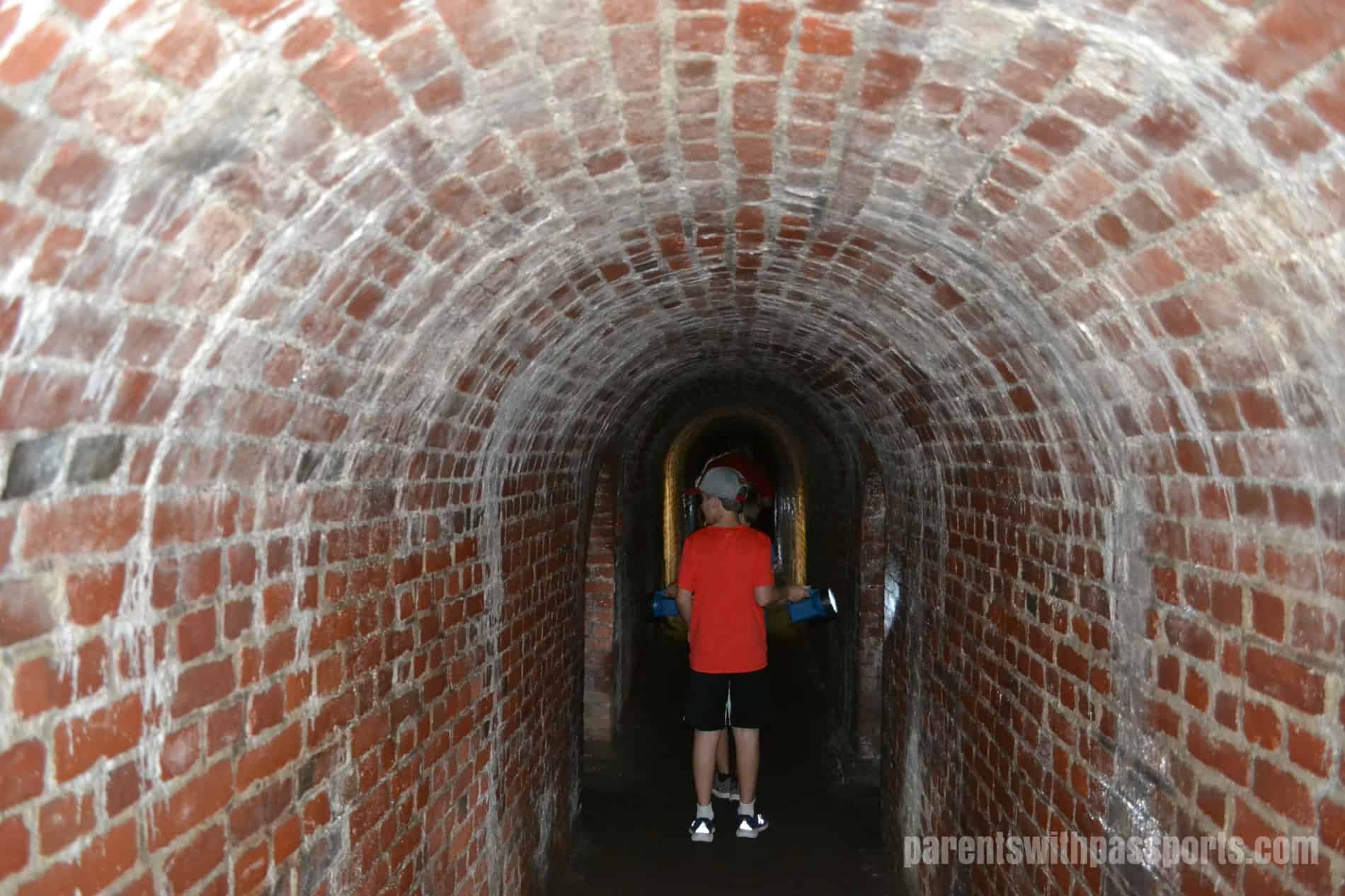 While cannons, crumbling buildings, and gorgeous views do interest the boys, their absolute favorite part of the tour was going into the fort’s tunnels. The fort was designed to protect against both sea and land attacks.  Part of the land defense was “listening tunnels”.  Anticipating that an enemy’s best mode of attack would be to tunnel into the fort, listening tunnels were created to hear the enemies coming, dig towards them, and blow them up before they got anywhere near the actual fort.