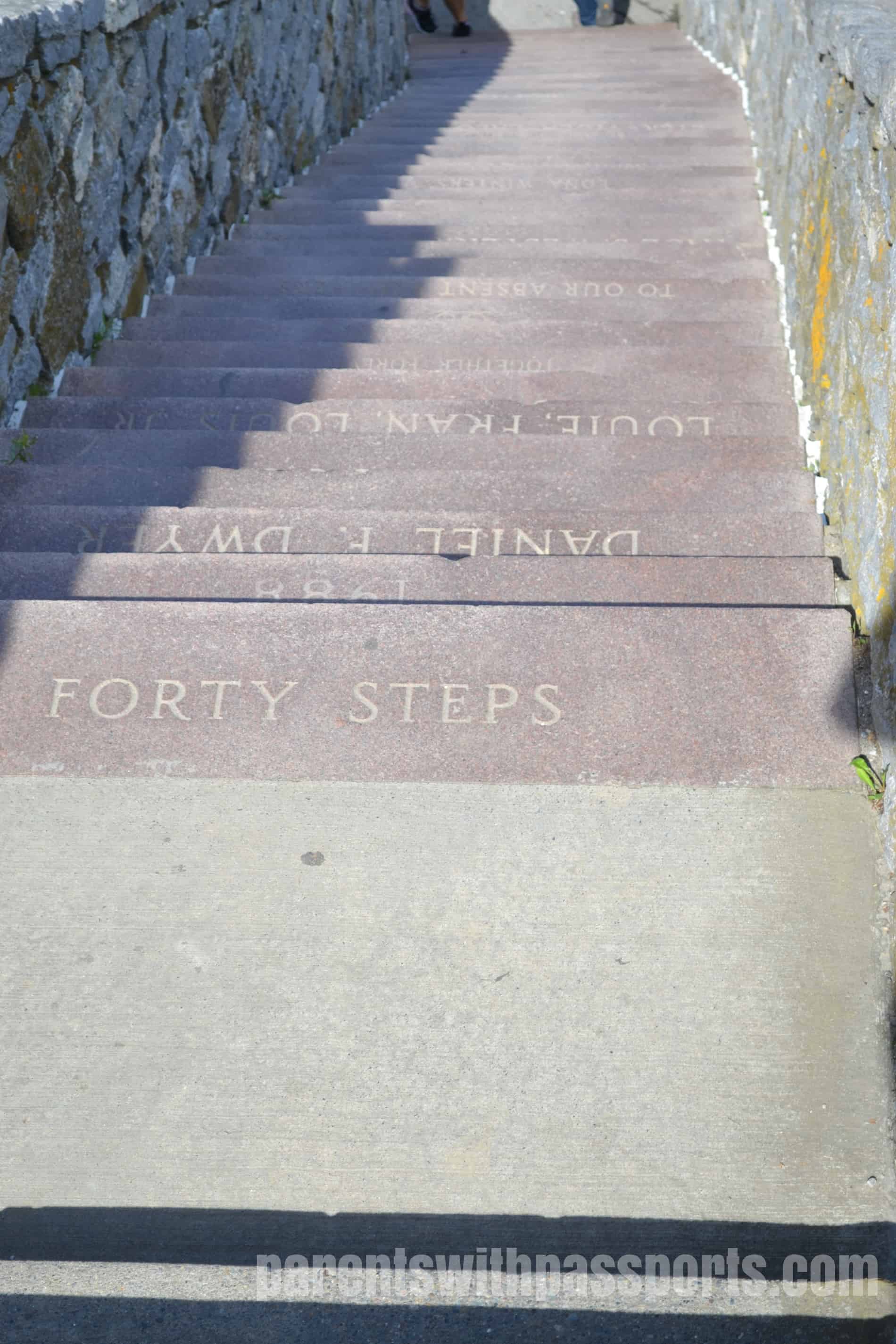 For both my visits to the Cliff Walk, we entered at Ruggles Avenue after leaving the Breakers.  With my friends, we turned right to head south.  With my family, we turned left to go north.  Heading north from the Breakers will bring you to the Forty Steps, a stone staircase that takes you closer to the ocean.  Built in the early 1800s, the Forty Steps was originally used as a recreation spot for servants from the nearby mansions.  The steps were restored in the early 1990s and are now a popular stop along the Cliff Walk.