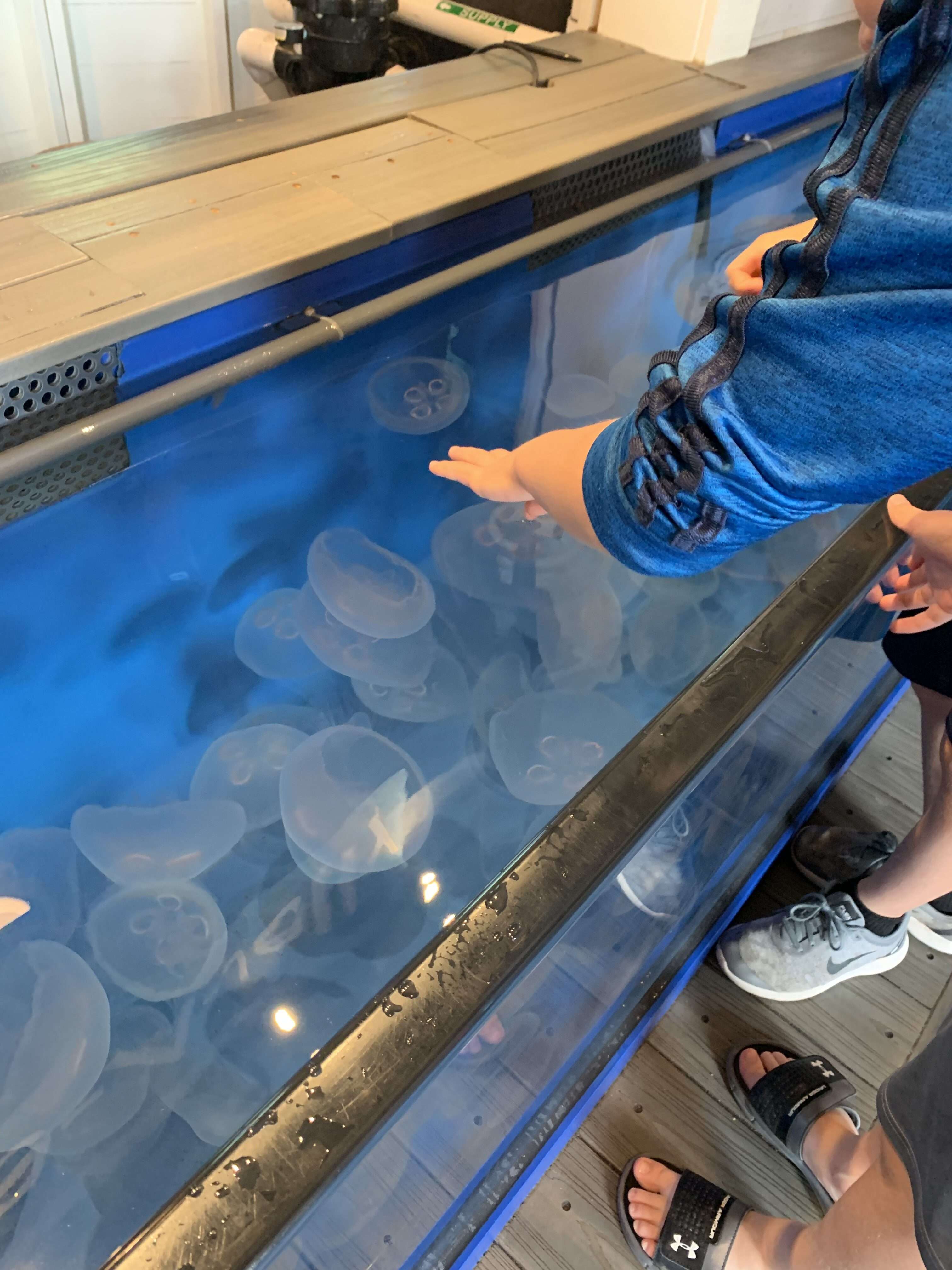 Next up was the jelly fish touch tank, playfully called “Jiggle a Jelly.” Yes, you read that right. You can touch the jellyfish. Since the stinging cells of moon jellyfish hang from tentacles below their bodies, you can touch them on top of their bodies. Despite reassurances from the staff member manning the tank, the boys were tentative, but they did muster up the courage to touch them.
