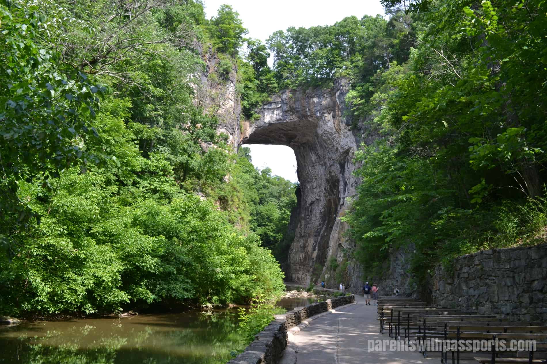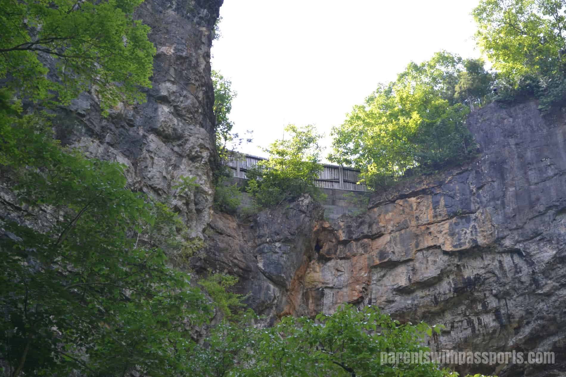 The top of the bridge is believed to be the roof of an old cave system. It was formed hundreds of thousands of years ago when the flowing water of Cedar Creek formed an underground channel through the cave and washed away the limestone, creating an opening 215 feet tall and 90 feet wide.