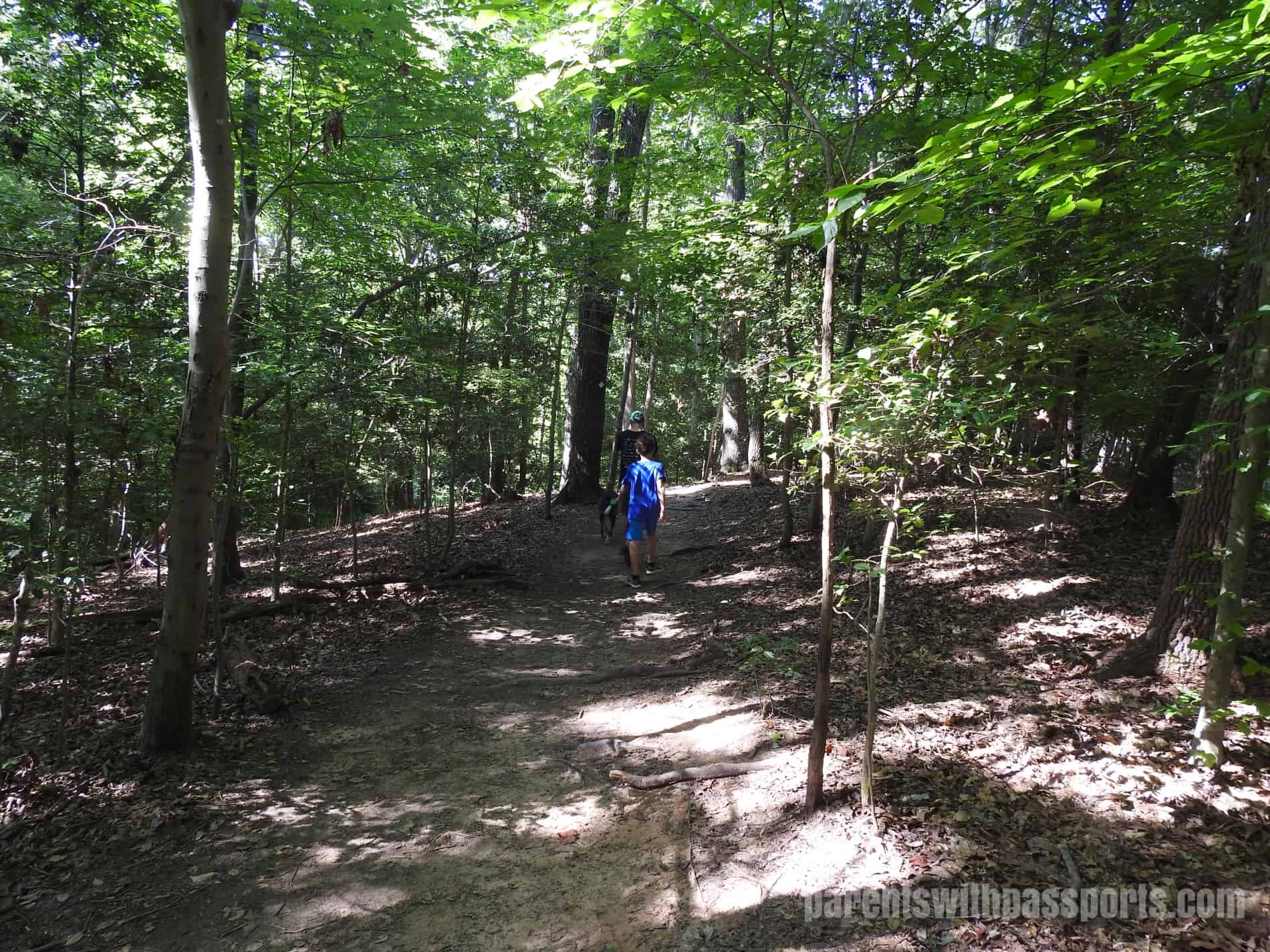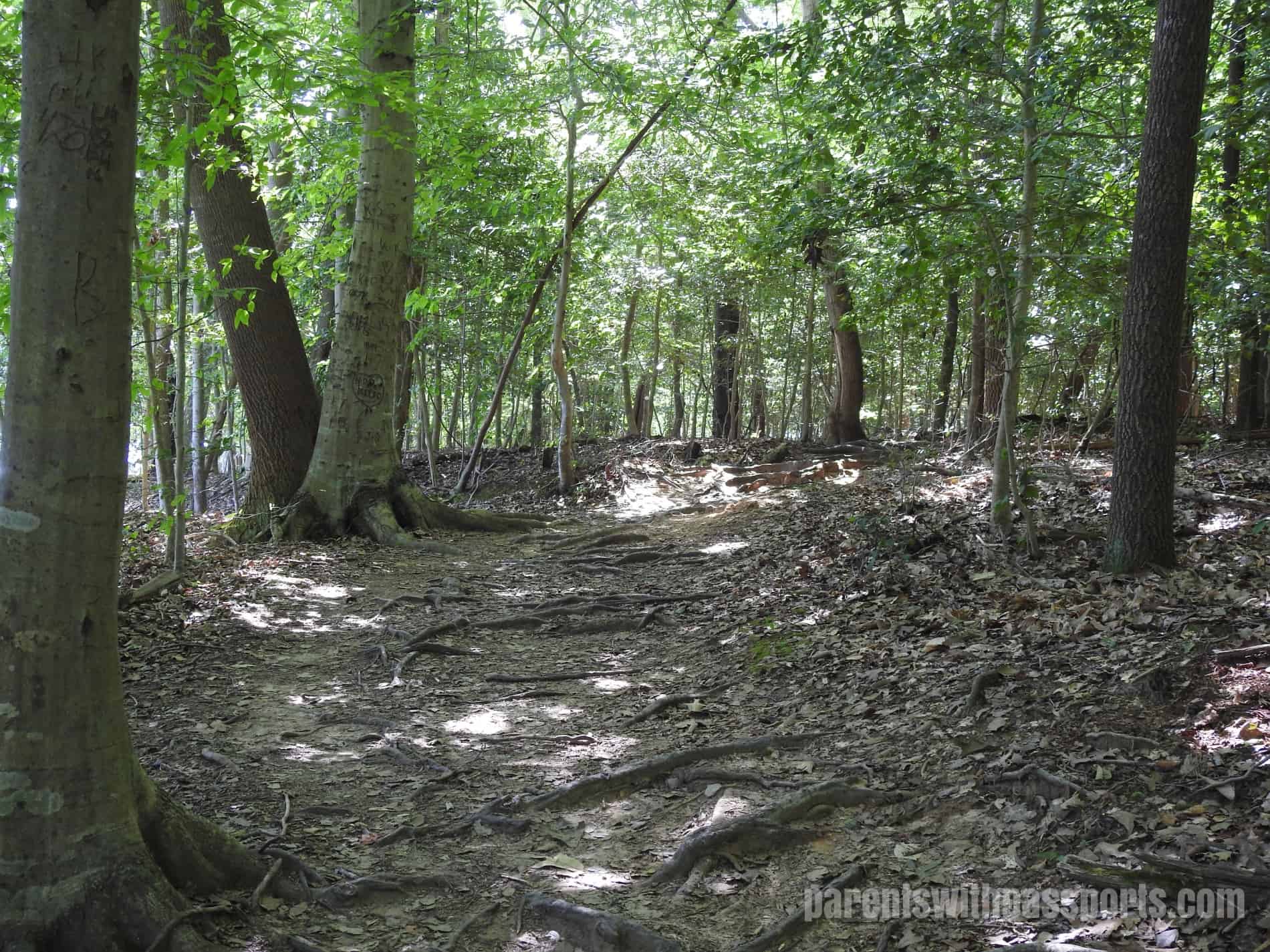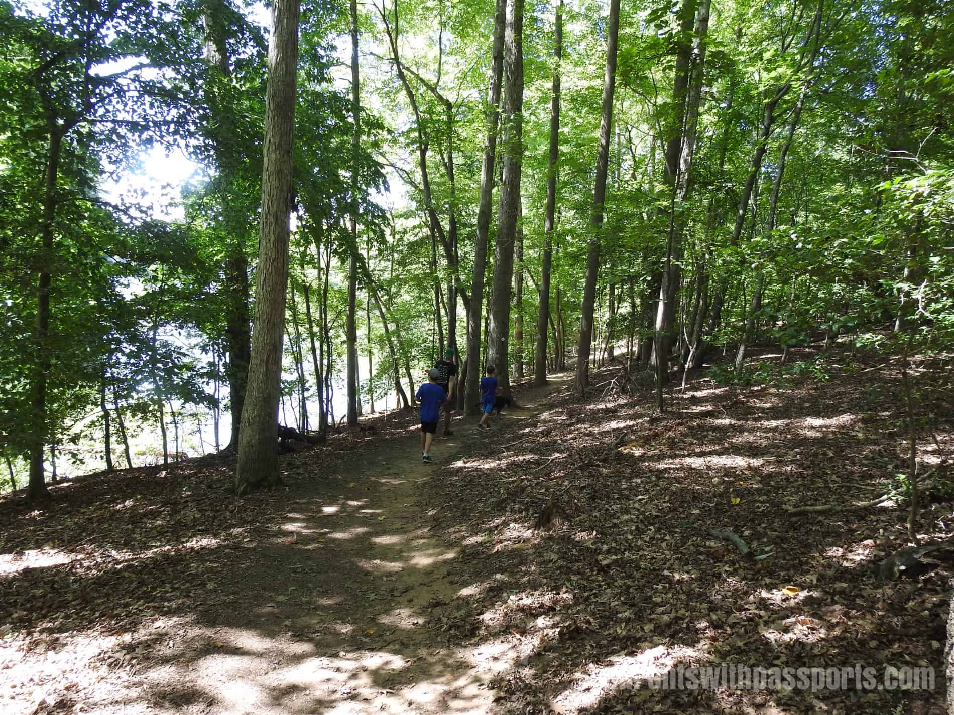 The trail is wooded and shady for almost the entire time.  It hugs the shoreline for the large majority of the trail, but it does venture a little bit inland at times.  The path surface is all natural and there were a fair number of tree roots in spots so you have to be aware of your footing.  There are also a few surprisingly steep hills for a generally flat area.