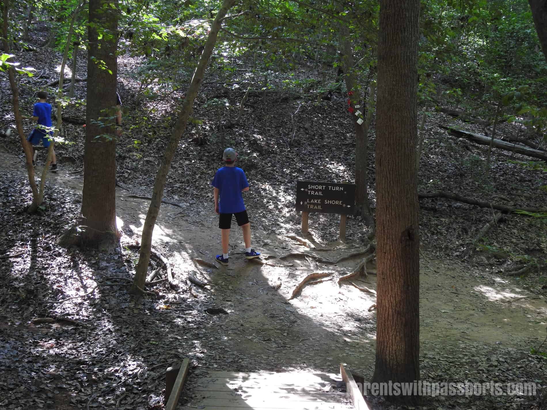 We decided on the Lake Shore Trail which – you guessed it – follows along the shoreline of the lake.  It is rated as moderate and has two options – the full loop is 6.2 miles but you can take the shortcut for a 3 mile hike.  Follow the white blazes for the longer loop and the red blazes for the shorter one.  It was a super hot July day so we opted for the shorter hike.