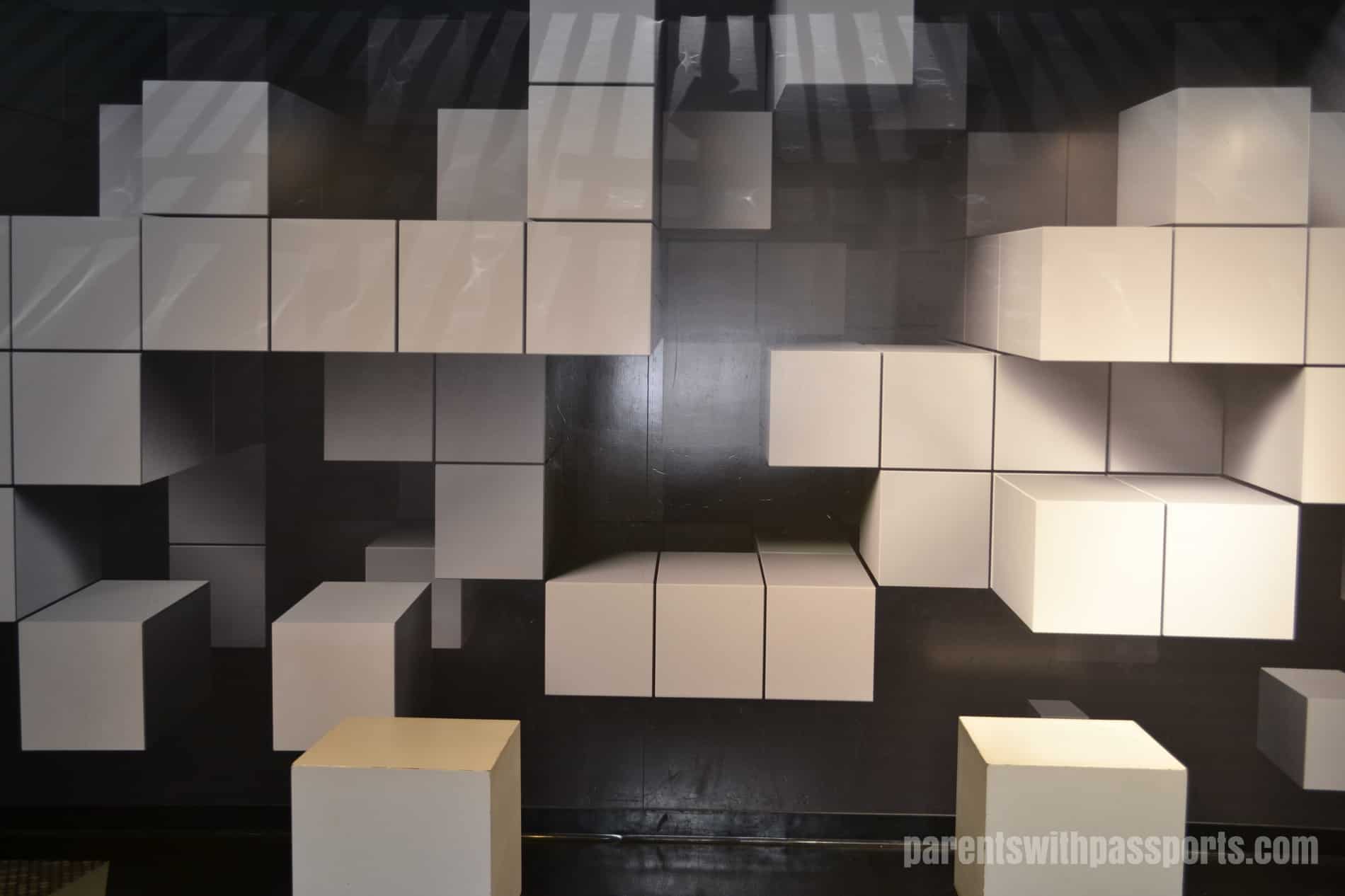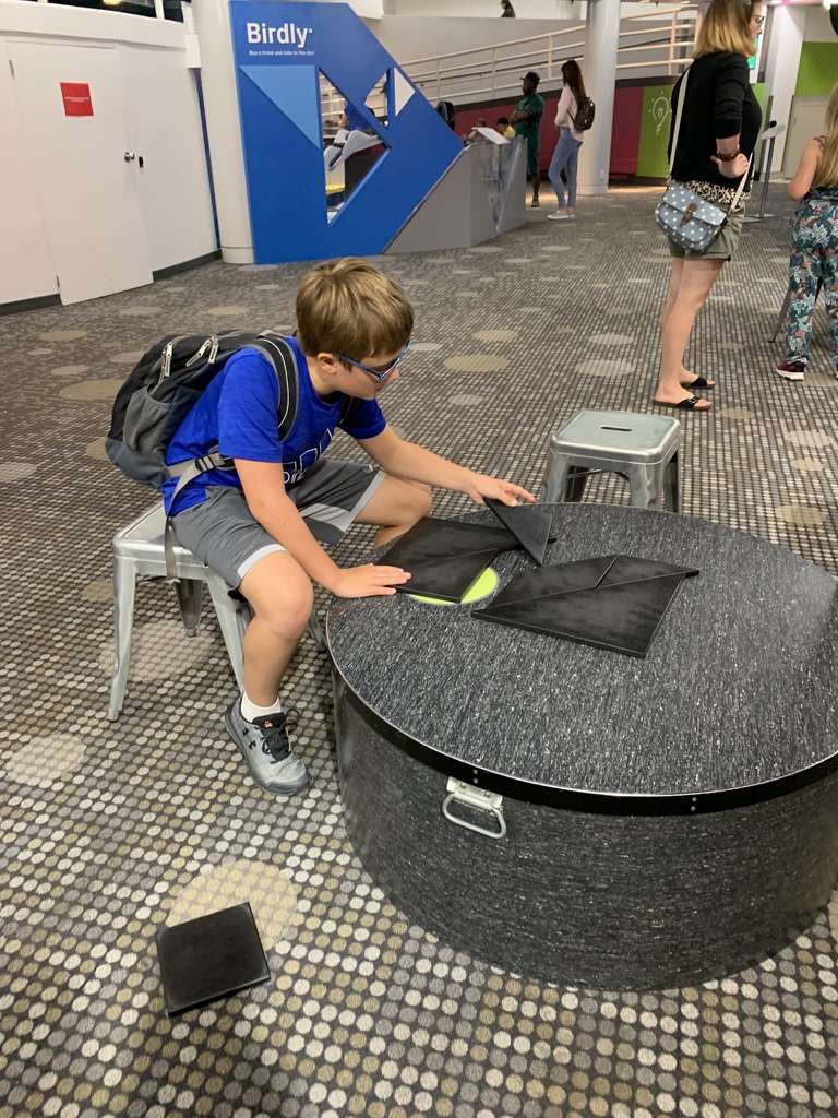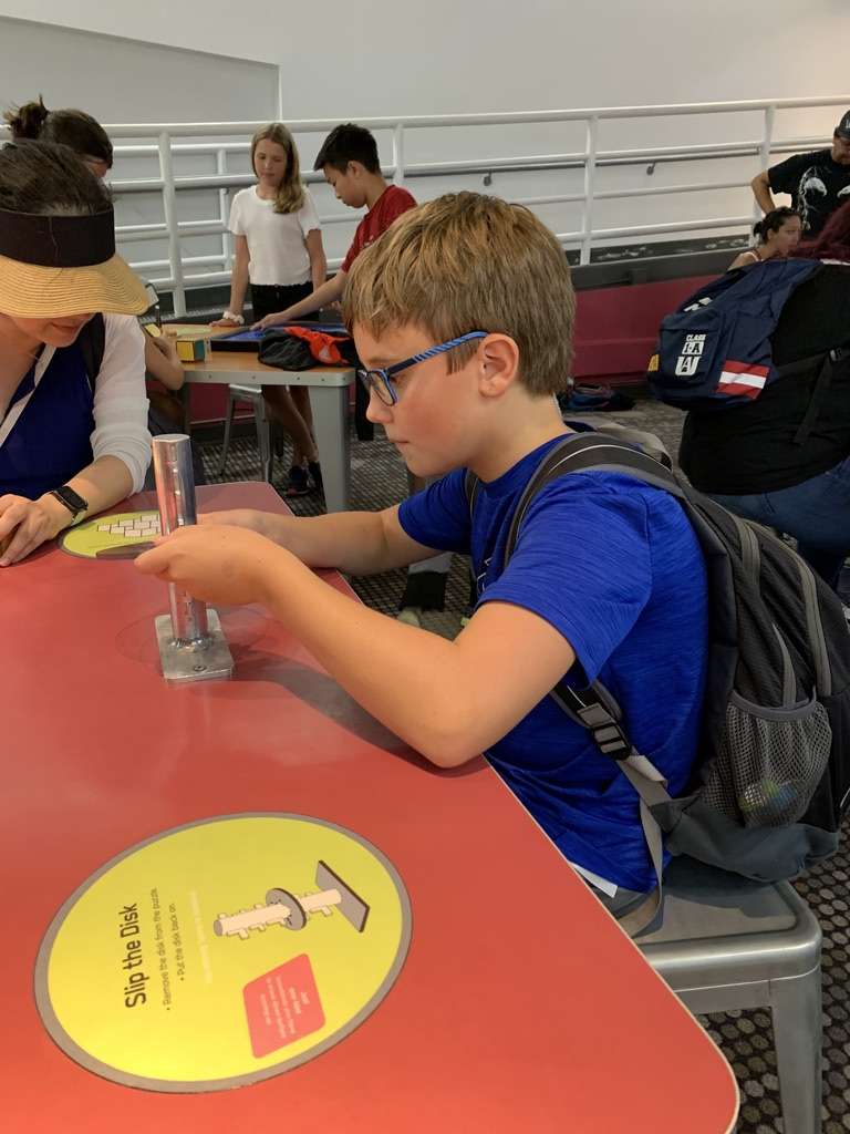 From here we moved to the main circular area in the dome of the museum. There were lots of exhibits on the upper level but we didn’t make it past the one exhibit on the lower level called Puzzles and Illusions. The lower level of this section of the museum is mainly the dining area, restrooms, and a stage for demonstrations with just this one exhibit, but clearly this one exhibit was all my kids needed. They spent about 45 minutes in here (and would have stayed longer if it hadn’t been lunch time), staring at mind-bending illusions and trying their hands at the many puzzles laid out on tables.