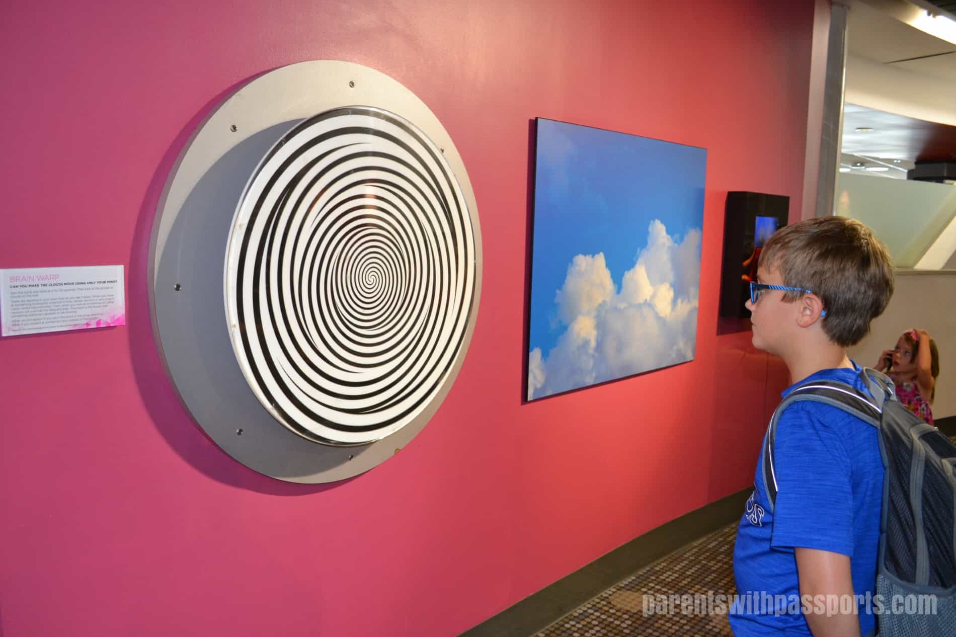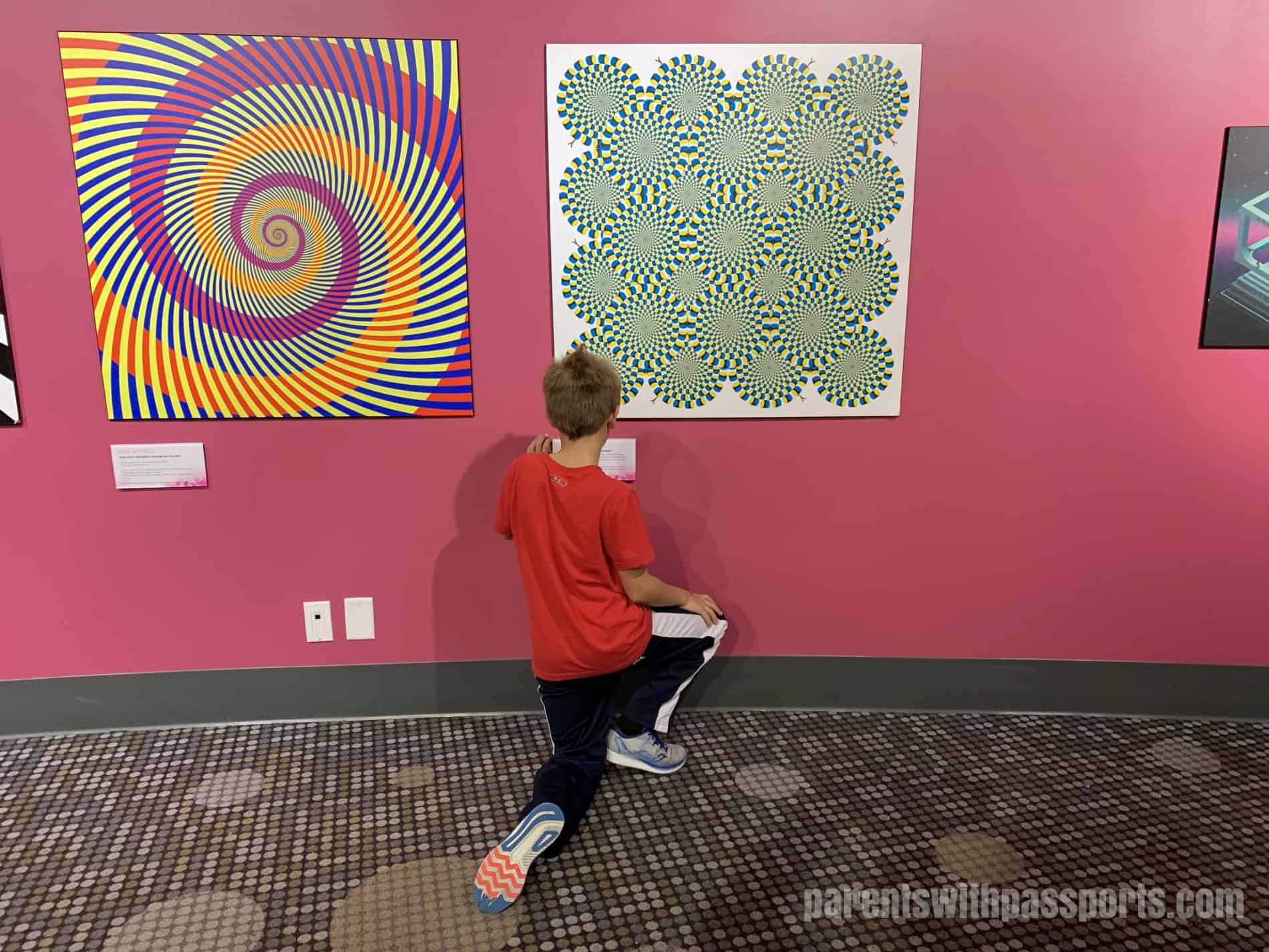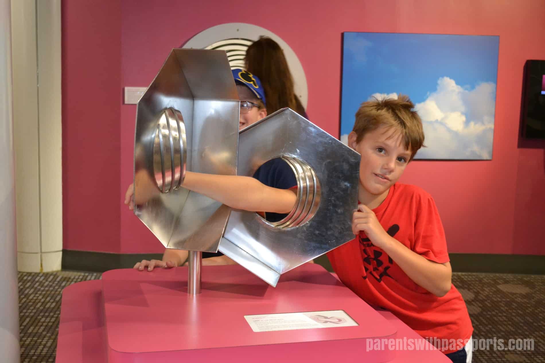 From here we moved to the main circular area in the dome of the museum. There were lots of exhibits on the upper level but we didn’t make it past the one exhibit on the lower level called Puzzles and Illusions. The lower level of this section of the museum is mainly the dining area, restrooms, and a stage for demonstrations with just this one exhibit, but clearly this one exhibit was all my kids needed. They spent about 45 minutes in here (and would have stayed longer if it hadn’t been lunch time), staring at mind-bending illusions and trying their hands at the many puzzles laid out on tables.