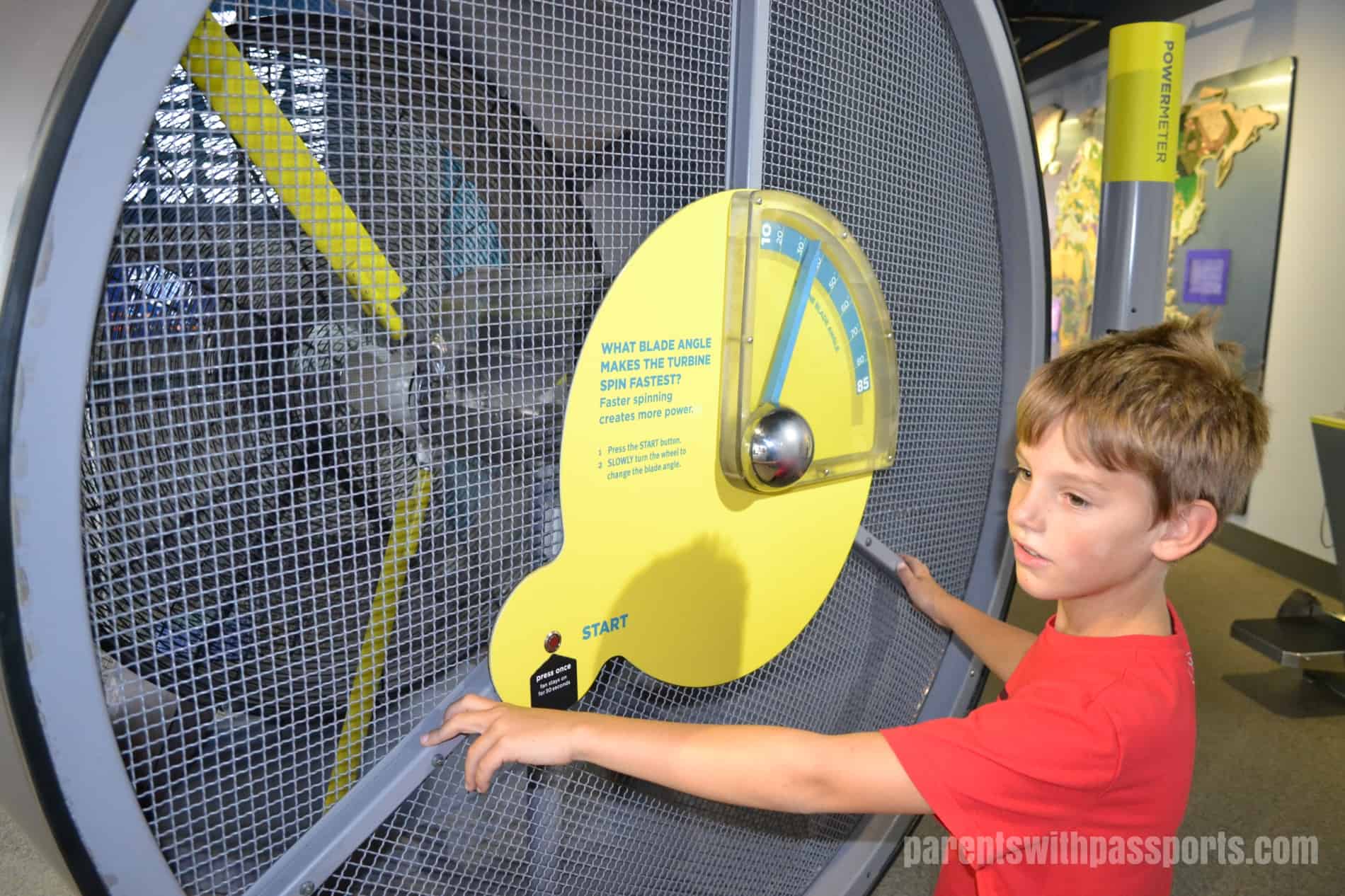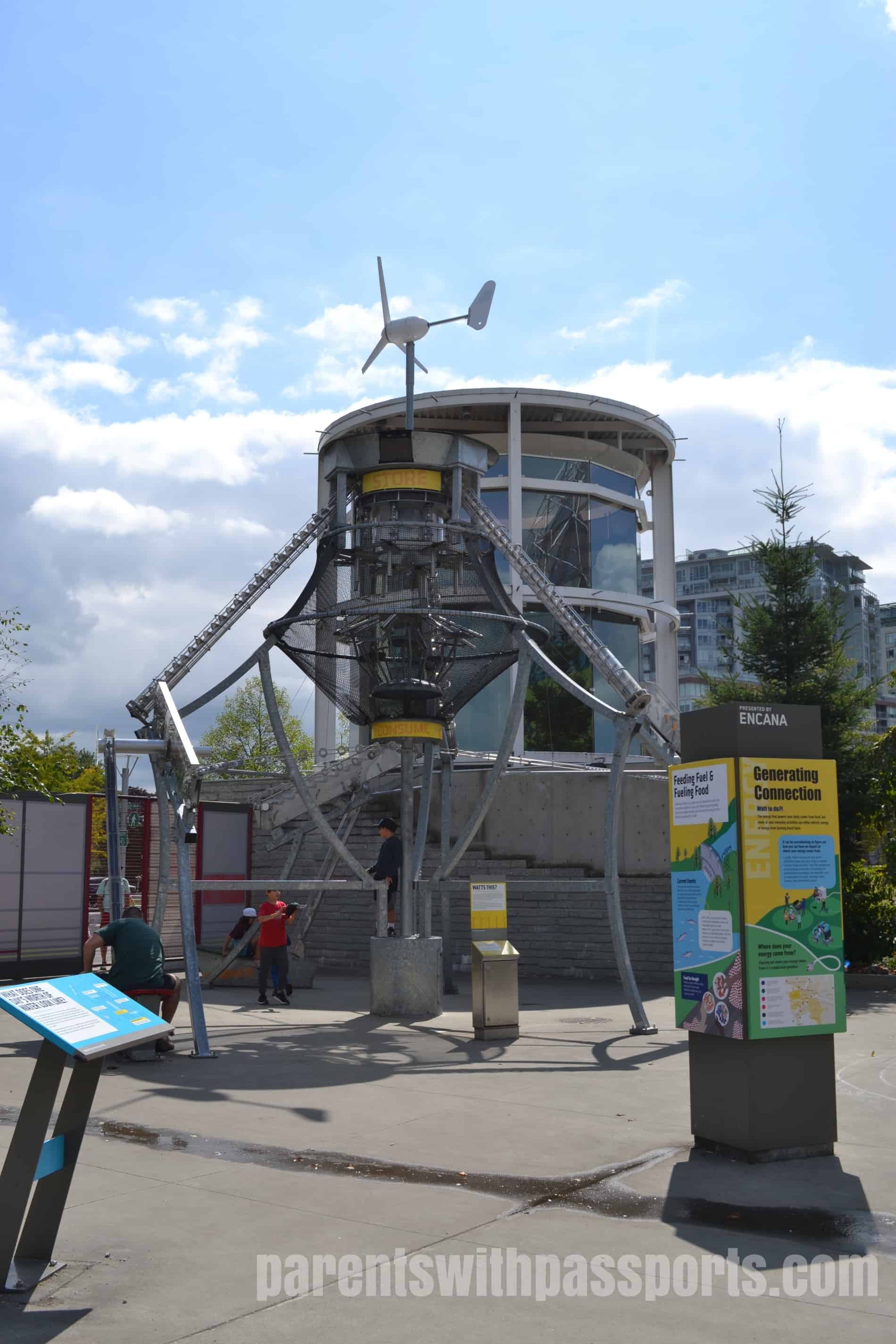 We went inside only long enough to buy our tickets and then the kids all immediately ran to the outdoor exhibits. There were some great exhibits out there and the kids spent about half an hour playing and exploring – and then returned for more later in the day. This area, known as the Ken Spencer Science Park, focuses on sustainability. The different exhibits use hands-on activities to educate visitors about the 6 themes of sustainability: energy, food, housing, transportation, waste, and water.