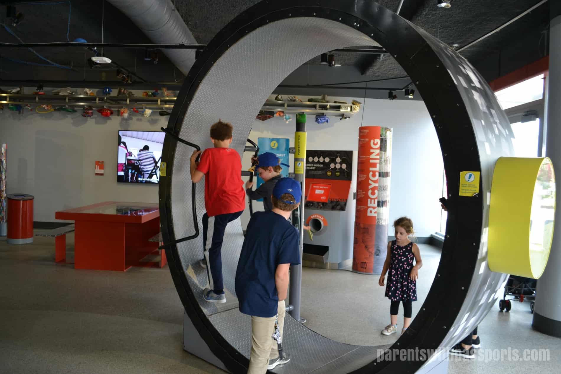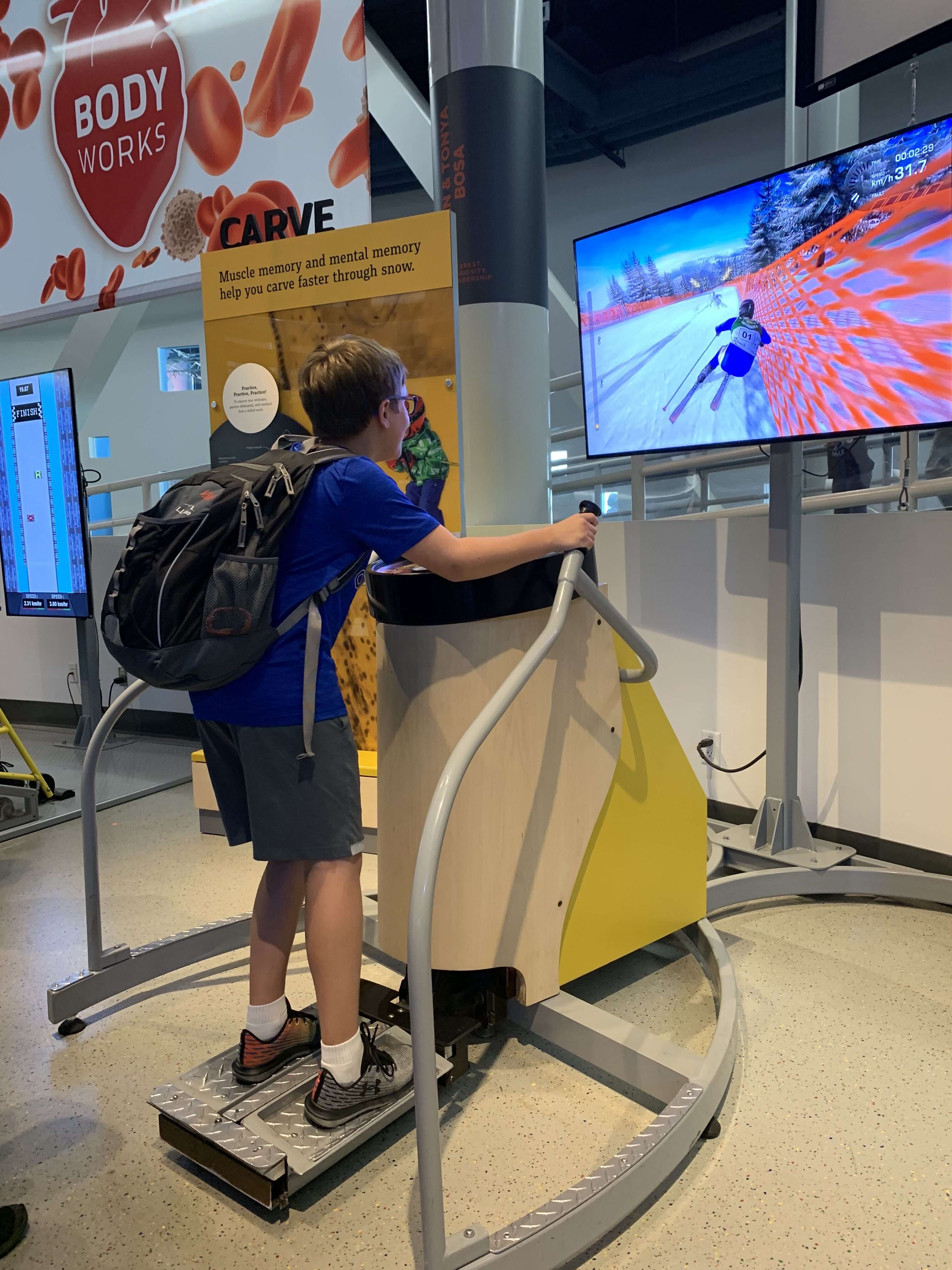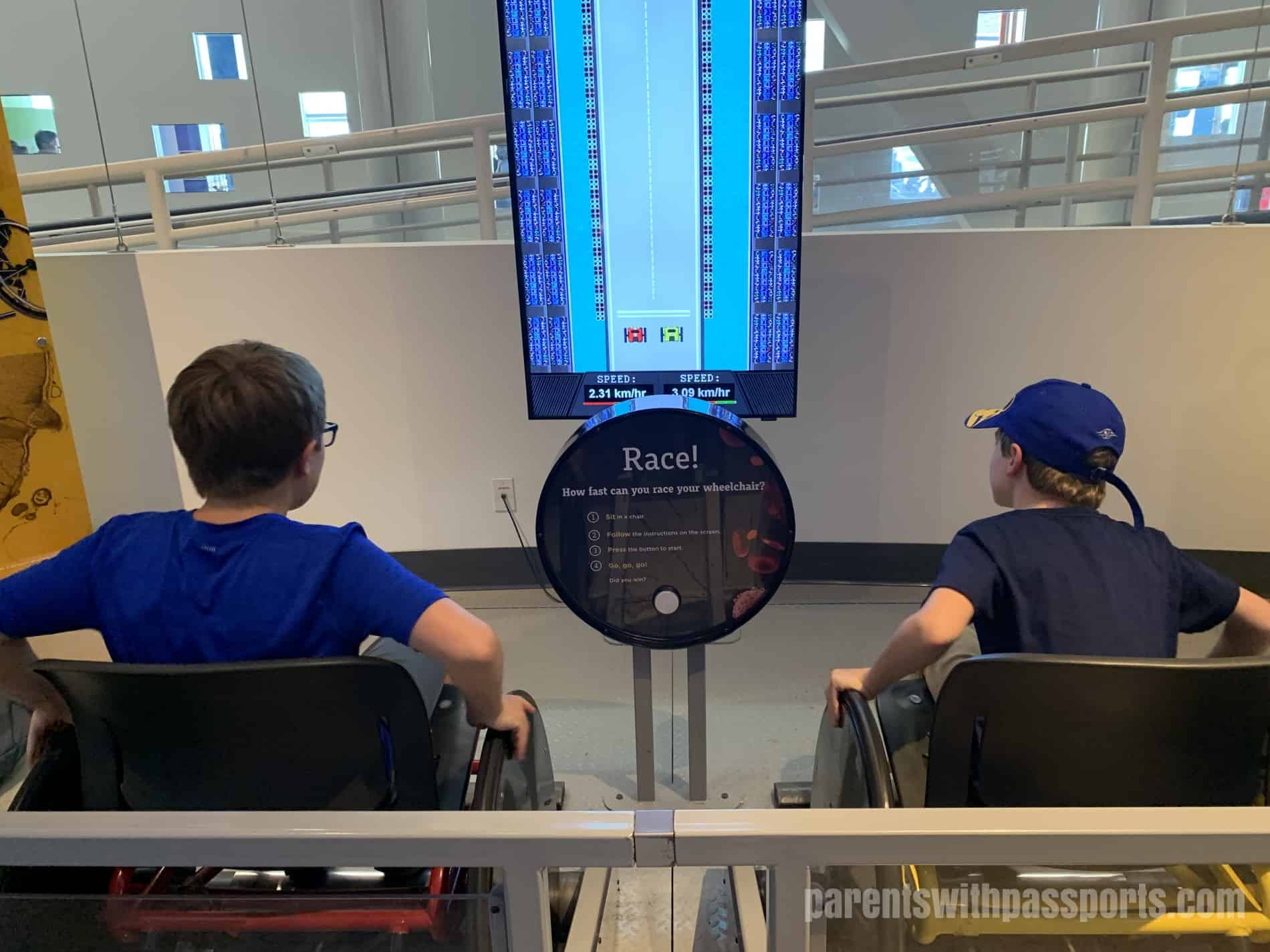 There were so many fun activities right within the circular atrium upstairs that we never made it into any of the full exhibit rooms. But the kids had a blast with all the hands-on exhibits right there in the atrium. They tested their strength, climbed a rotating rock wall, tested their reflexes, went downhill skiing, and raced in wheelchairs. But by far the group favorite was the Mindball Game. Wearing electrode headbands, players send brain signals to the table to move the ball towards their opponent. The player who is more focused and relaxed wins. The boys all loved playing this together.