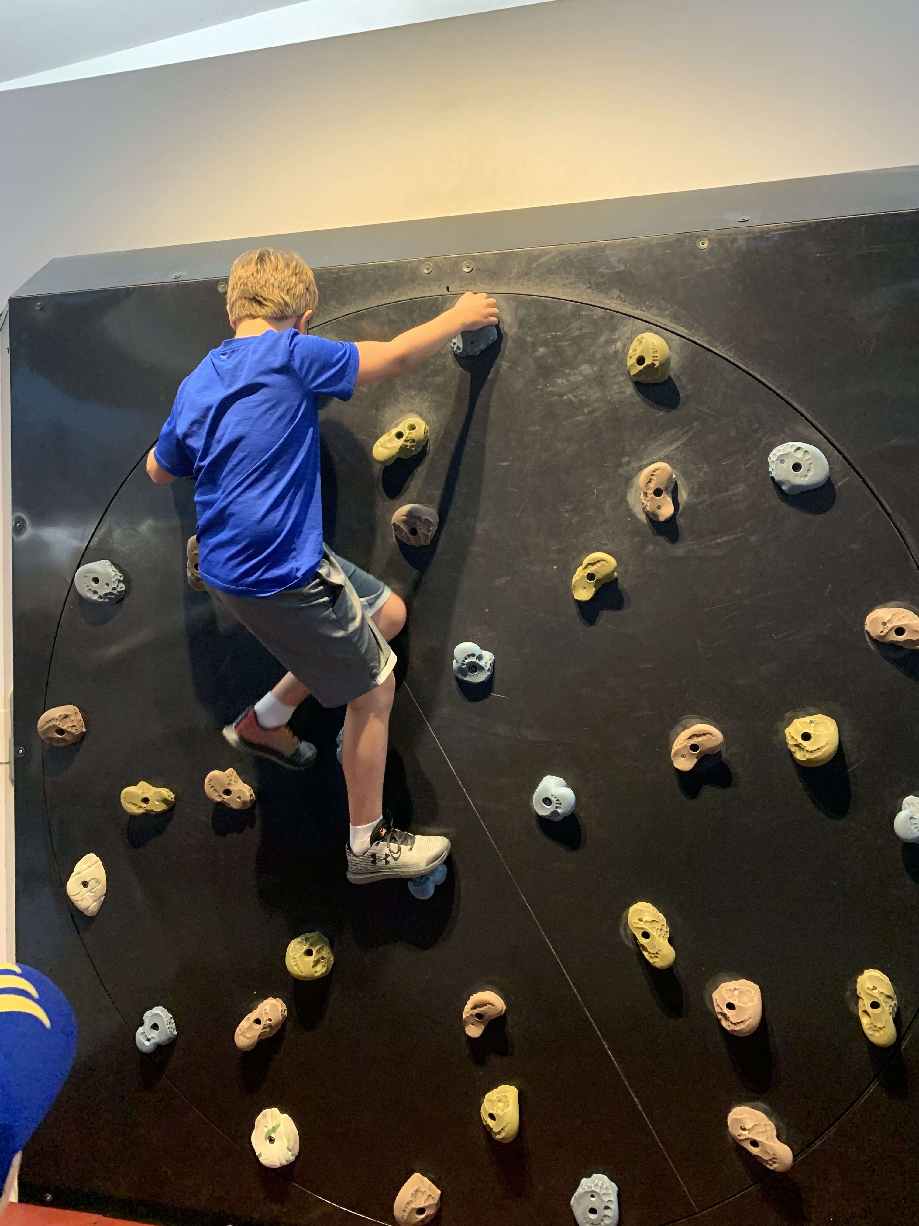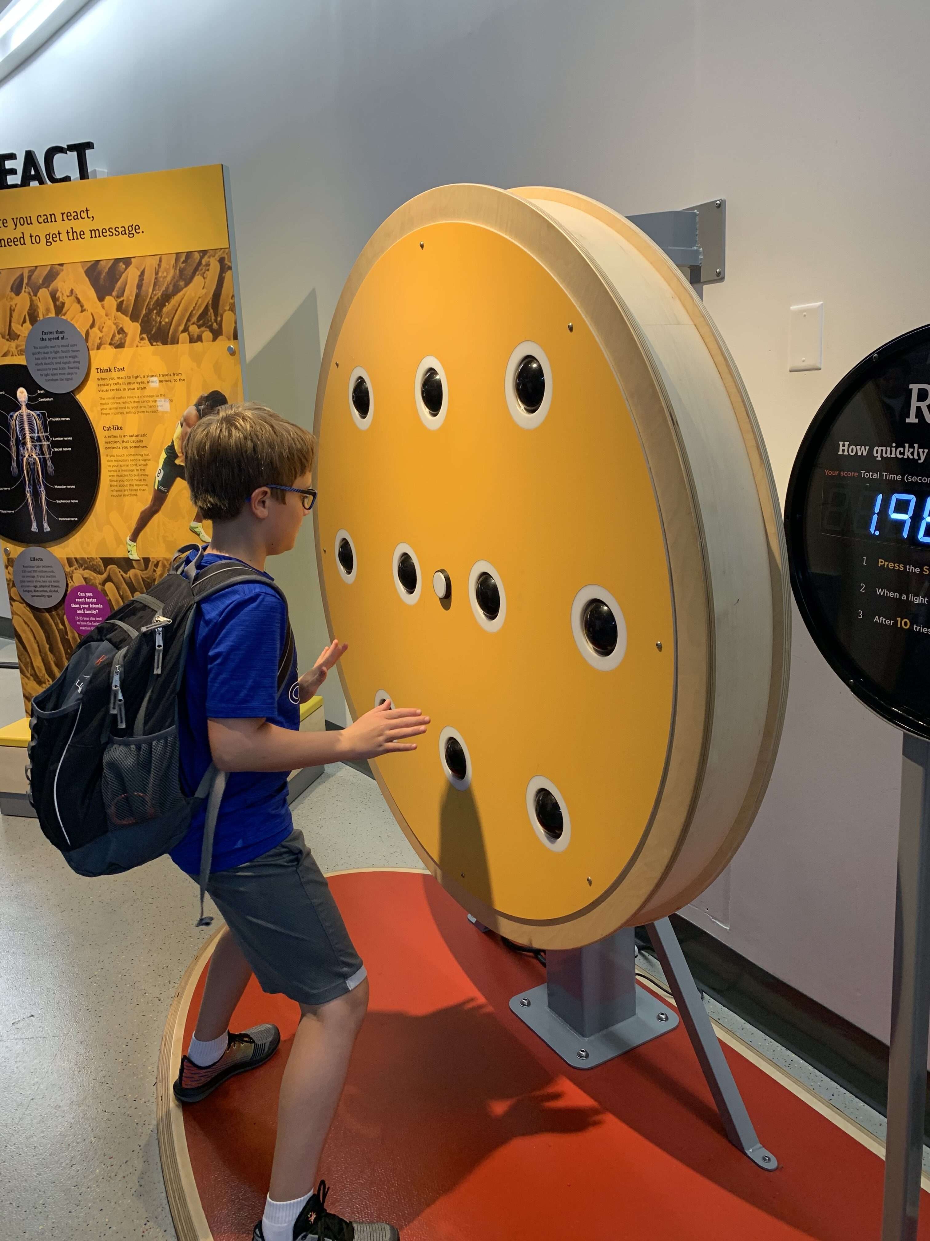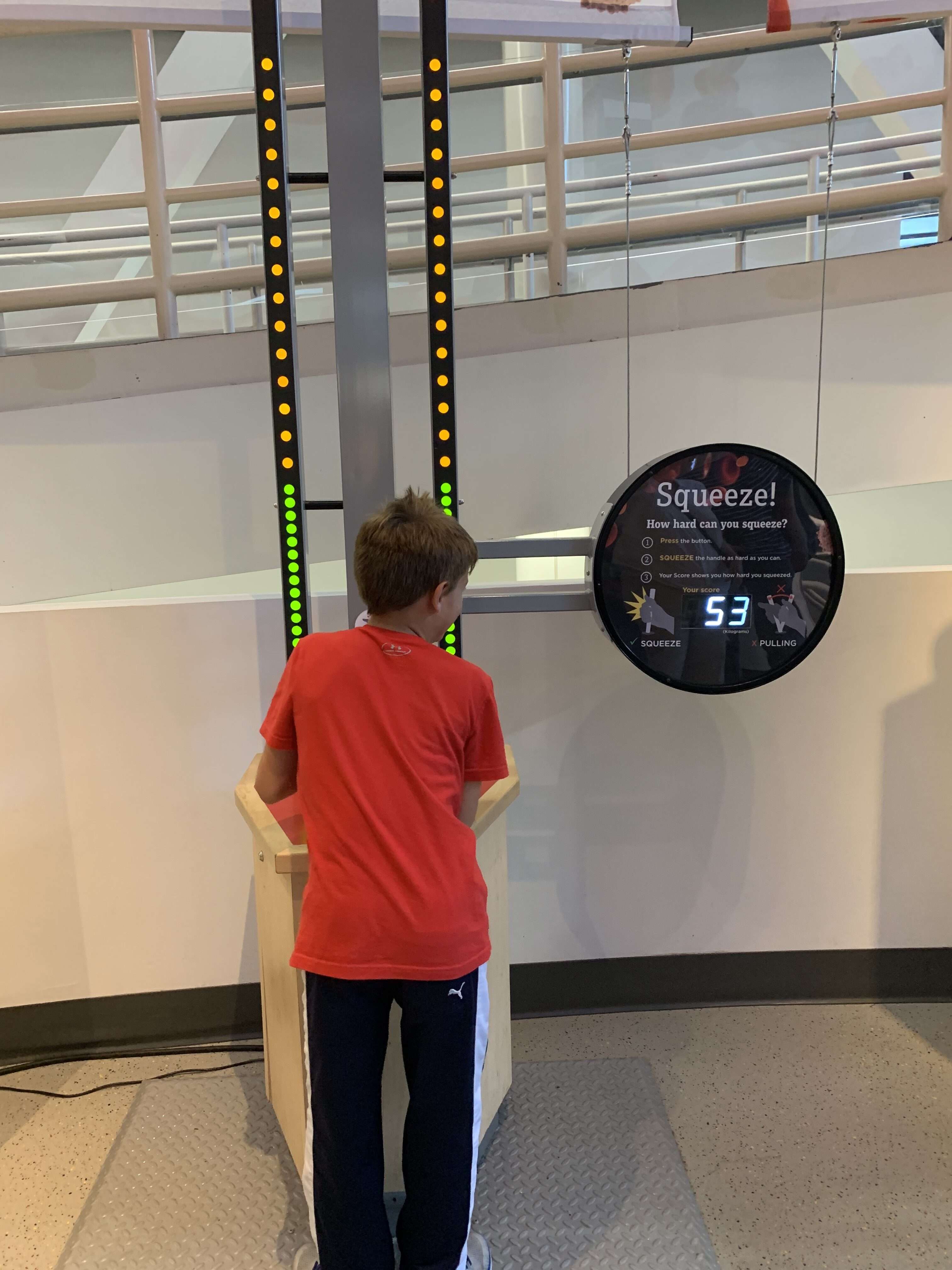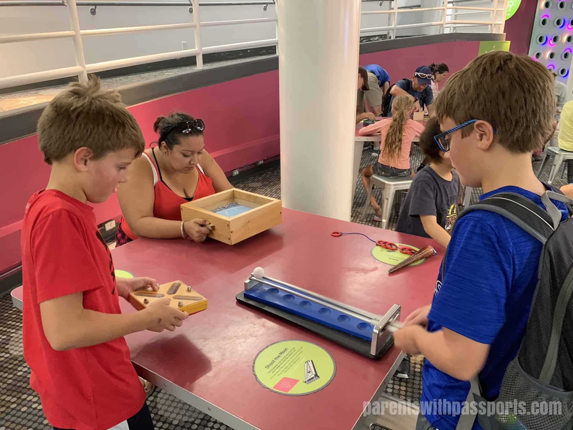 There were so many fun activities right within the circular atrium upstairs that we never made it into any of the full exhibit rooms. But the kids had a blast with all the hands-on exhibits right there in the atrium. They tested their strength, climbed a rotating rock wall, tested their reflexes, went downhill skiing, and raced in wheelchairs. But by far the group favorite was the Mindball Game. Wearing electrode headbands, players send brain signals to the table to move the ball towards their opponent. The player who is more focused and relaxed wins. The boys all loved playing this together.