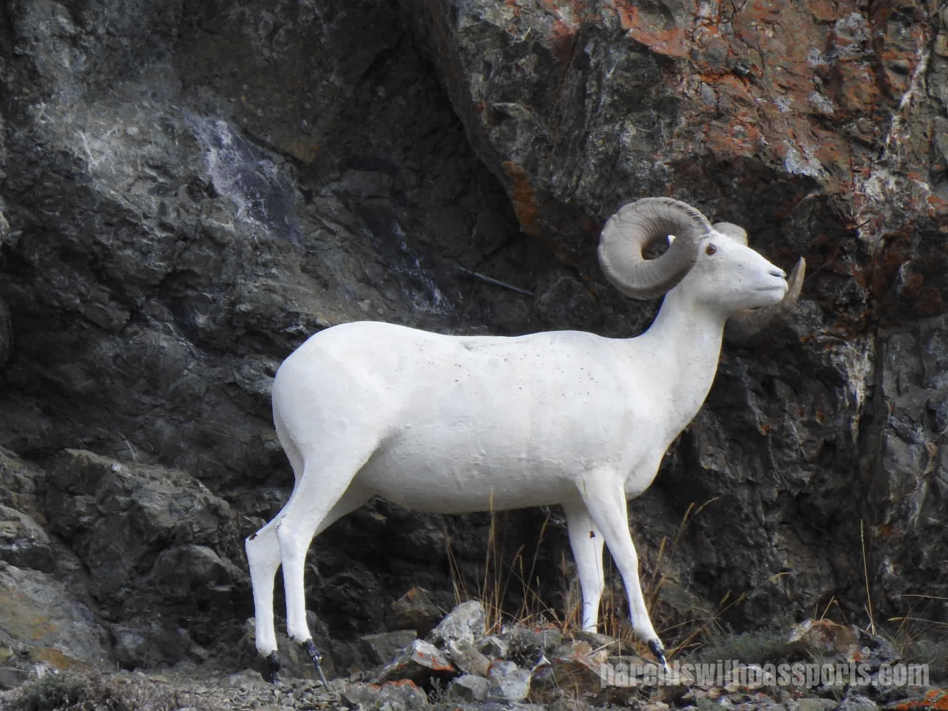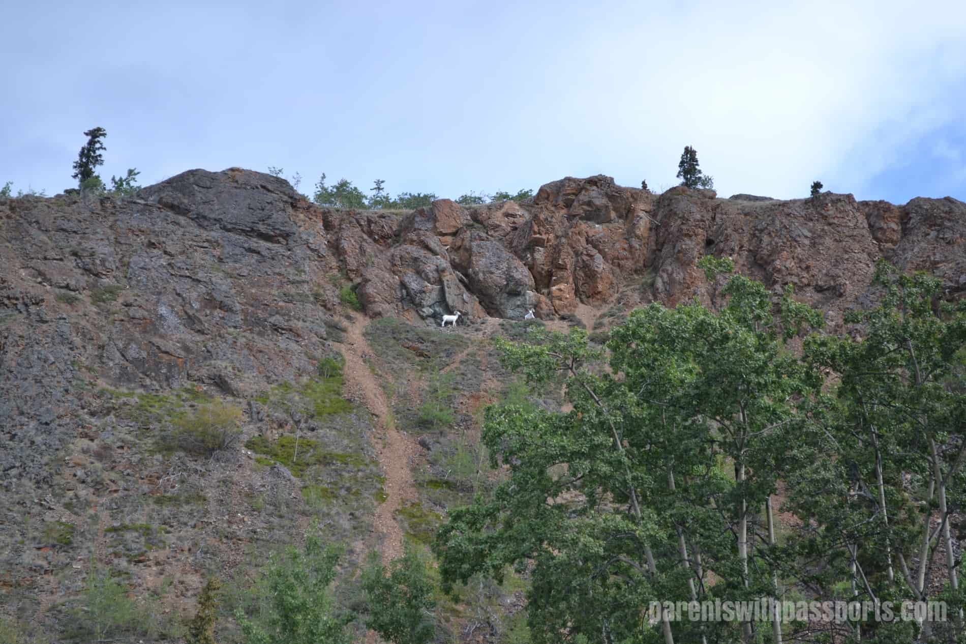 After the ride we got to visit the husky puppies. As we left the dog cart area and headed towards the puppy pen, my husband spotted two mountain goats in the hill above us.
