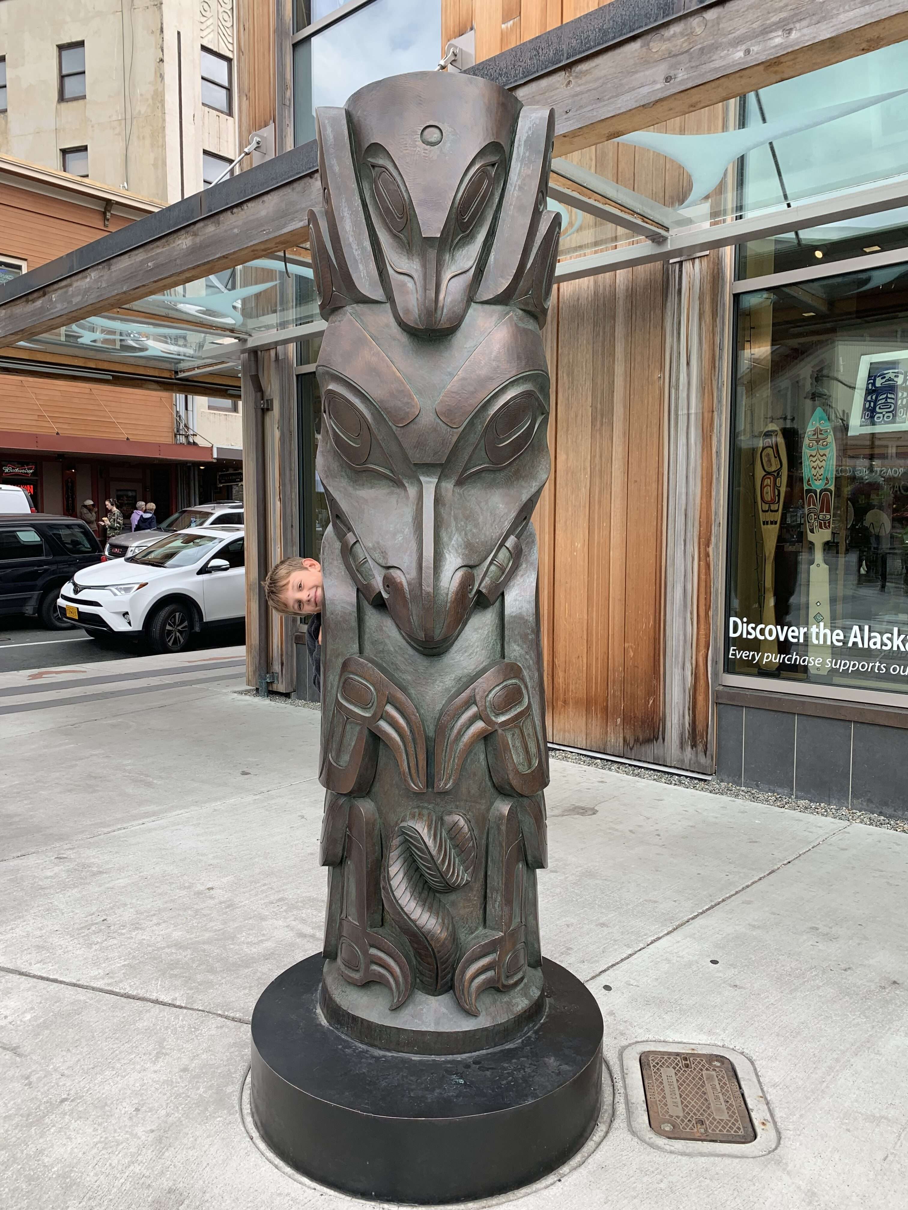 We did pop into the Sealaska Heritage Institute. Its facade was beautiful, adorned with native Alaskan carvings. The interior was just as impressive, with a huge collection of artwork and carved clan house fronts. The kids were hungry so unfortunately we didn’t venture beyond the lobby into the exhibits but we enjoyed our short walk through.