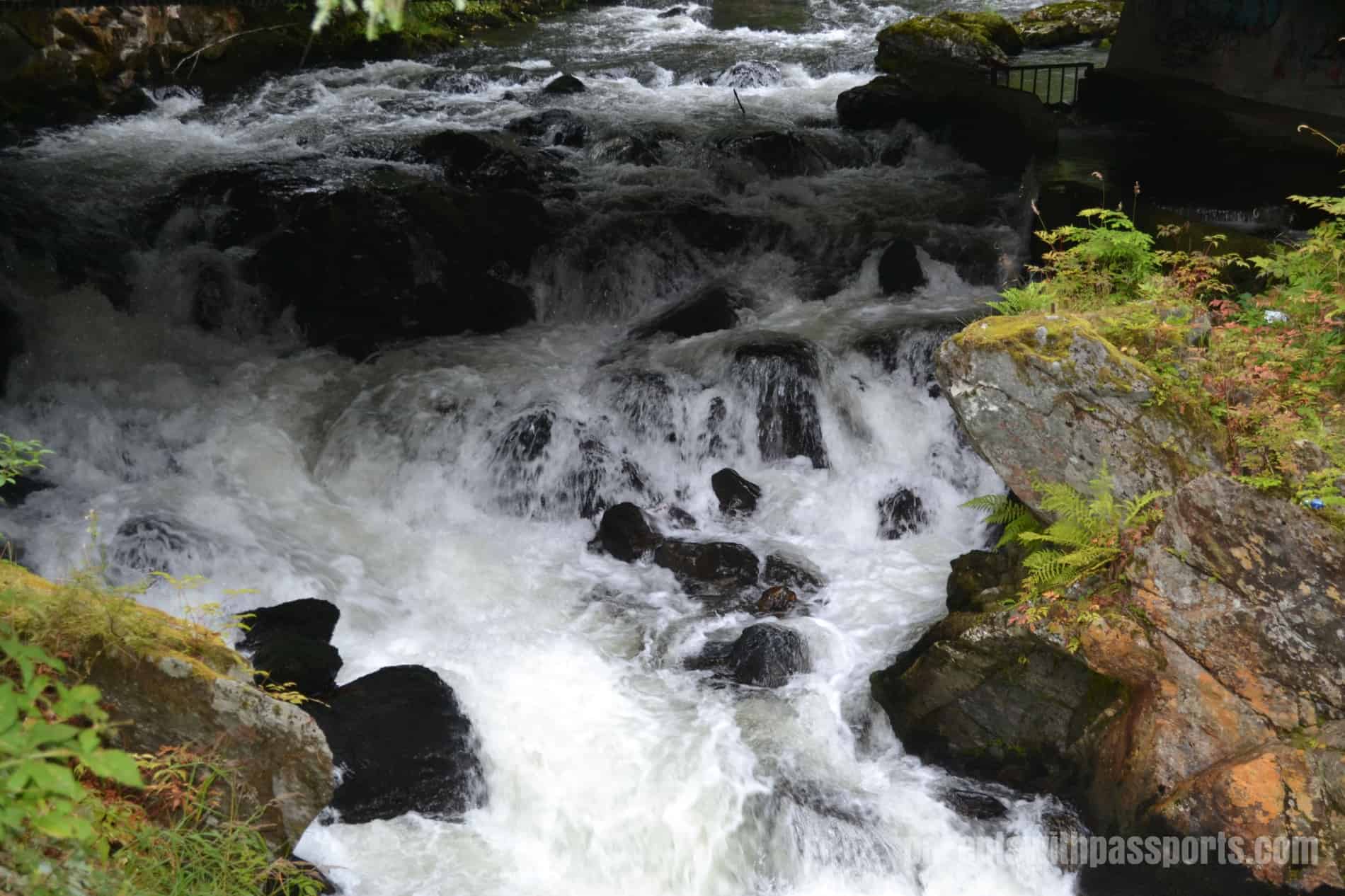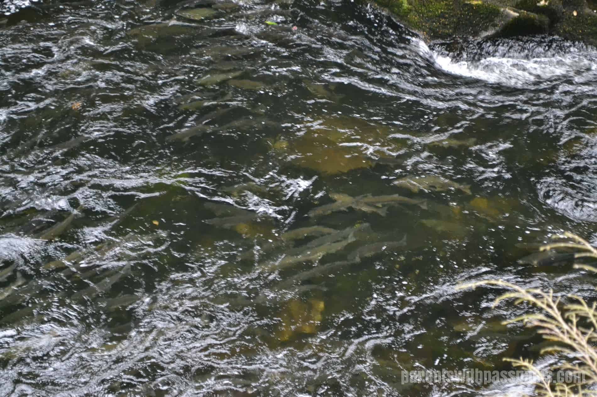 It was unbelievable to me that fish swam UP this water. Salmon are born in freshwater streams and then migrate to the ocean. During the “salmon run”, the salmon return to the exact spot where they were born to lay their own eggs. The catch is that they have to swim upstream to get back there. They swim hard and jump out of the water in an effort to continue moving up the rapids.