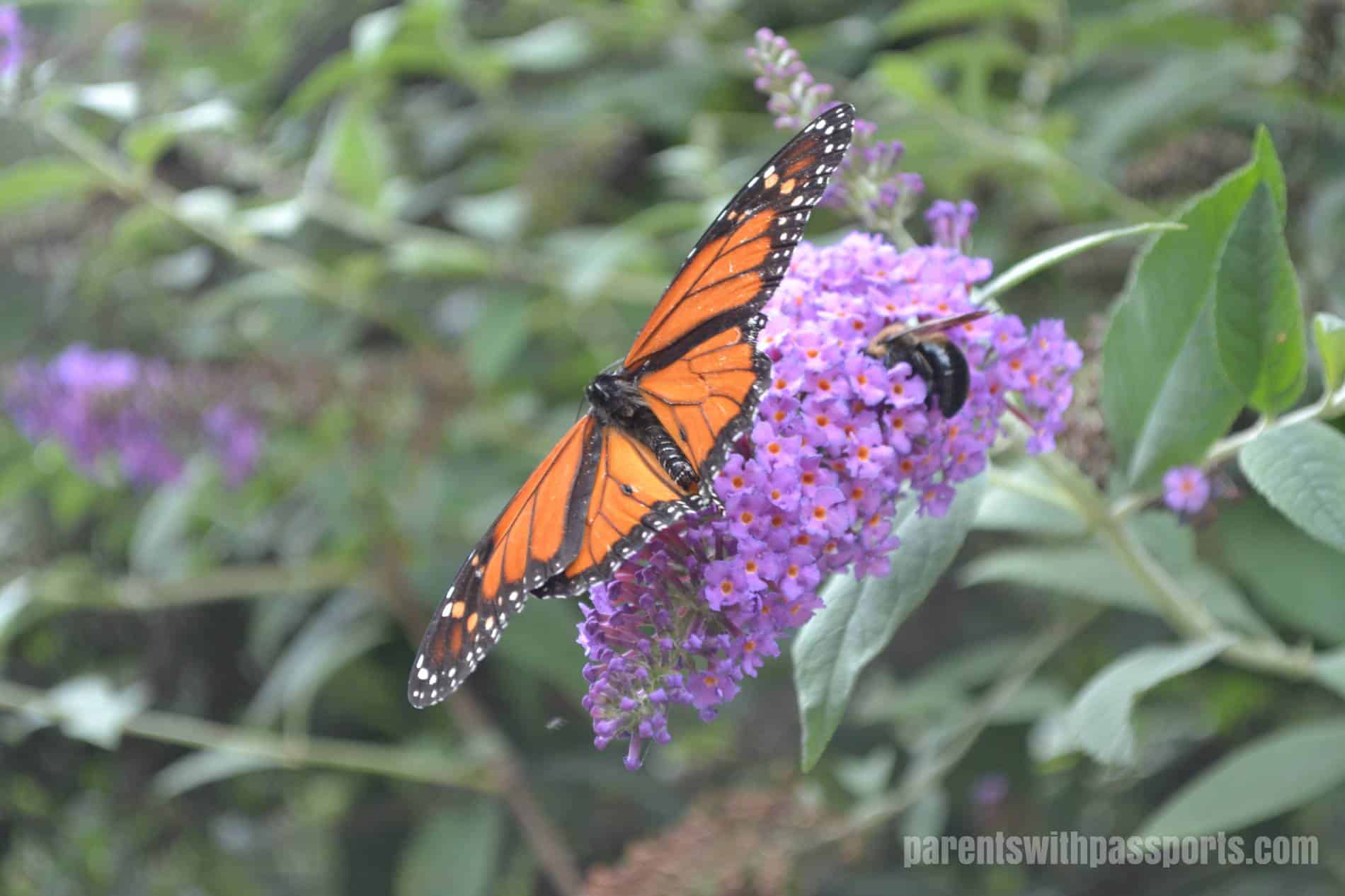 (As a surprise bonus, there was a gorgeous butterfly bush outside the restrooms that proved irresistible to this butterfly and bee!)