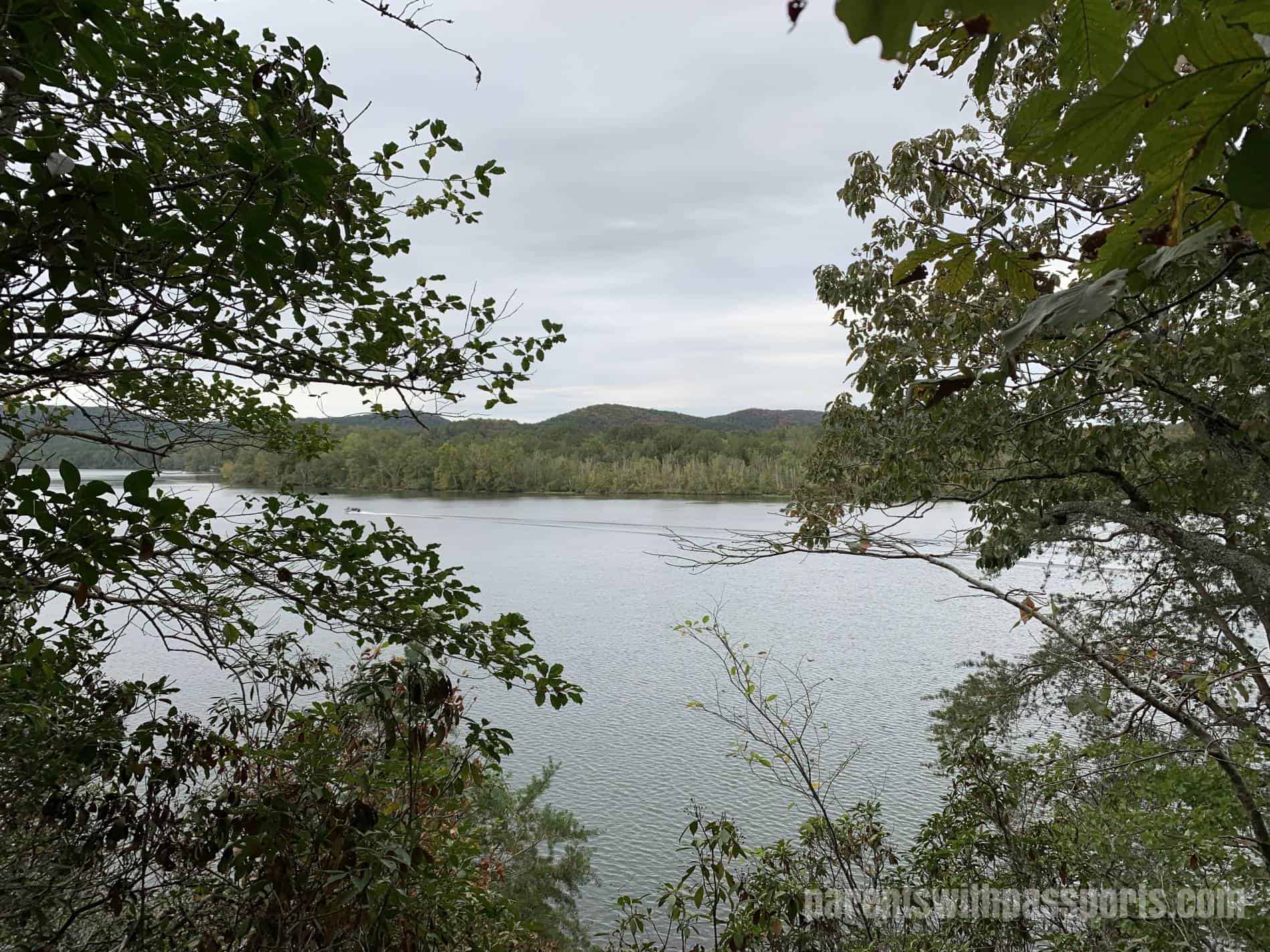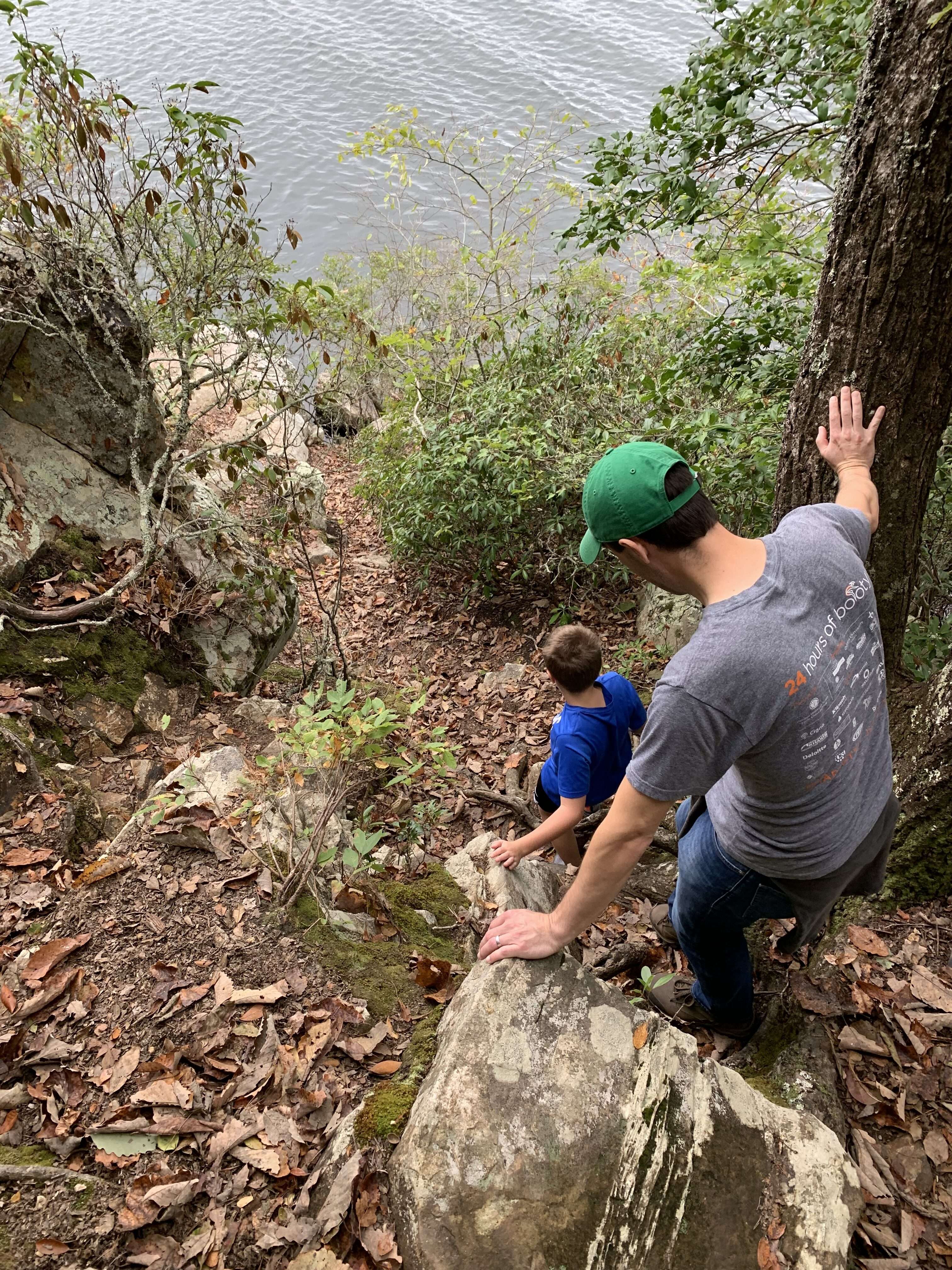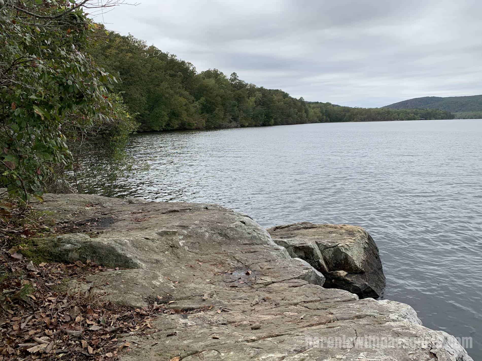 The climb to get down to the viewpoint was rocky and steep (which the boys loved!). The view from the bottom was pretty. It certainly doesn’t rival the postcard views you get in the Blue Ridge Mountains, but it is pretty nonetheless and a nice reward at the end of the trail. The rocky outcrop is large and flat and juts out into the water a bit, giving you a neat place to relax and take in the views before heading back.