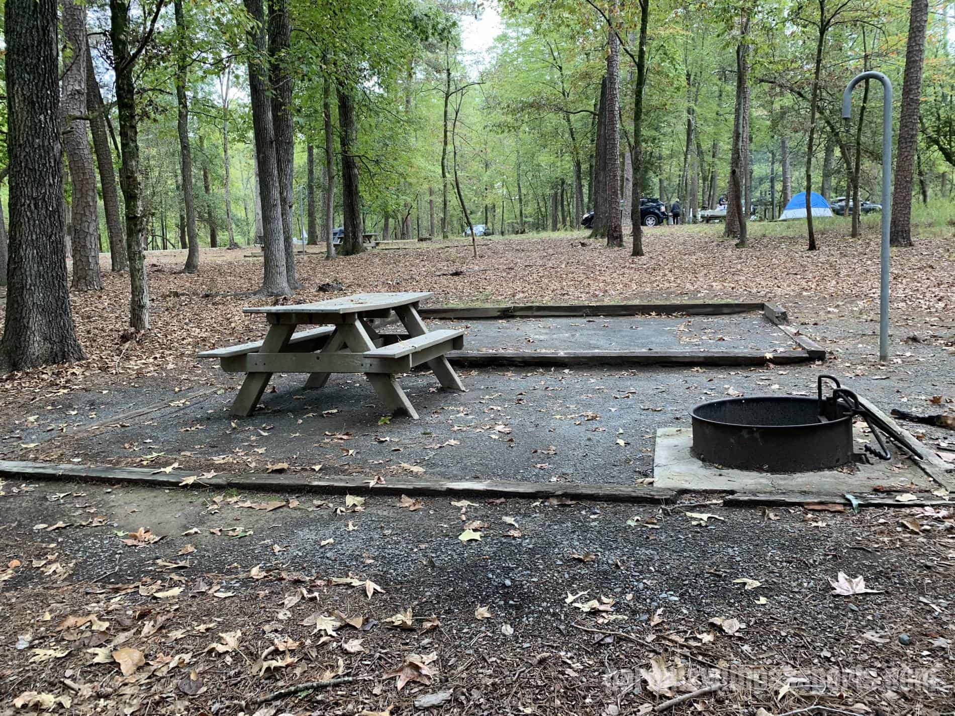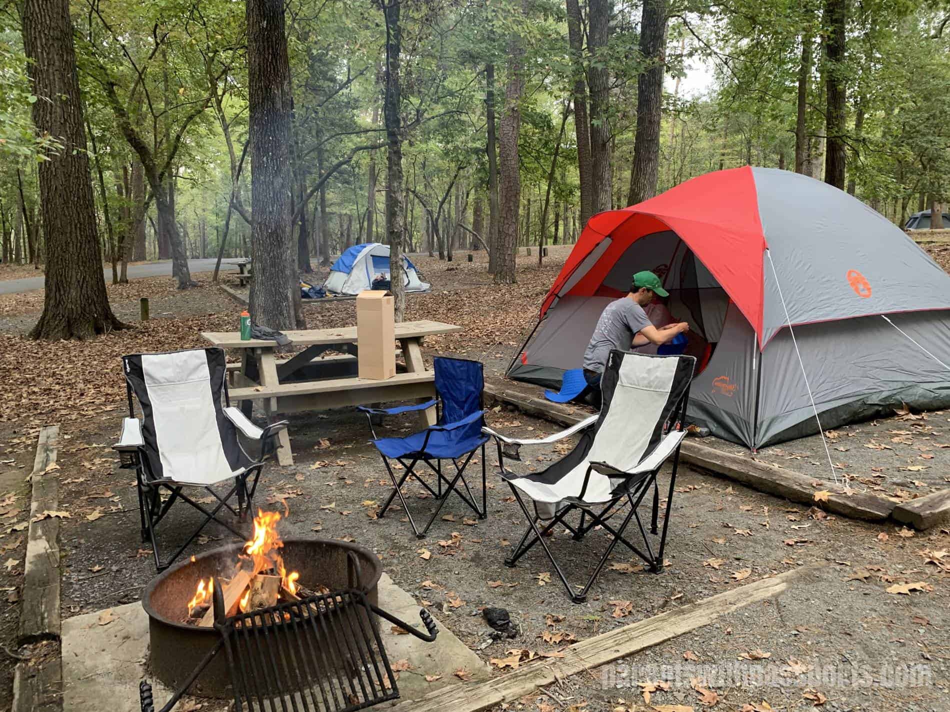 With all the necessary gear, we made the hour and a half drive to Morrow Mountain State Park. The park offers 106 tent/RV campsites, spread around 3 different loops. We had a camp site in Family Campground Loop A. Their website reservation system has a really handy map where you can click on each individual site and see its amenities, including information such as amount of shade and proximity to drinking water. Each site in our loop appeared to have a nearly identical setup: a tent pad, a picnic table, and a fire pit.