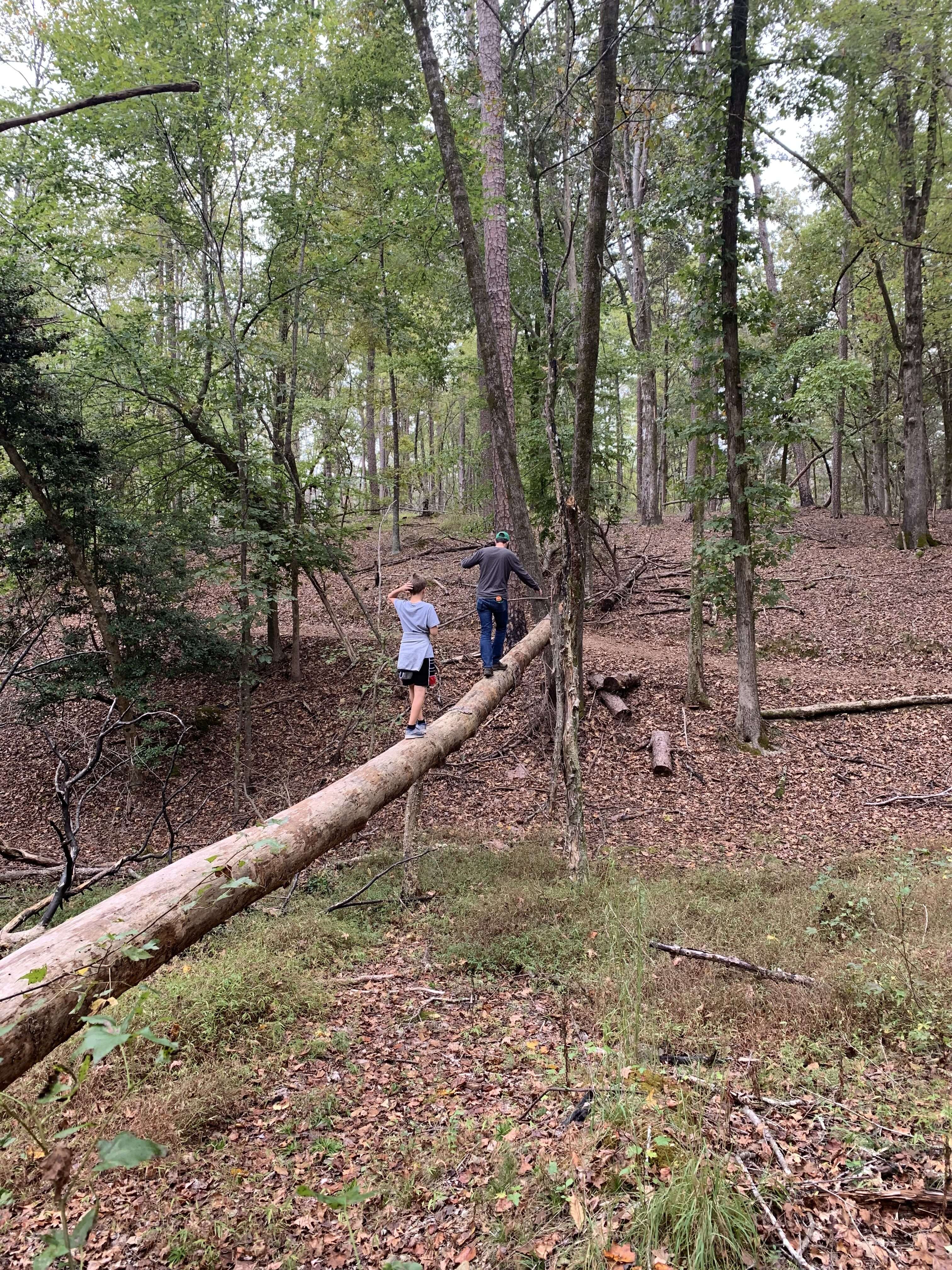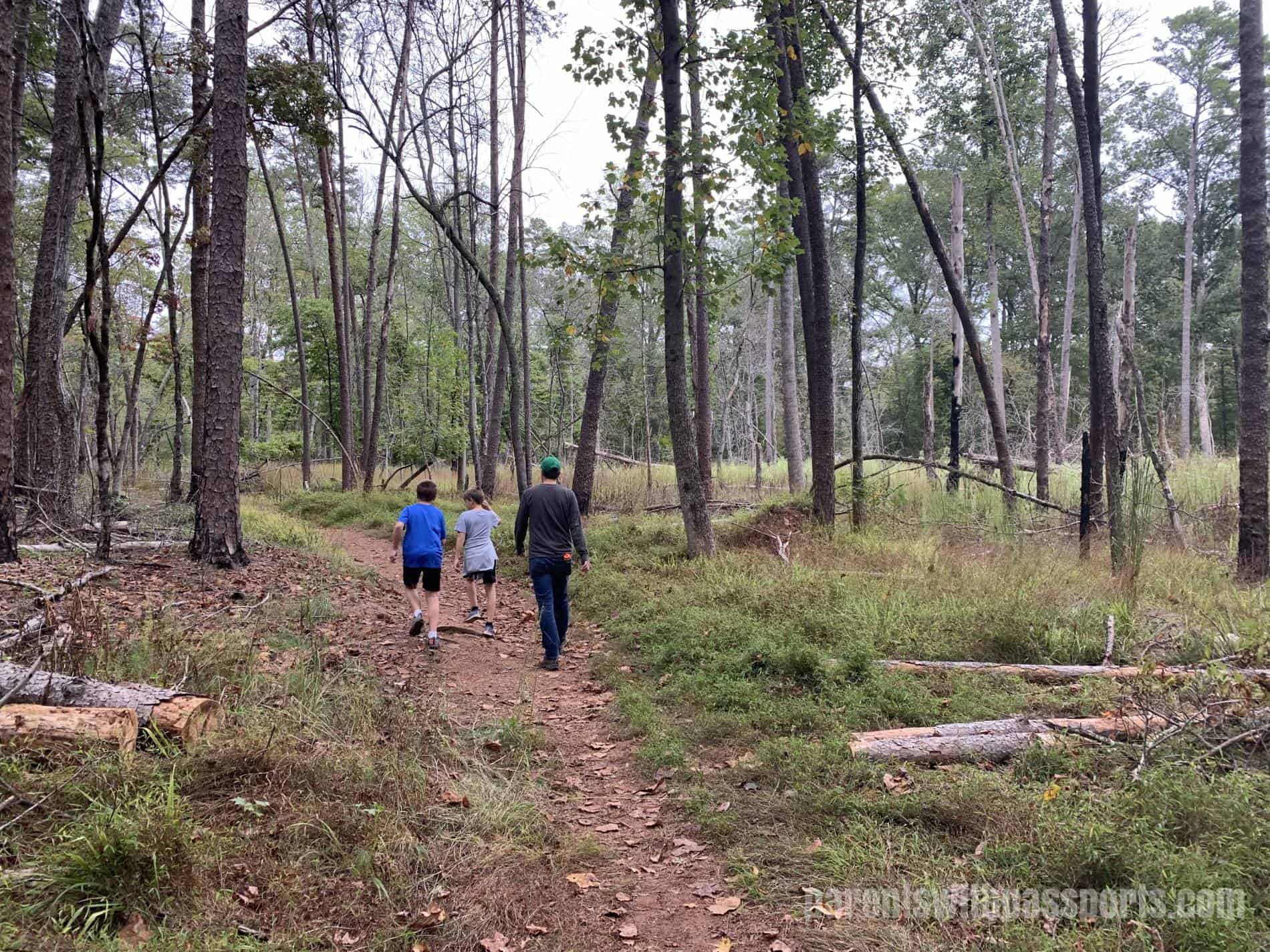 The website describes this trail as traversing “mostly mature woodlands”. The wide gravel path at the start becomes dirt and narrows slightly as you continue, but it is clear and well worn. The trail offers plenty of shade as it cuts through the forest. There were a handful of rolling hills but they were easily managed. There were a lot of downed trees, which my youngest found to be an endless opportunity for exploring.