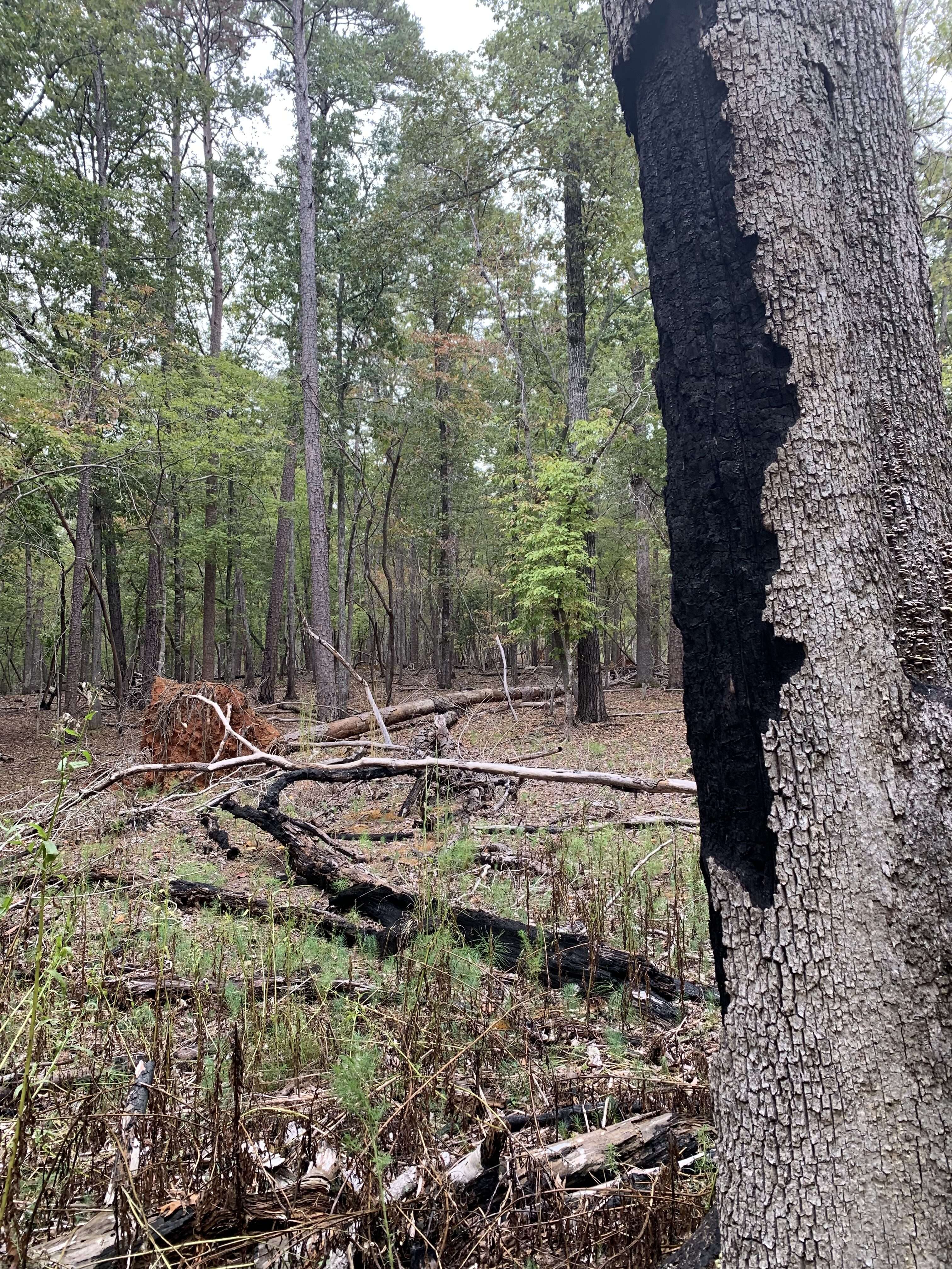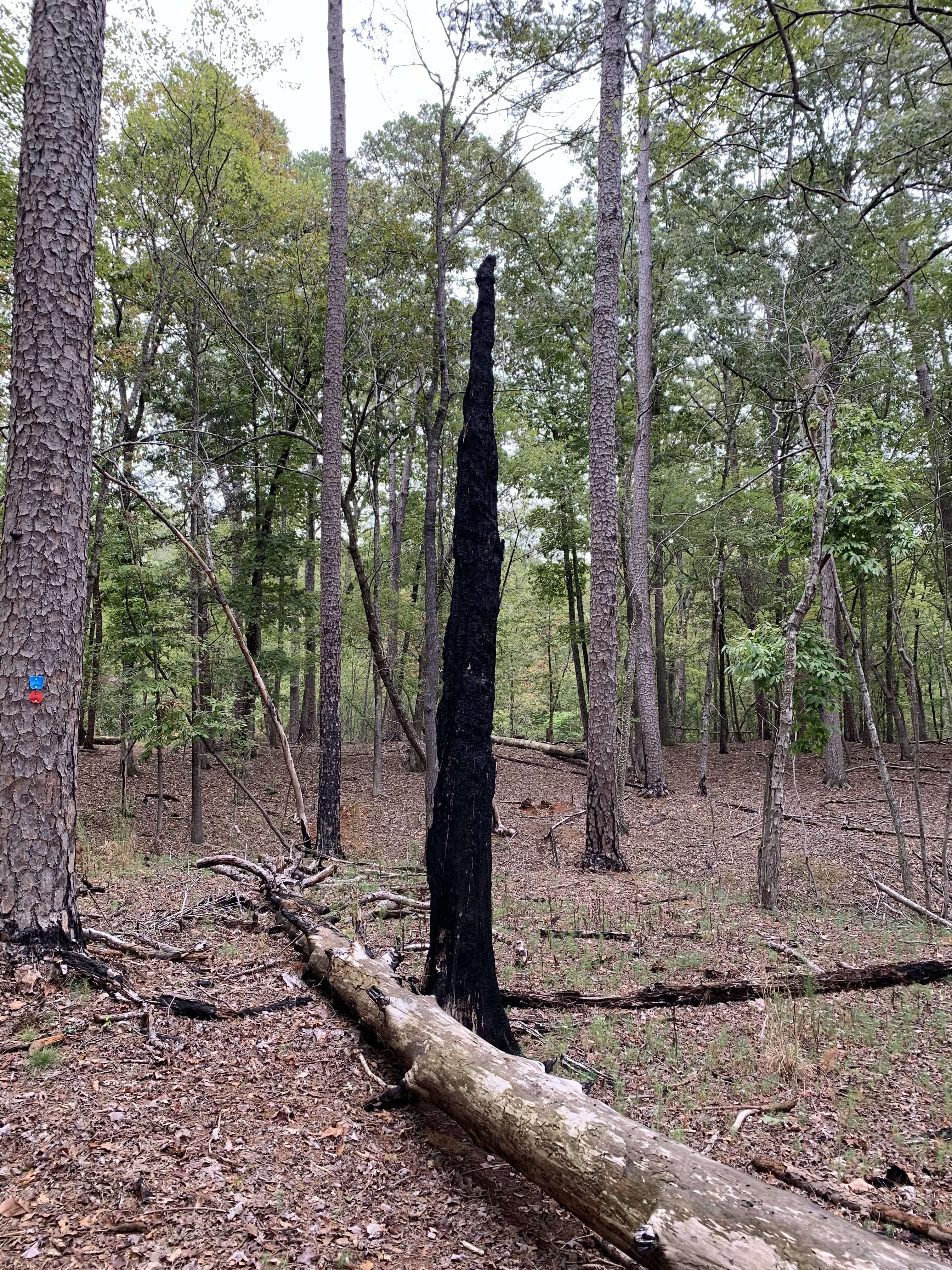 We were immediately struck by the condition of the woods around us. It looked as if a fire had raged through here. Trees were down everywhere and there were charred tree trunks and branches all around. After much googling on our drive home the next day, I determined that this was the result of prescribed burns that are used as a way to protect forests by reducing undergrowth that is susceptible to wildfires. Over the past few years, the park has had prescribed burns covering area ranging in size from 600 and 1,650 acres. Though I was glad to learn the fires were intentional and controlled, it still left the woods looking decimated and sad.