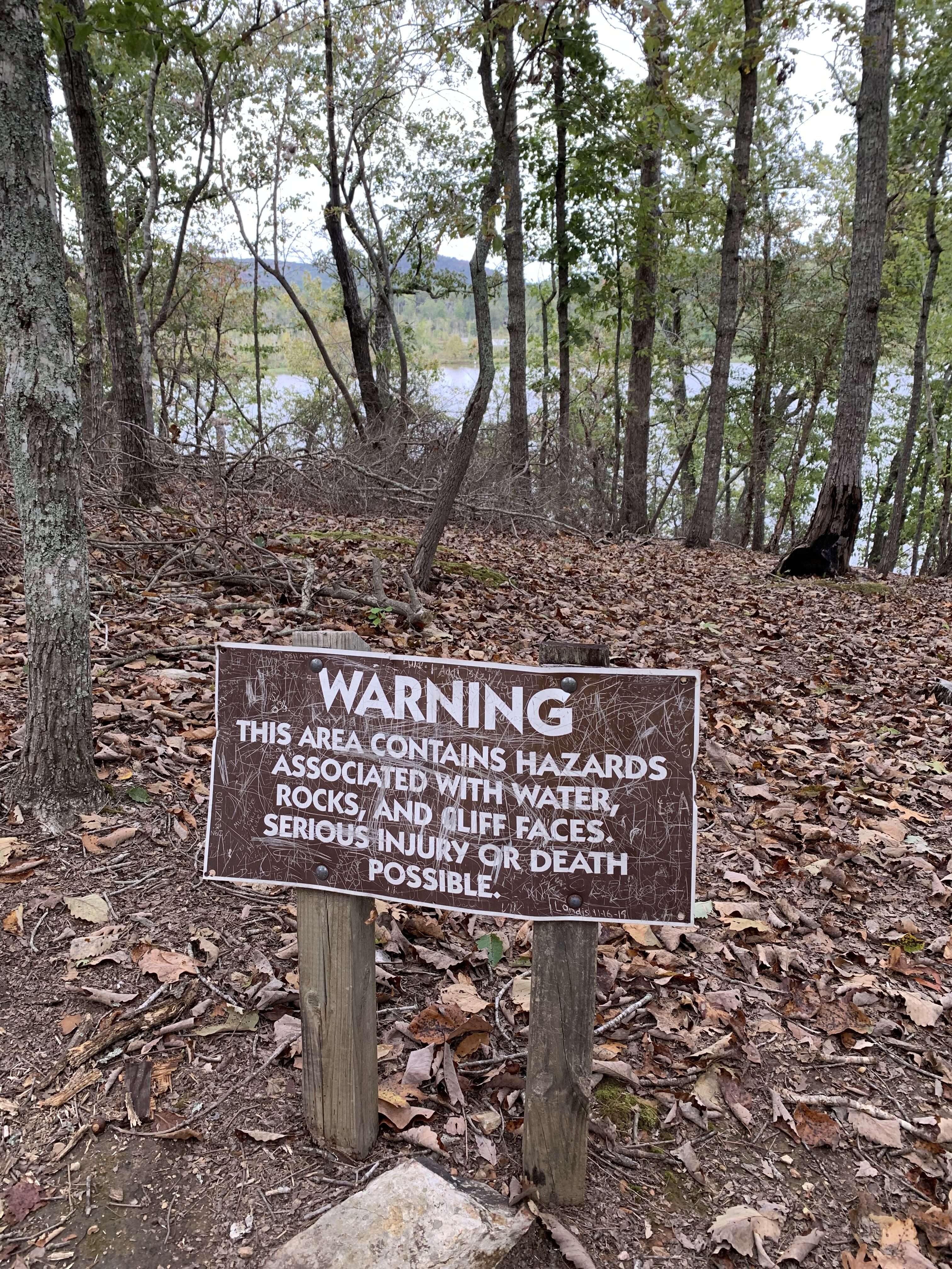 We made it to the end of the trail and the boys were excited to see that the “big rock” of Big Rock Trail involved a steep downward climb to reach. And warnings signs! Those always make a hike more exciting.