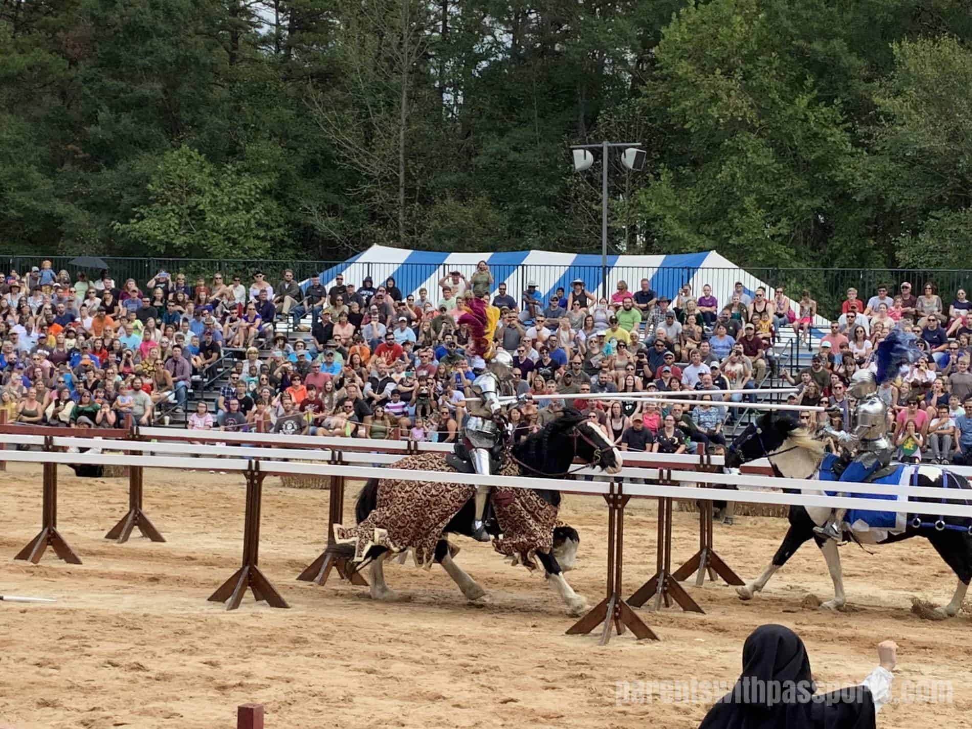 The stands fill quickly for this event so you’ll have to grab a seat early. (Bring a hat and sunscreen because the sun was relentless when we were there.) Each side of the arena is assigned to cheer for either the blue knight or the black knight. Cast members are stationed in front of the stands to encourage cheering (and taunt the opponent), and the knights themselves interact directly with the crowd. It’s a fun event and the knights’ skills are quite impressive.