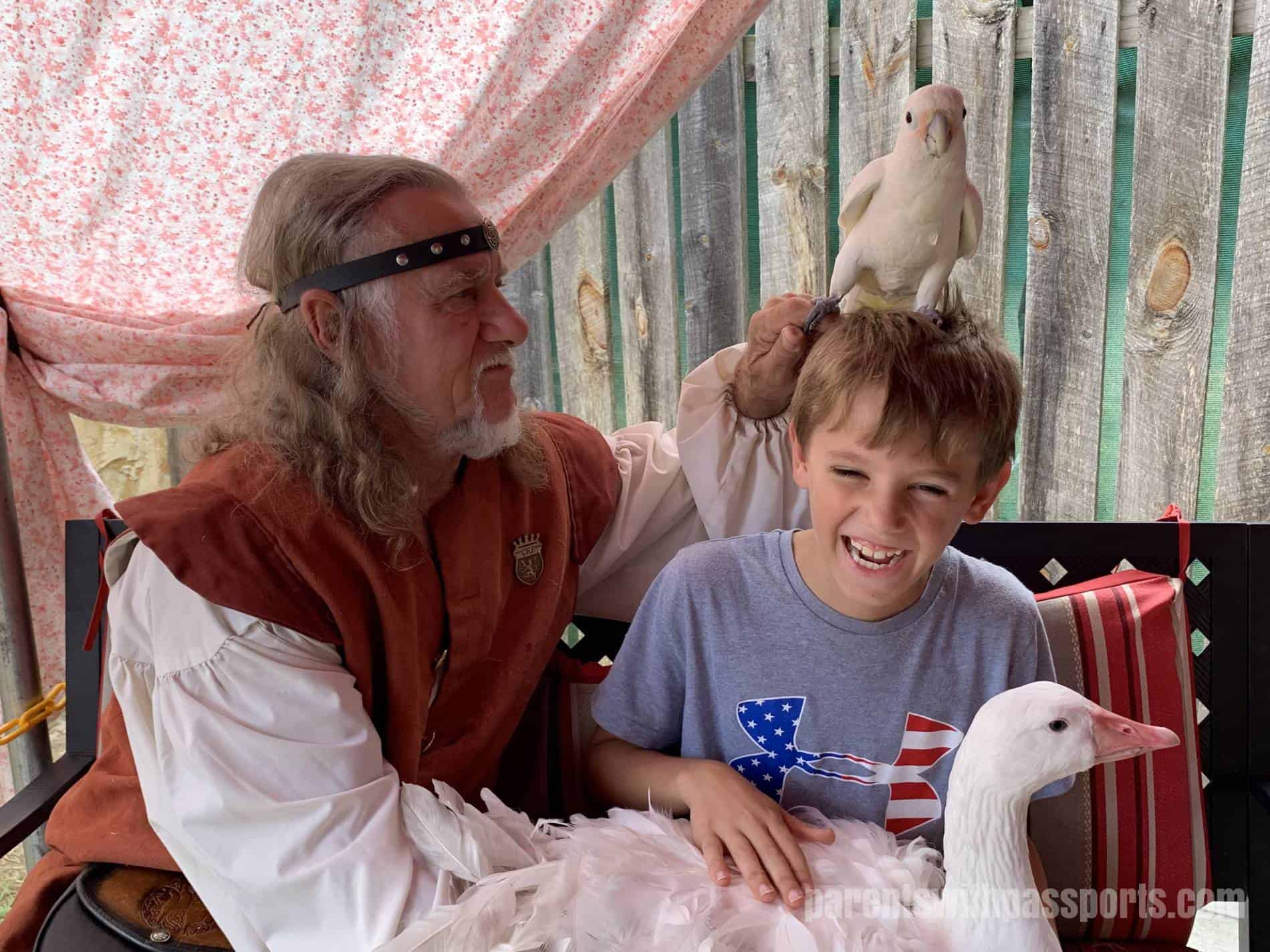 We barely made it through the front entrance when my youngest spotted Mother Goose, hanging out in a booth available for photo ops. And not the character Mother Goose. An actual goose. This animal-loving kid couldn’t get on the line fast enough. The very calm goose sat on his lap and let him pet her.