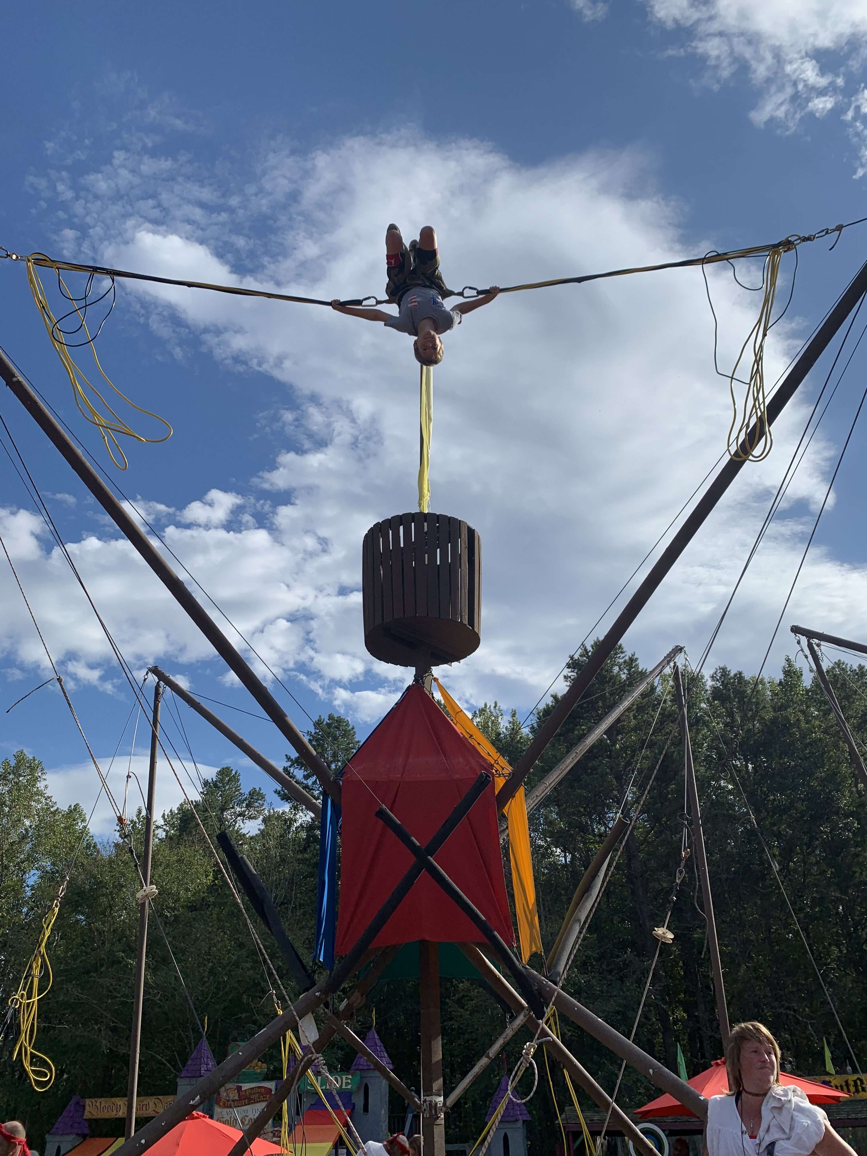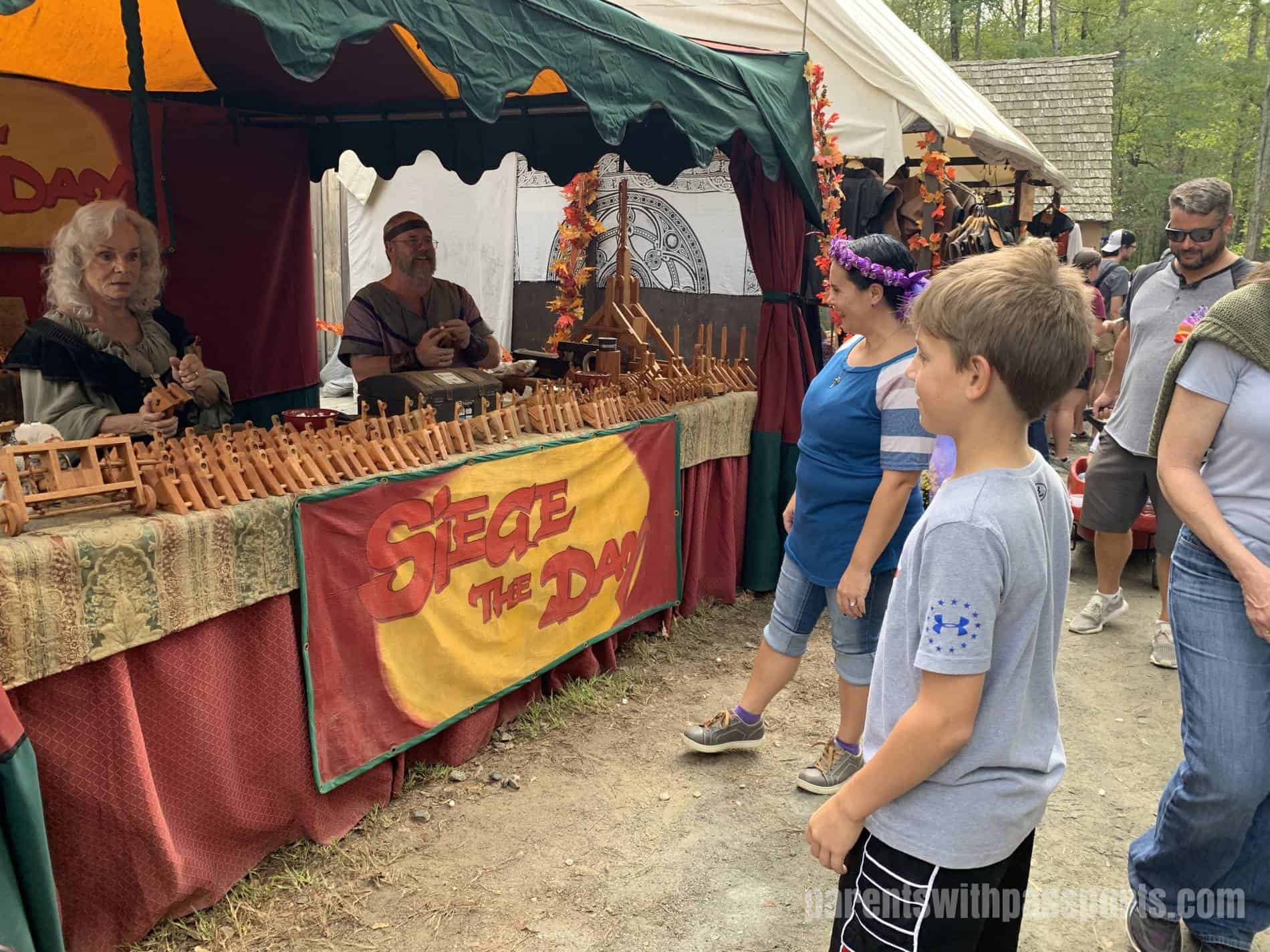There are a few carnival rides here as well (ranging in price from $2 to $7), although many of them are for younger kids. But the boys’ absolute favorite thing to do at Ren Fest is the Pirate’s Assault Catapult. After getting hooked up to various ropes and harnesses, they jump on the trampoline and launch super high into the air. It is tons of fun but be warned that experiences vary based on the employee manning your trampoline. Some pirate employees enjoy launching kids high in the air and let them really bounce around and enjoy themselves. Others are just phoning it in, barely sending the kids off the ground and watching the clock to stop them the second their time is up. (We had one of each this visit.)