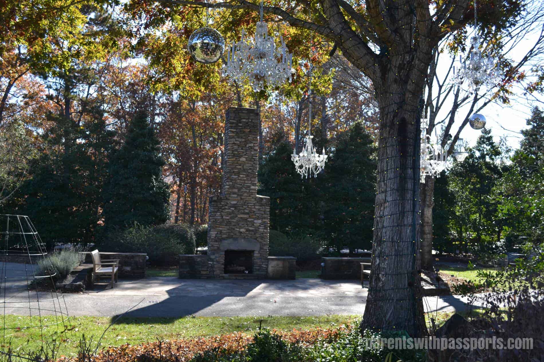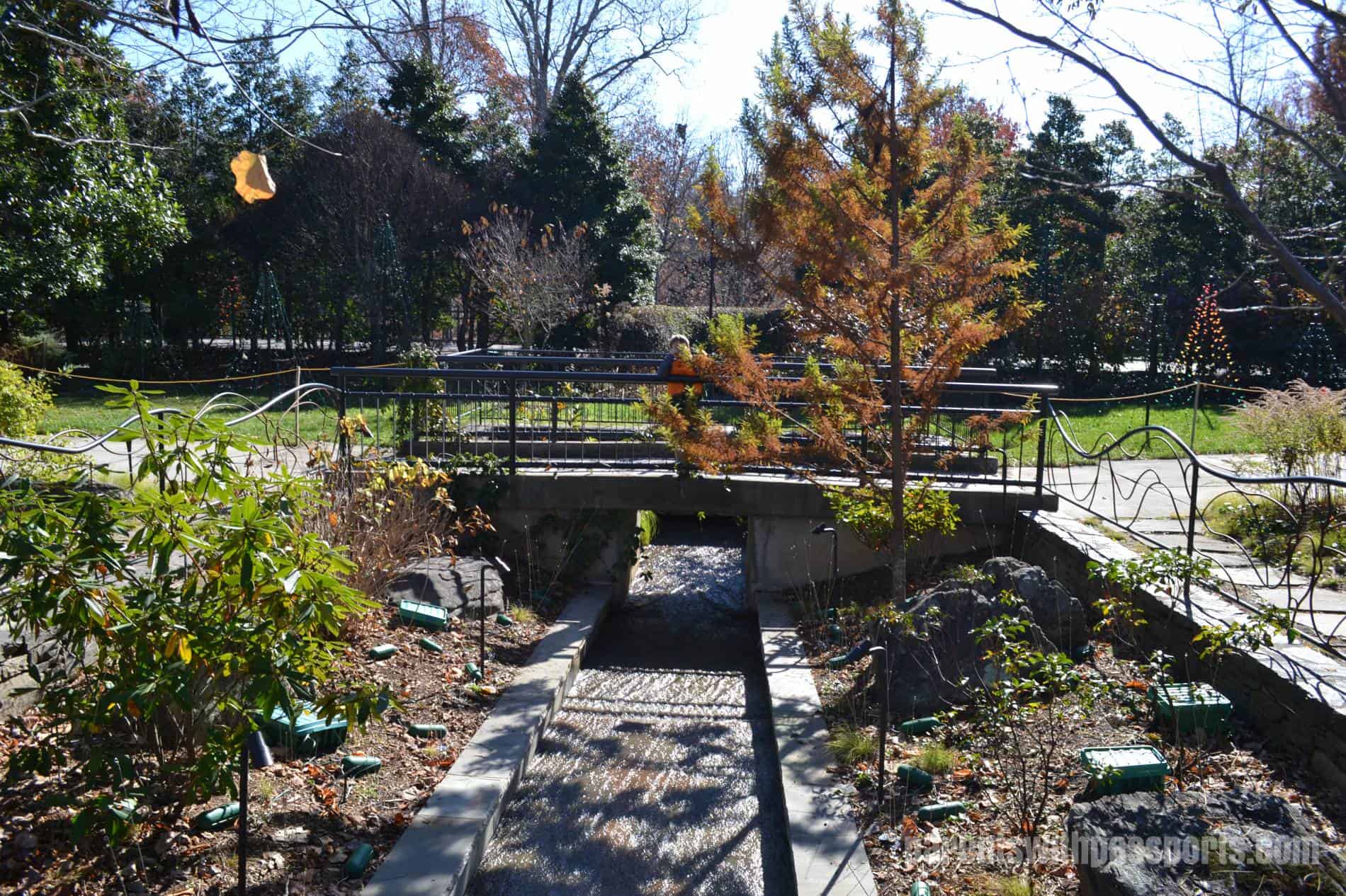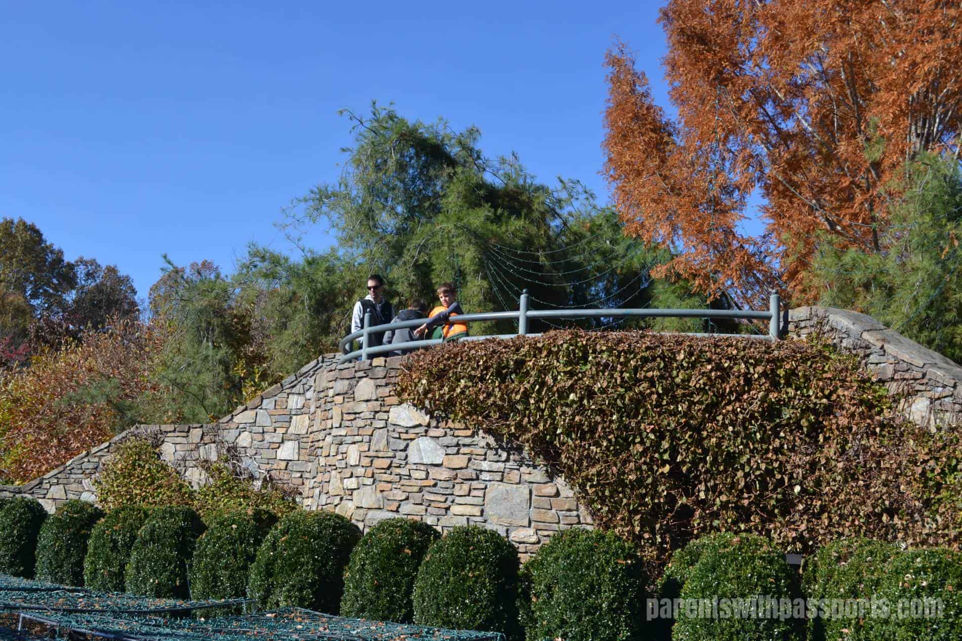 The Quilt Garden is probably one of the arboretum’s most impressive features… but not in the winter. In season, the garden blooms take the shape of a traditional quilt pattern. In late fall, it is nothing more than a series of dirt squares, but we could see that they were setting up holiday lights in square patterns over the plots. The garden has an elevated stone overlook where you can take in the pattern (whether made of flowers or lights) from a bird’s eye level.