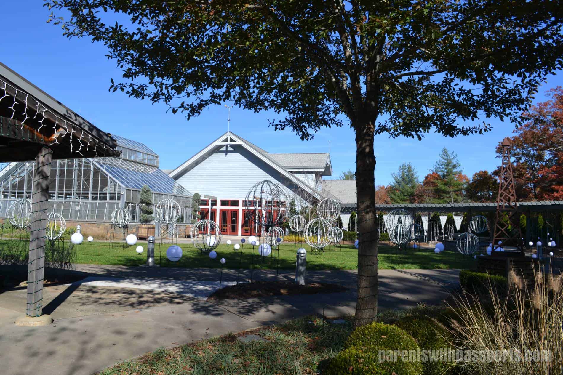 Right outside the Baker Exhibit Center is the Baker Landscape, a central lawn area surrounded by flowers lining the edge of the woods. (Note the sign warning of venomous snakes in the area and stay on the path!) This area was already decorated for the winter lights exhibit already and looked impressive even during the day time.