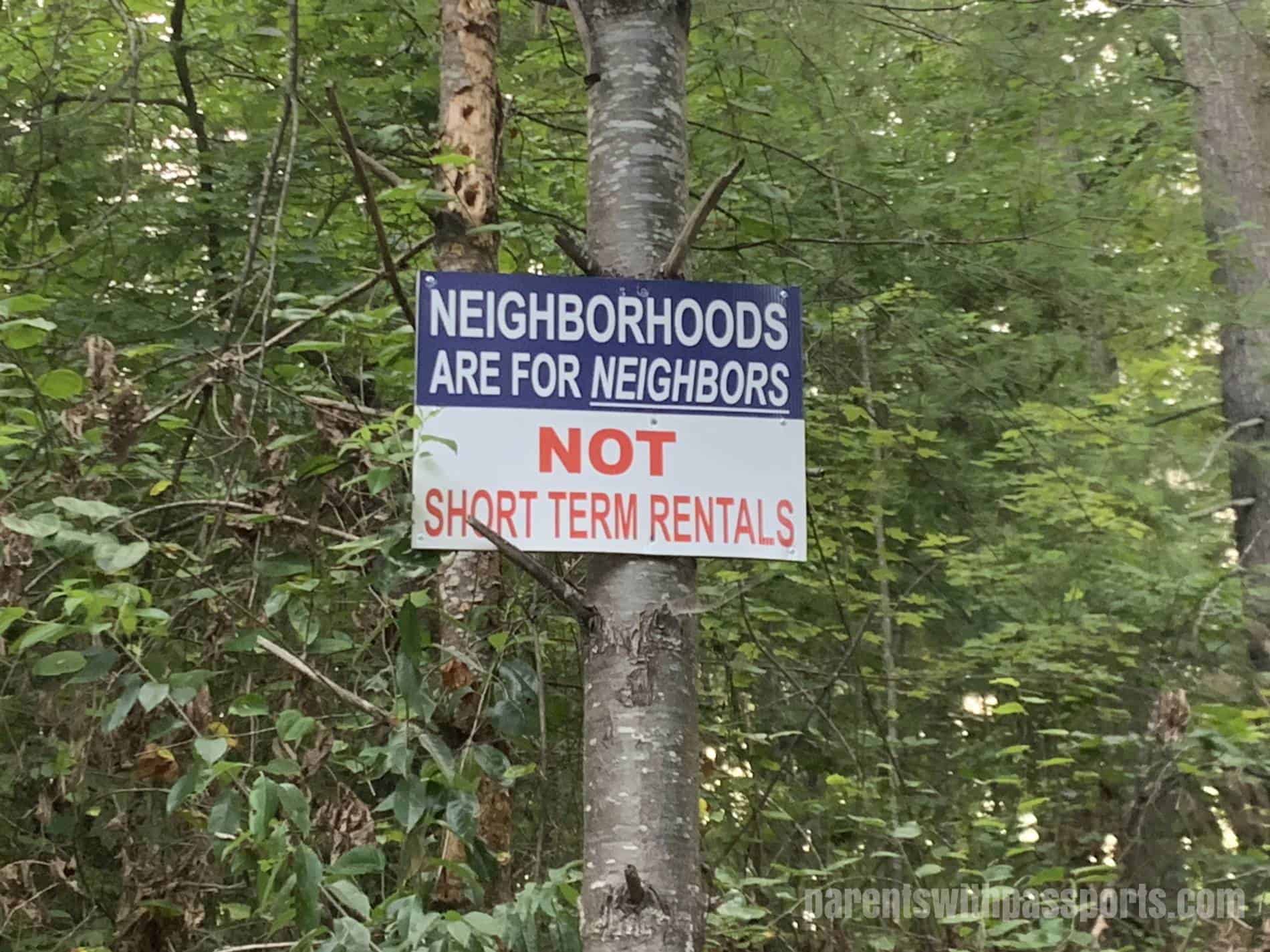 Overall the house was great. It was cute and cozy, and we definitely recommend it and would stay there again. The owner was super helpful and accessible. The location and views were amazing. It had a unique layout with some really cool spaces. It was well-stocked (both inside and out) and comfortably decorated, and they took their dog-friendly status seriously, making sure our pups had everything they would need. The kitchen was well stocked but the bathrooms were a little dated. The house had three bedrooms and slept 8 but started to feel a little tight by the end of our visit, although I mostly attribute that to the two 80+ pound dogs flopped all over the floors, not to the space for the human occupants. You do need to have a bit of a thick skin to stay here, as these signs adorned every major tree from the main entrance to the driveway. (I walked our dogs several times a day and the neighbors were friendly enough though.)