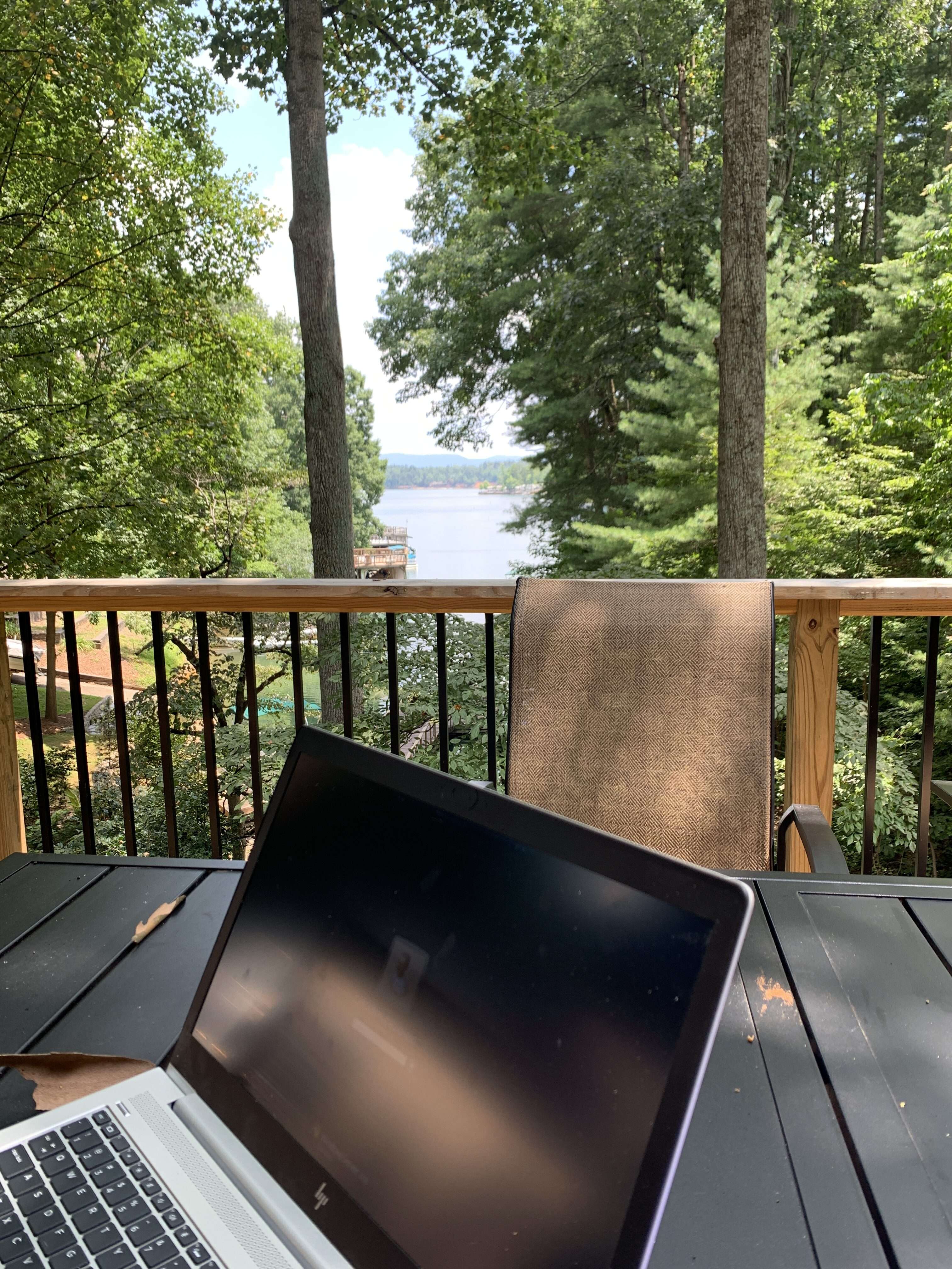 The house location was perfect – it was on a little cove with a private dock where the kids could jump off and swim safely, tucked away from the activity on the main lake. The house was built into a fairly steep hill and the elevated deck made for the perfect vantage point to watch the kids swimming while I worked. Despite being tucked into a cove, it had a beautiful view out onto the lake and the sunsets were gorgeous.