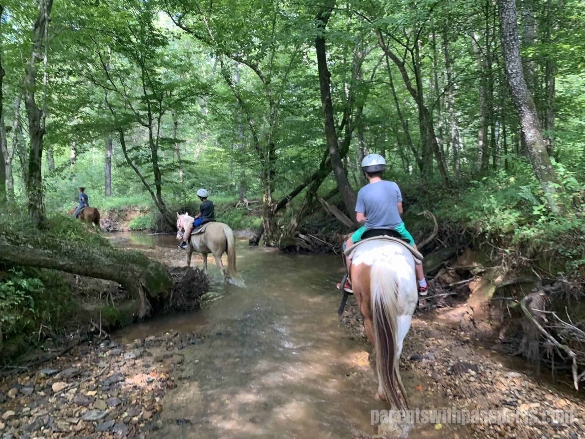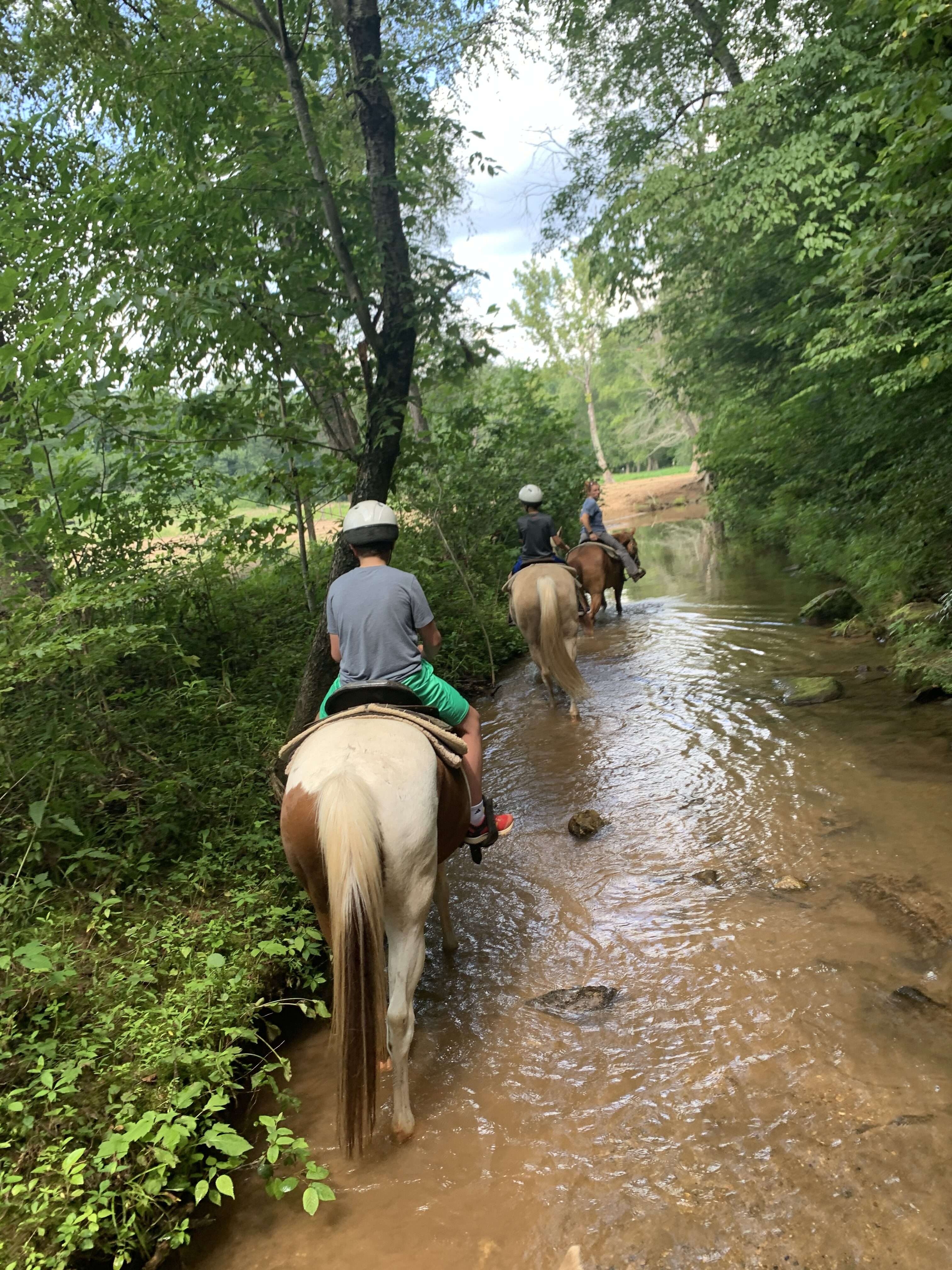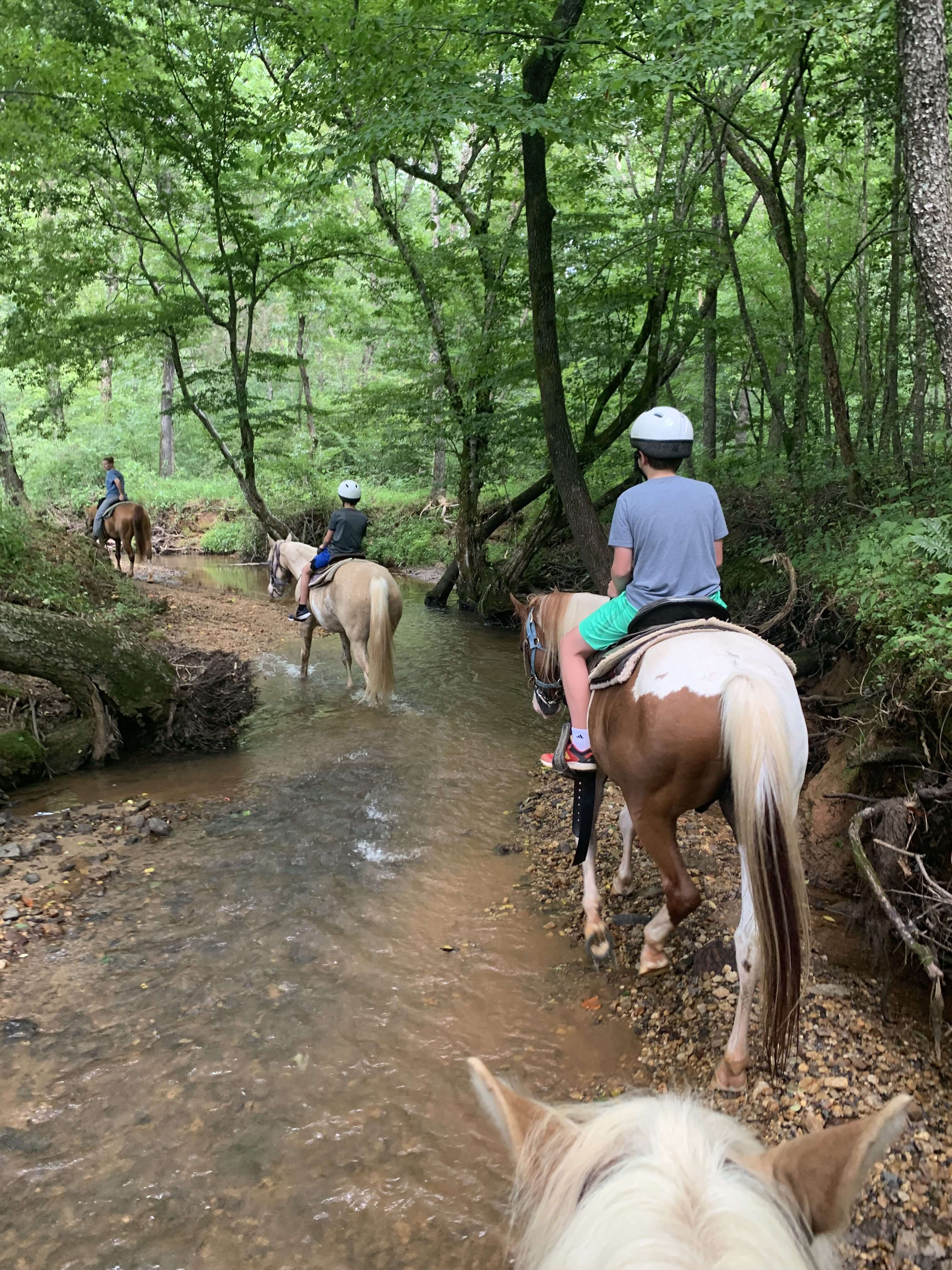 When I signed us up for the Cedar Creek Trail, I had no idea that the creek itself WAS the trail. As soon as we entered the woods, we turned not onto a dirt trail but into the creek itself. The boys loved it! The horses waded along in the water, usually relatively shallow but sometimes high enough that I picked me feet up a little so they wouldn’t get wet. It was much more of an adventure than we were expecting and really made the ride unique.