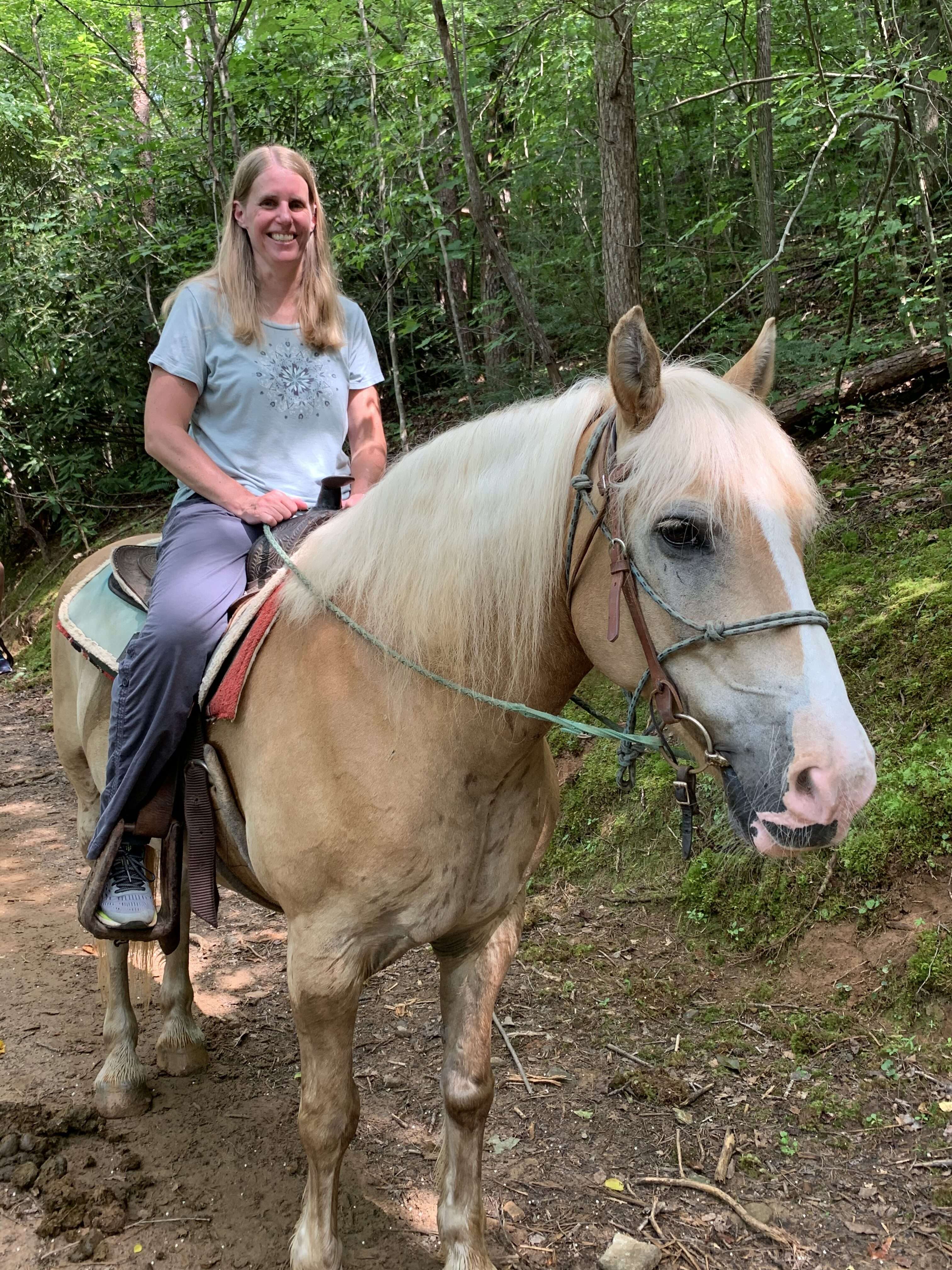 About midway through the ride, the leader stopped the group and dismounted her horse to take pictures of each of us on our horses. (Due to Covid-19, she used her own phone and then texted them to us.) I really appreciated her taking them, since otherwise 90% of my photos were of the horses’ behinds.