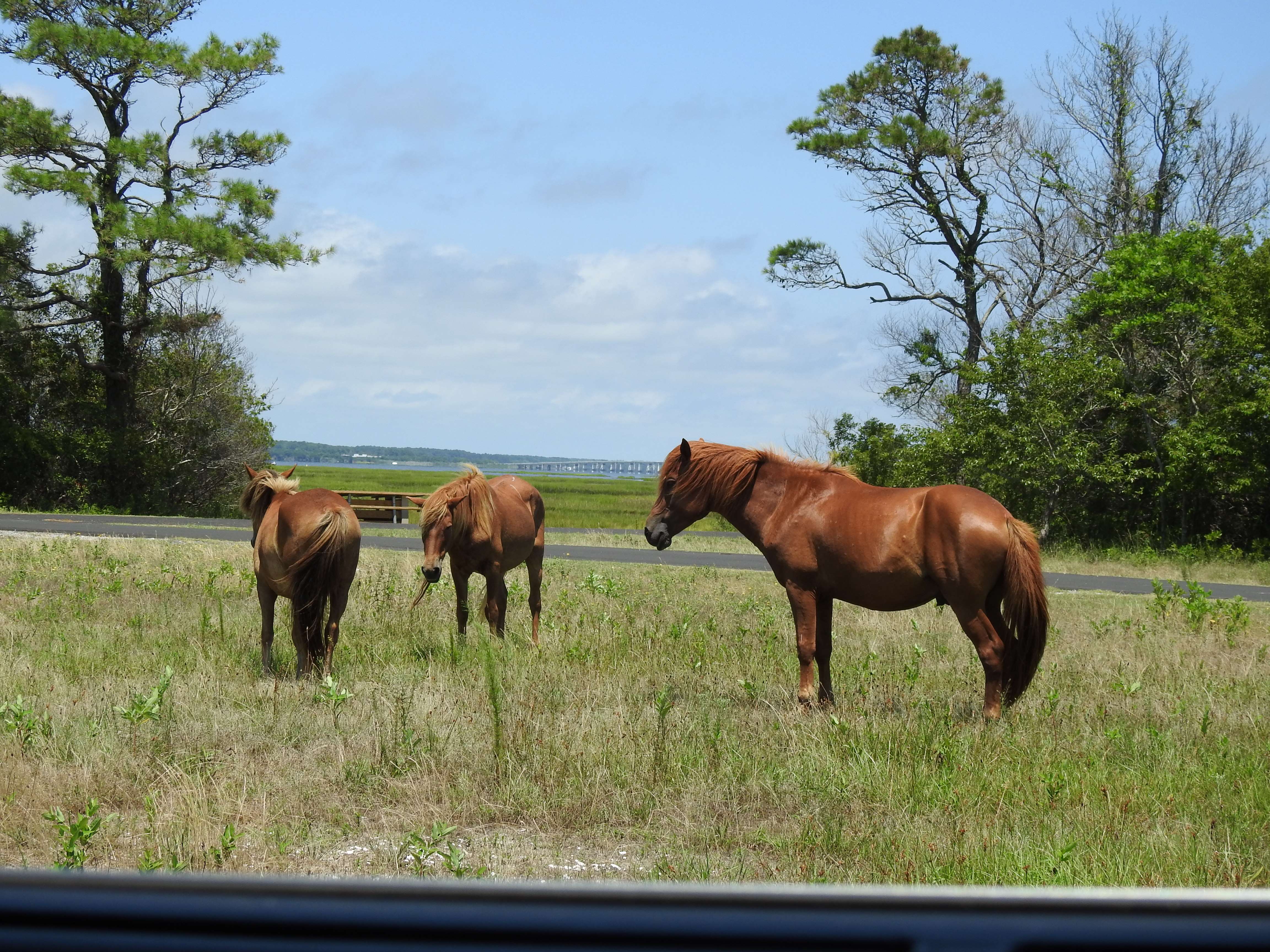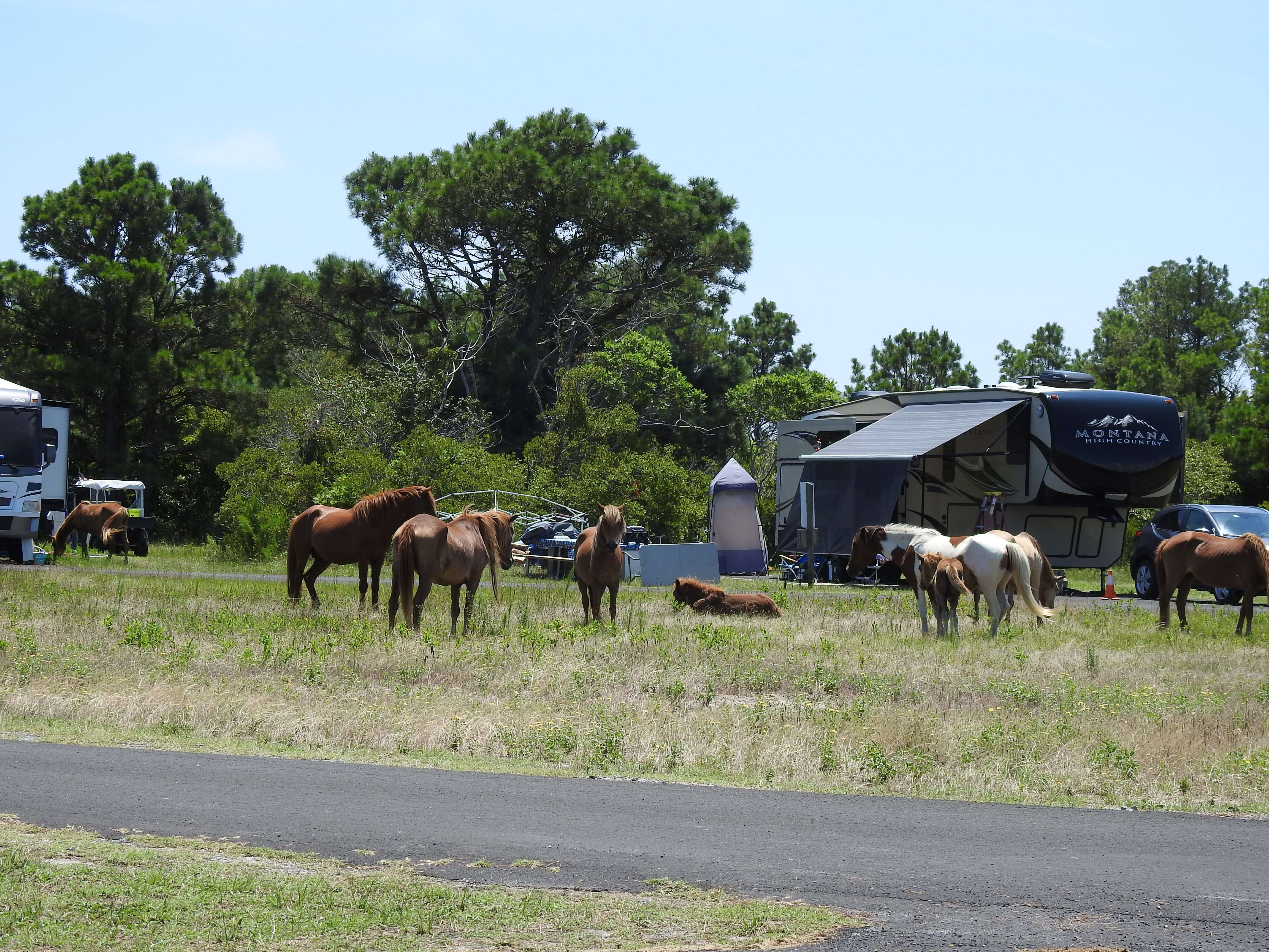 With our wild horse quota unfilled (save for the ones we saw from the car right when we drove over the bridge), we decided to head out in search of some after our kayaking. We didn’t have to go far. Right down the street at one of the campgrounds, a band of horses were roaming around like stray dogs hoping to find some scraps. It was a bizarre sight to see them mere feet away from people’s camp sites. Not quite the beautiful, natural backdrop I had been hoping to capture them in (on the beach or in the marshland) but it would have to do. On the plus side, it allowed us to get really close to them.