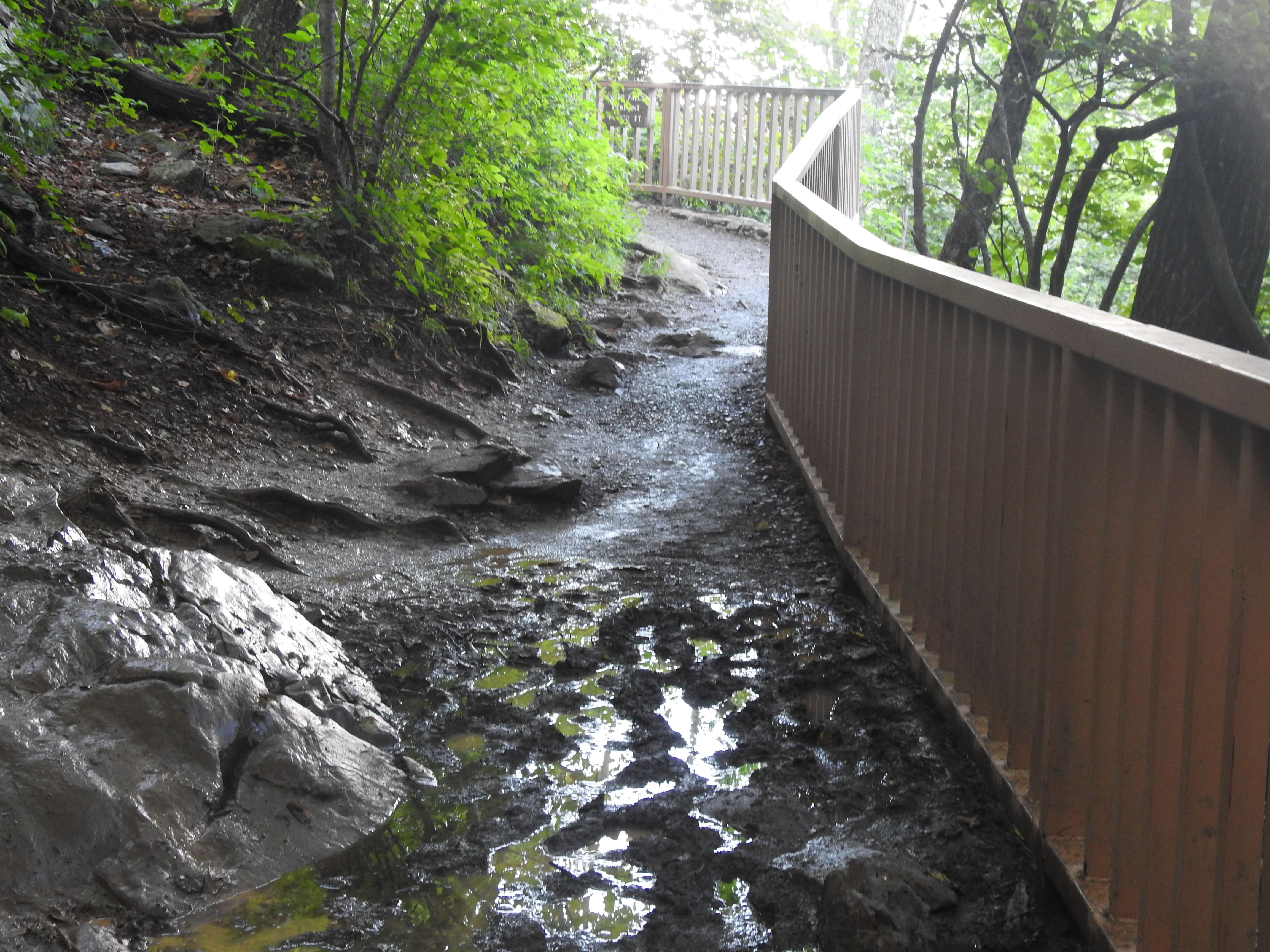 The trail is a combination of dirt/mud, rocks, tree roots and logs. It is definitely not stroller friendly (we saw one poor dad carrying a stroller and his kid on the way down) and is best for the sure-footed. It is a really fun hike though if you are up for a little bit of an adventure.