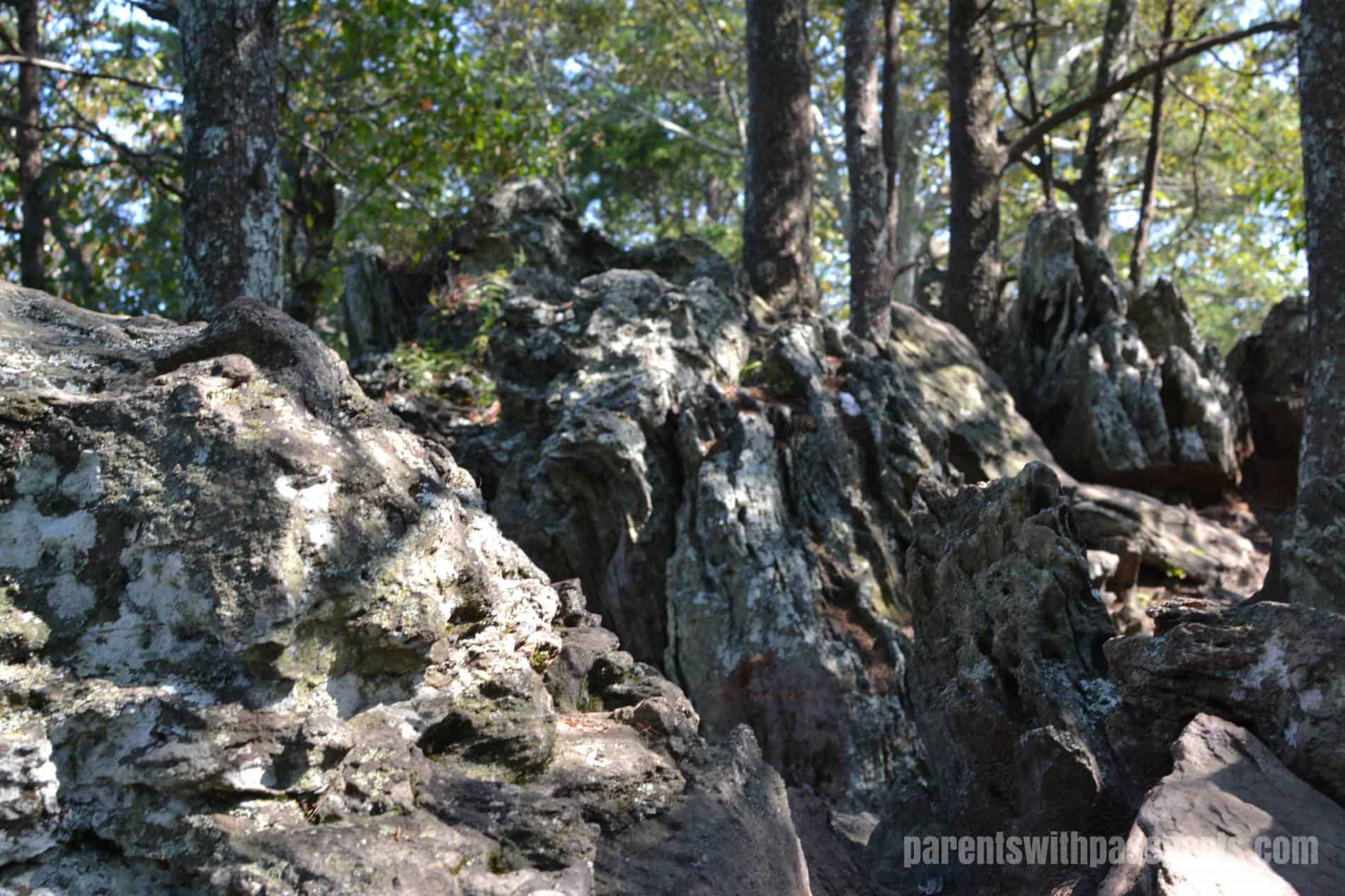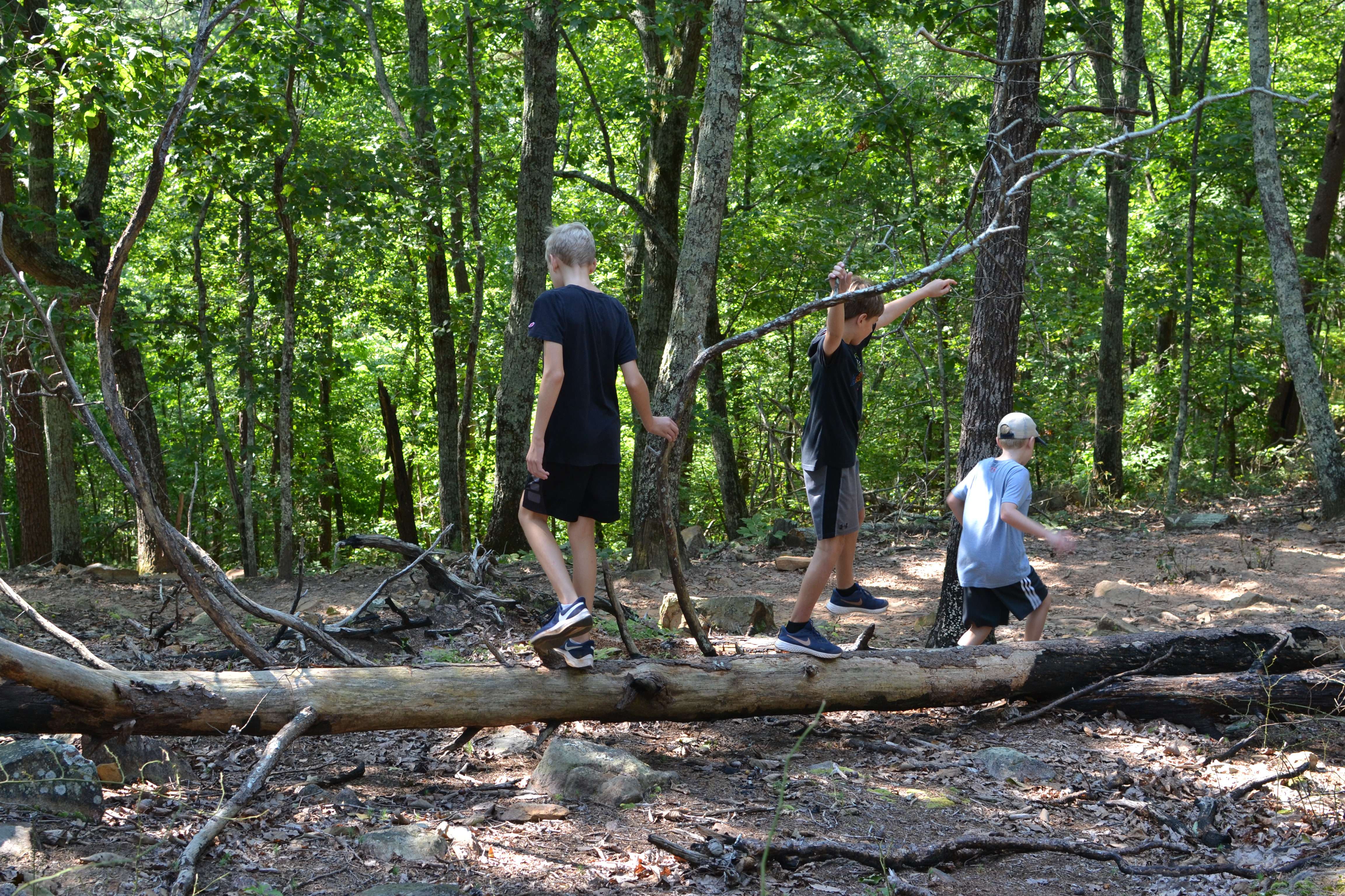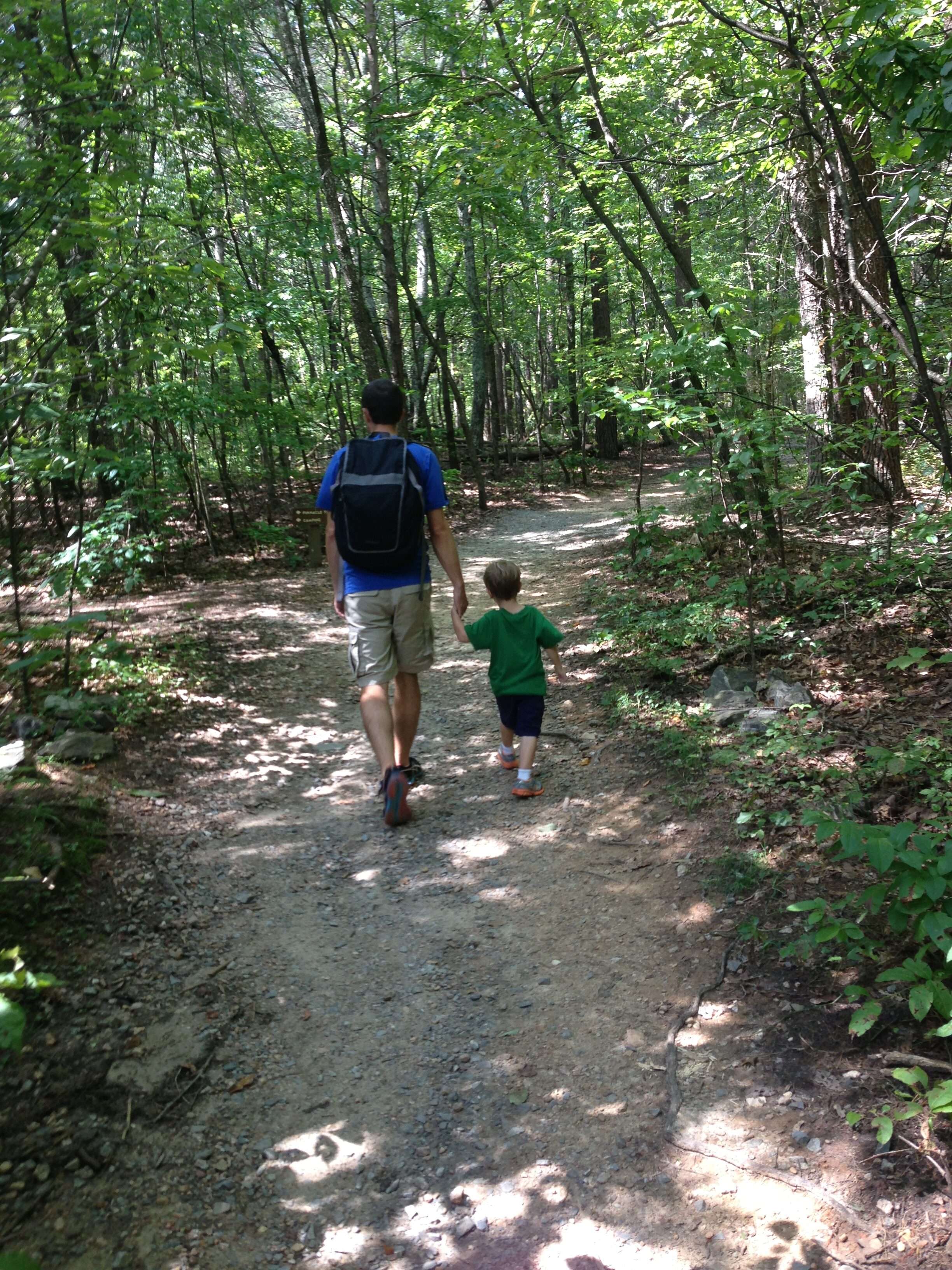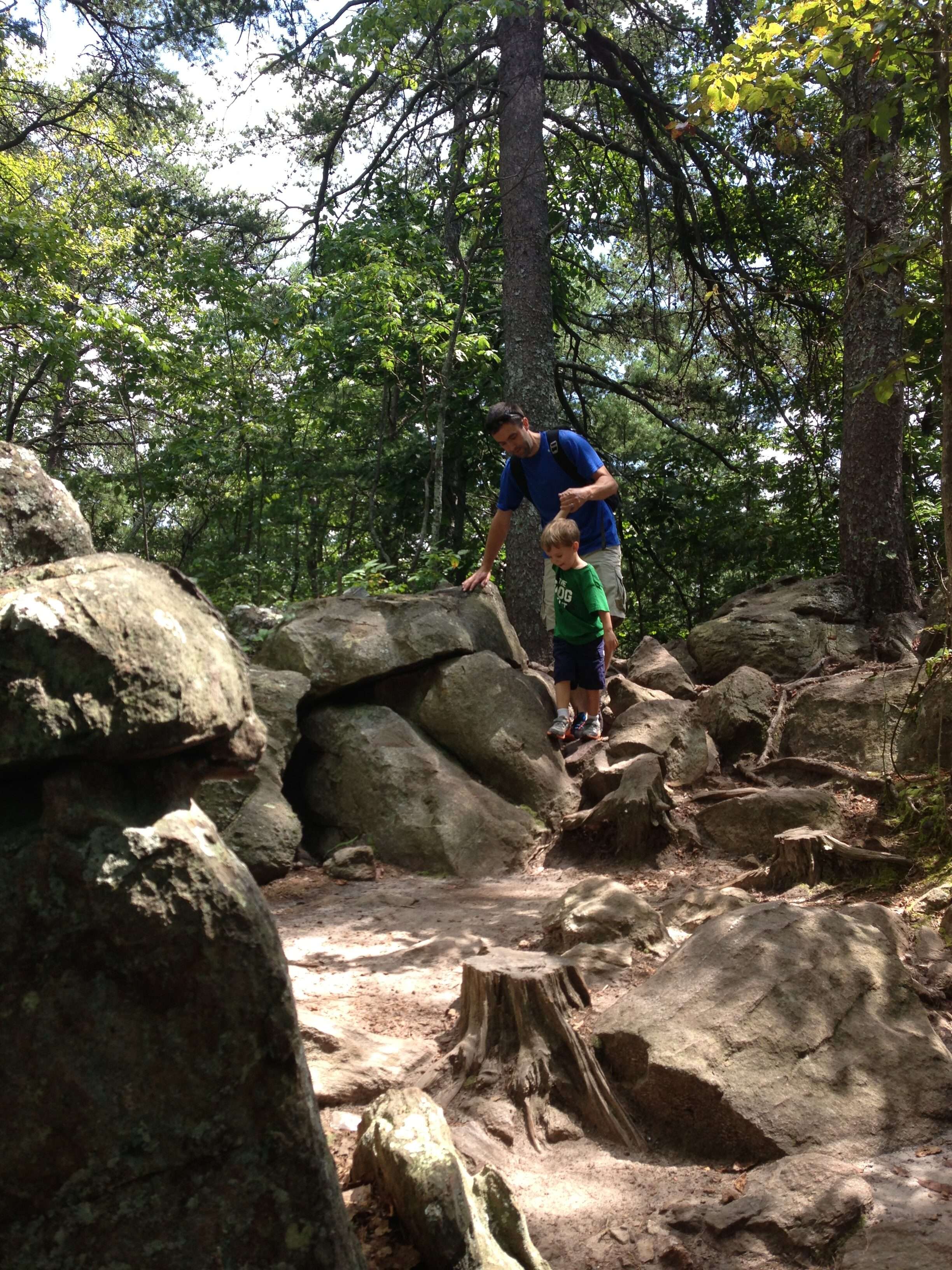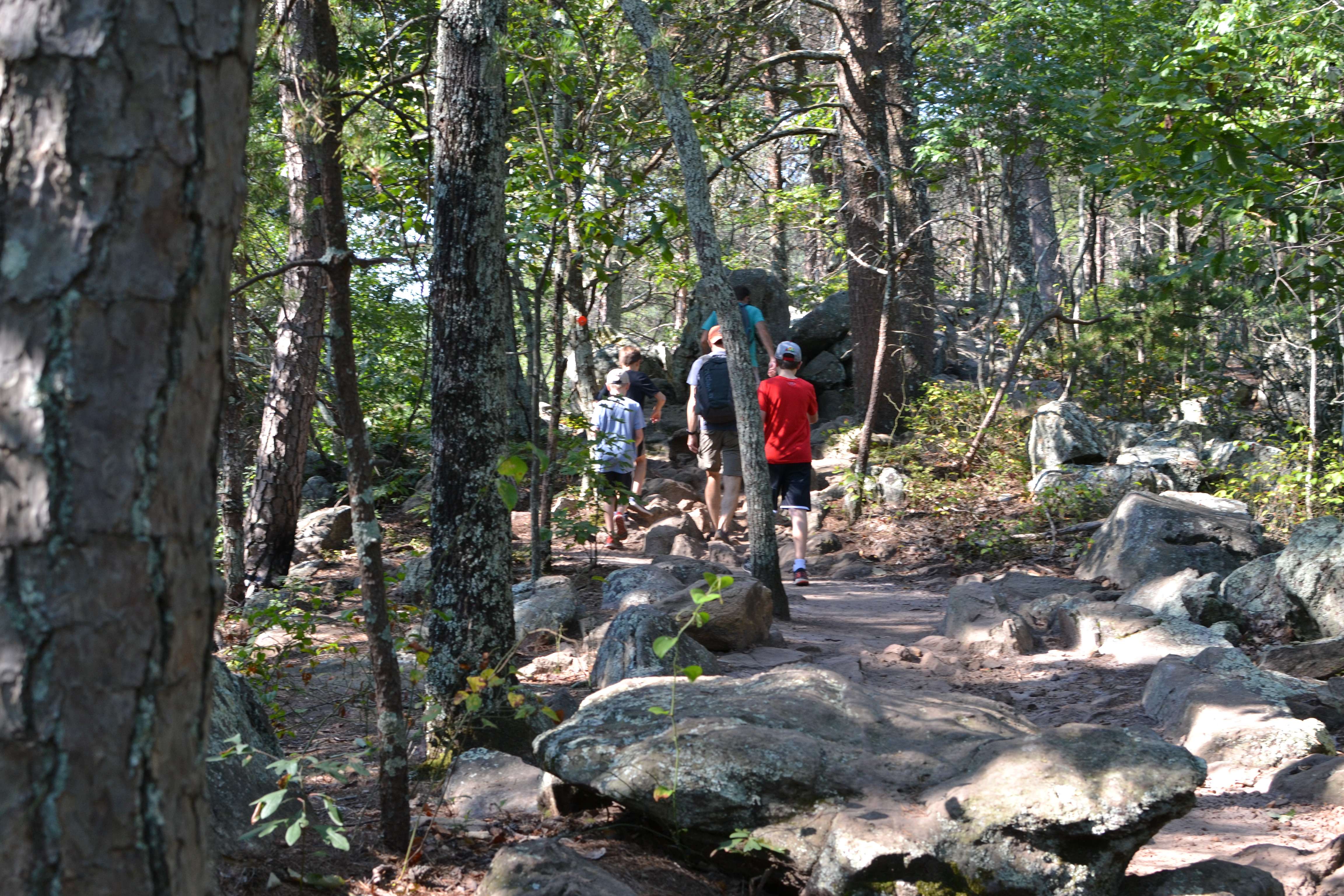 The trail started out as a wide, gravel path but soon turned rocky. At this age, the rocks and tree roots were less concerning for the kids, although everyone needed to watch their footing. But the boys thought it was a lot of fun to climb on the rocks and hop over fallen trees.