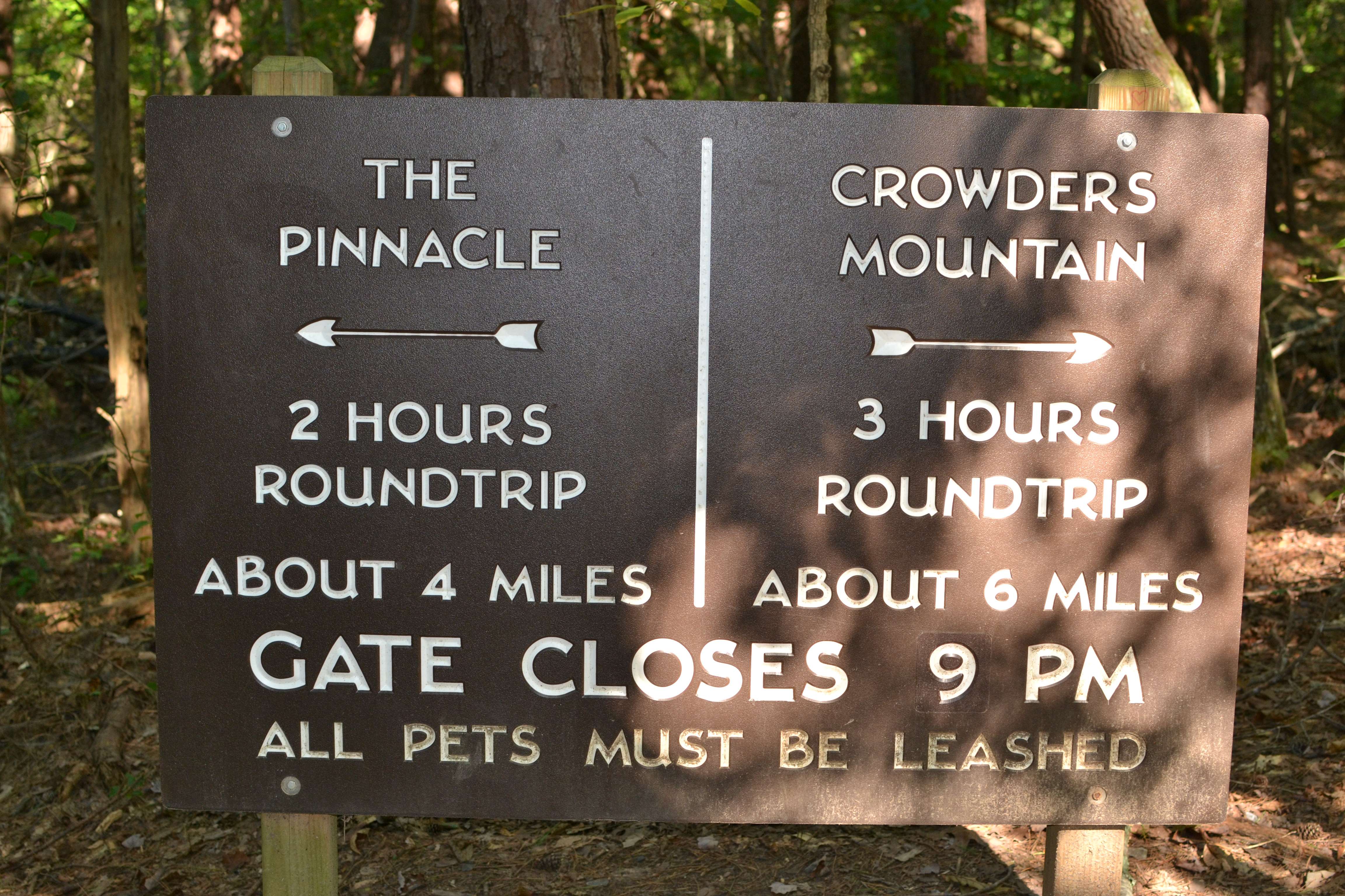 Shortly after starting, the trails branch off in opposite directions, each heading to a different peak within the park. The Crowders Mountain peak is 1,625 feet high and the trail to reach it is 2.8 miles one way. Heading in the opposite direction, the Pinnacle Trail is shorter at 2 miles one way but leads to a higher peak. At 1,705 feet, the Pinnacle is the highest point in Gaston County.