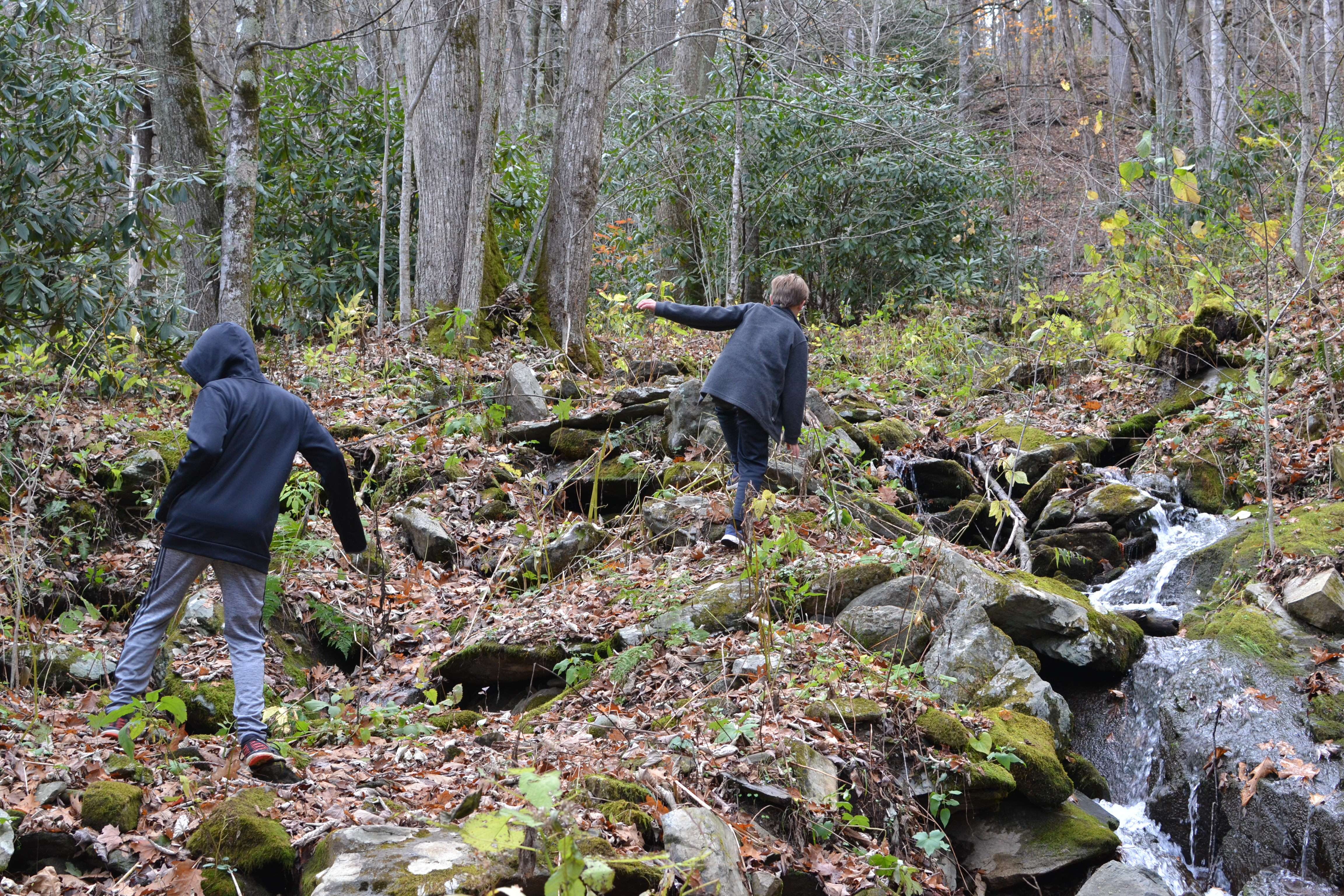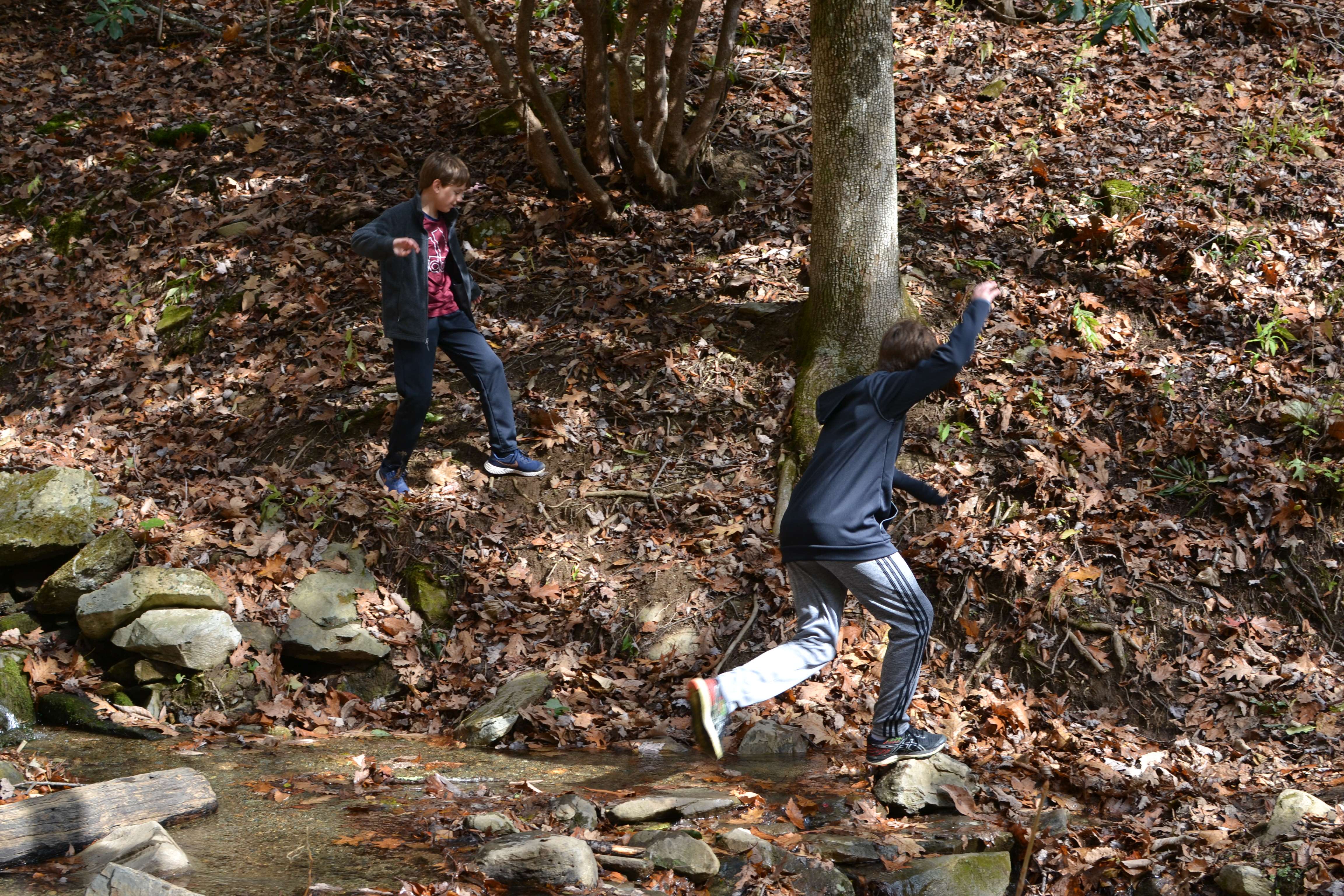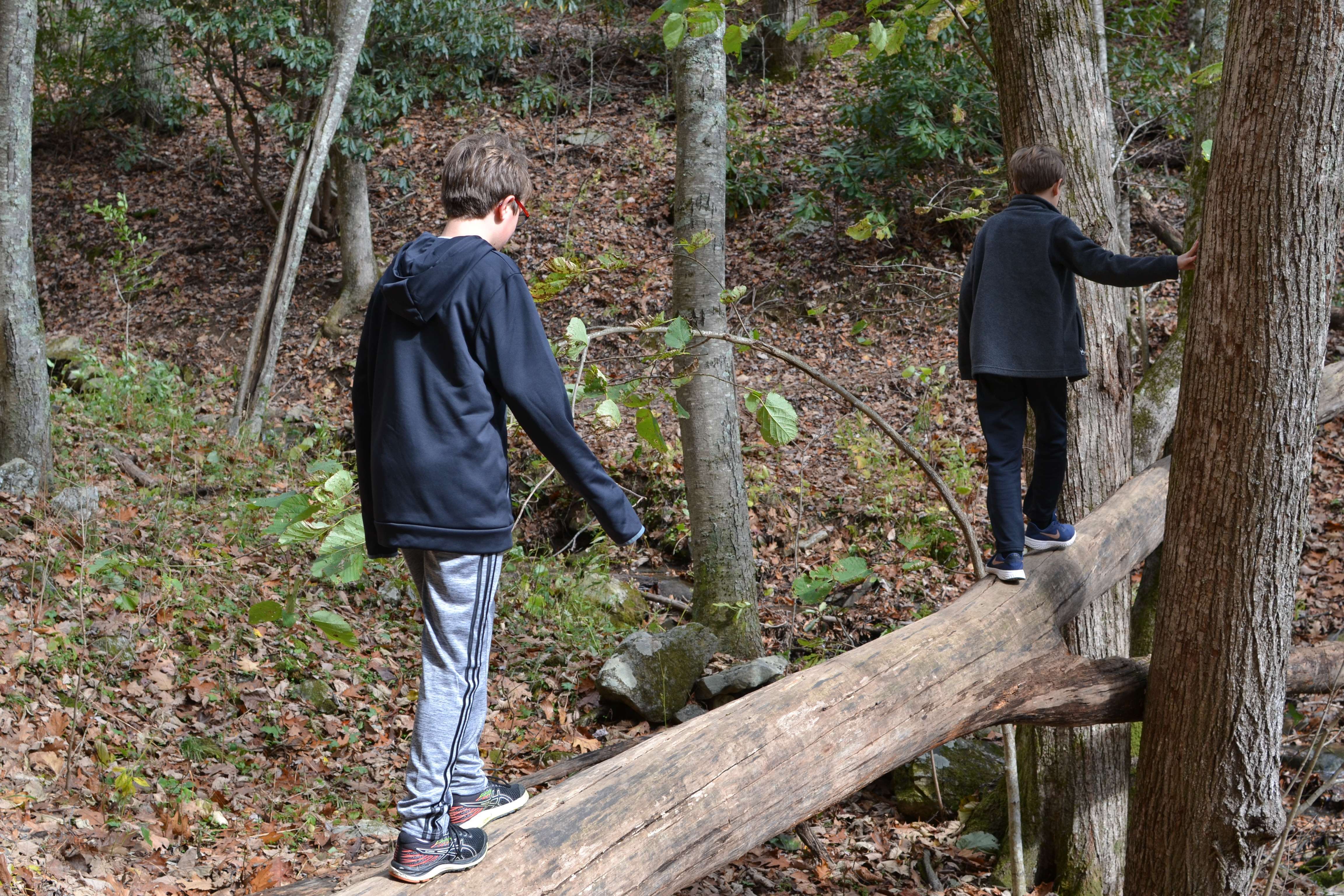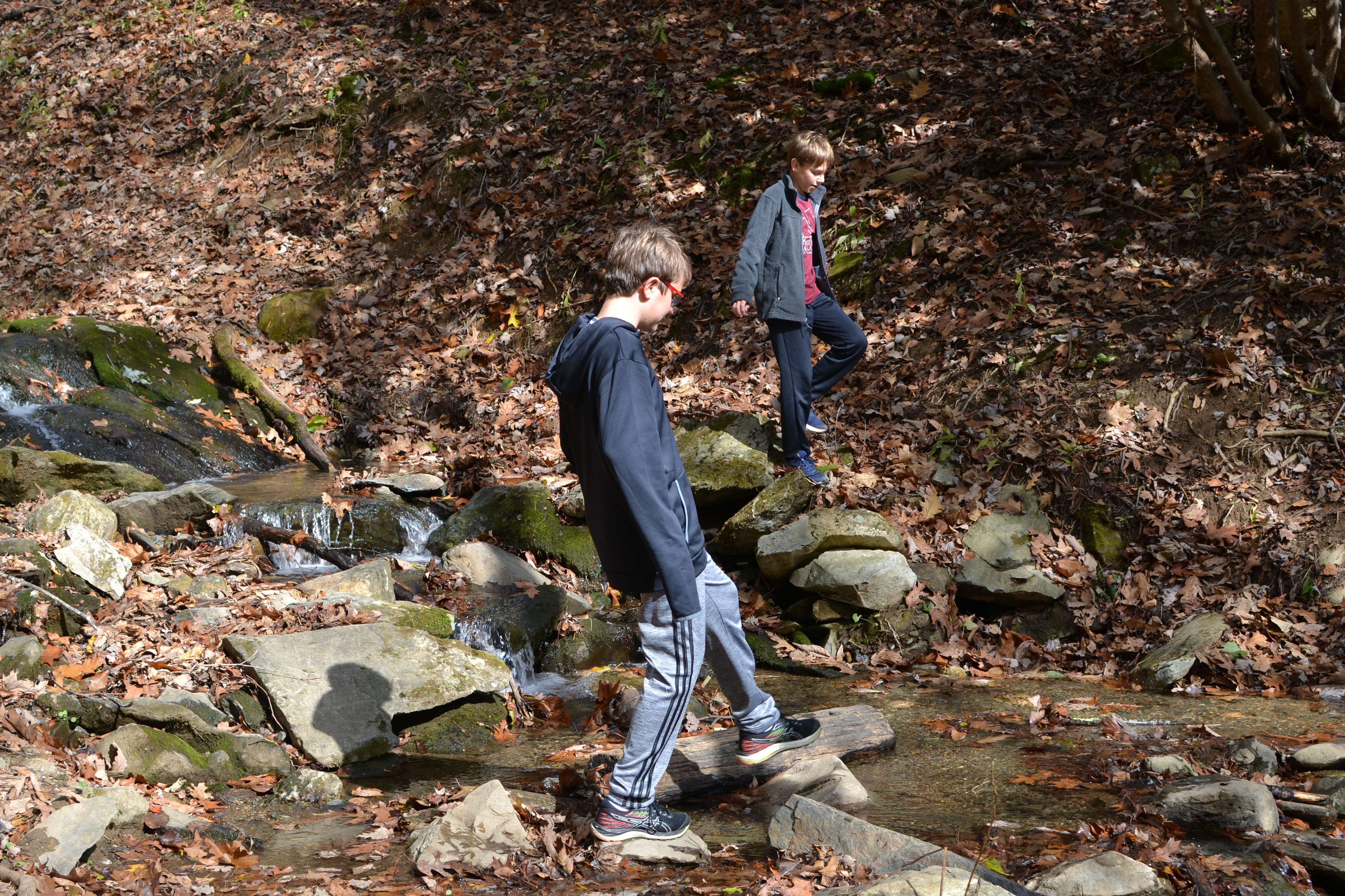 We headed down the trail and into the woods. On the red loop trail, we bore to the right. The boys had great fun running through the woods, climbing across fallen trees, and hopping from rock to rock to cross the stream.