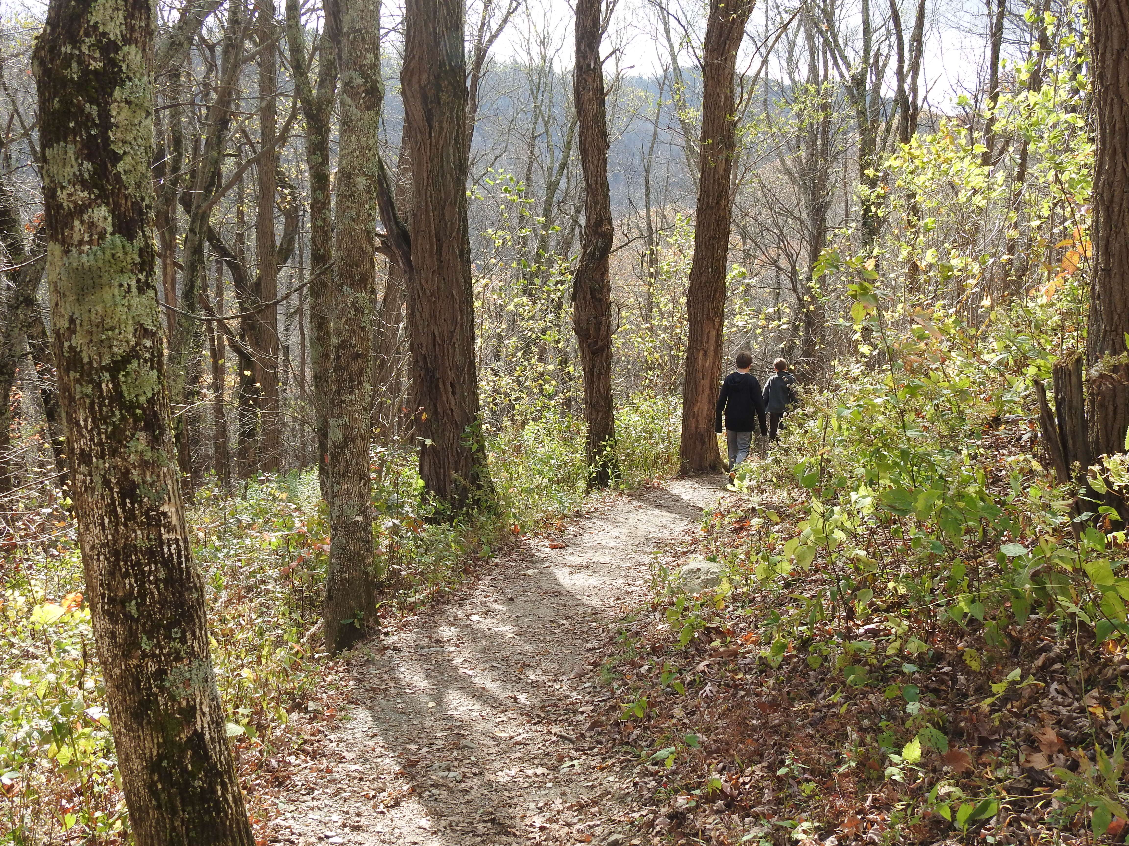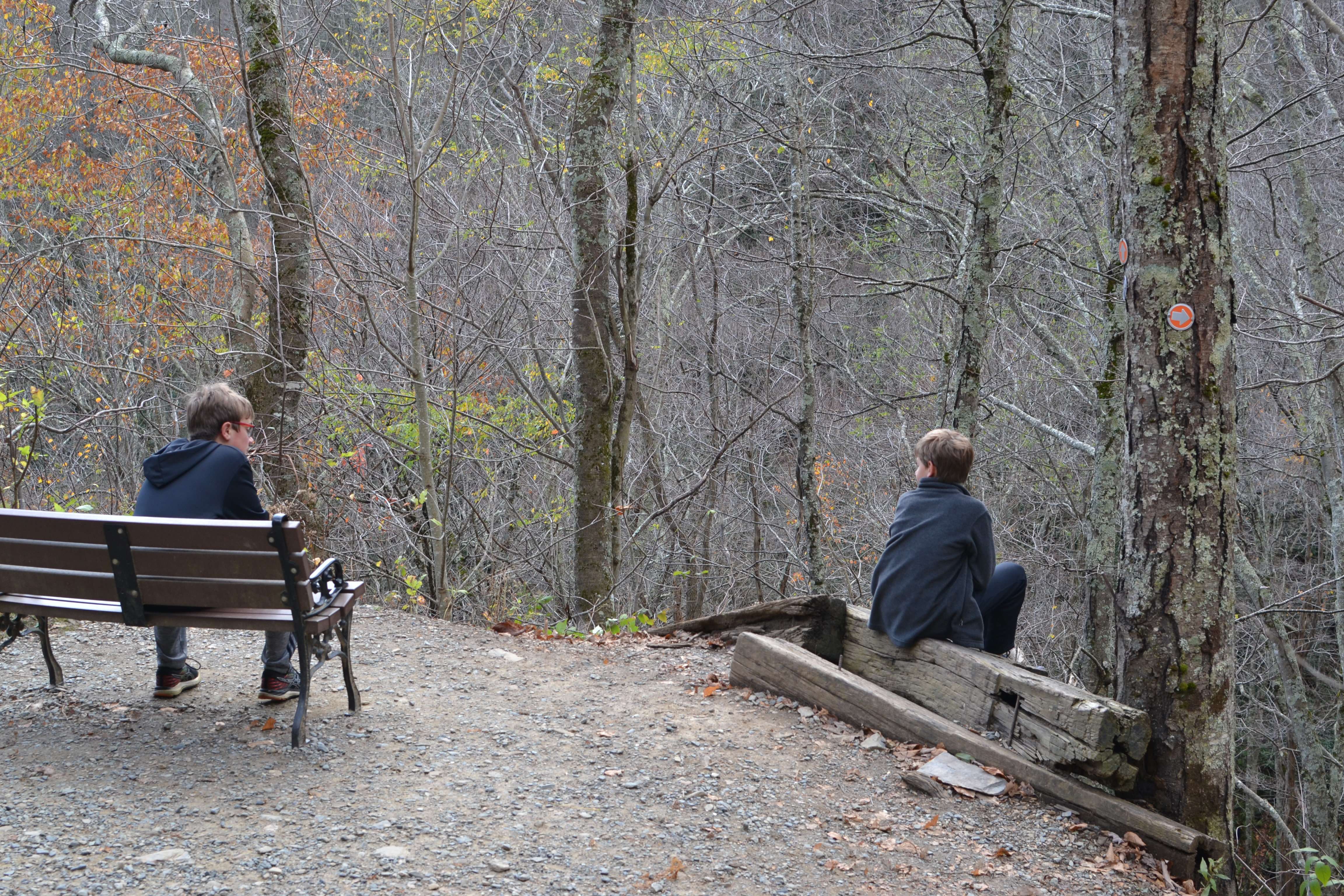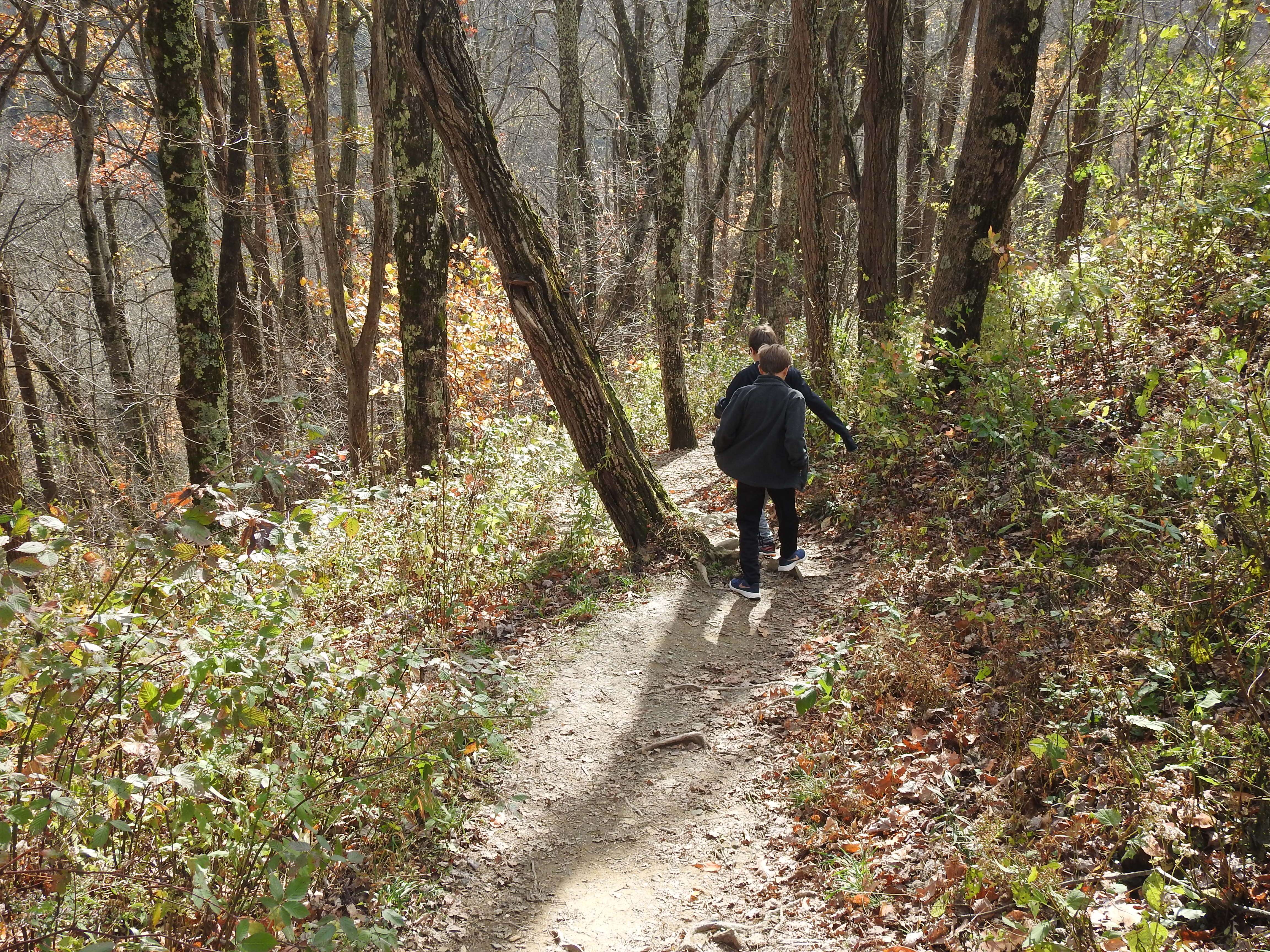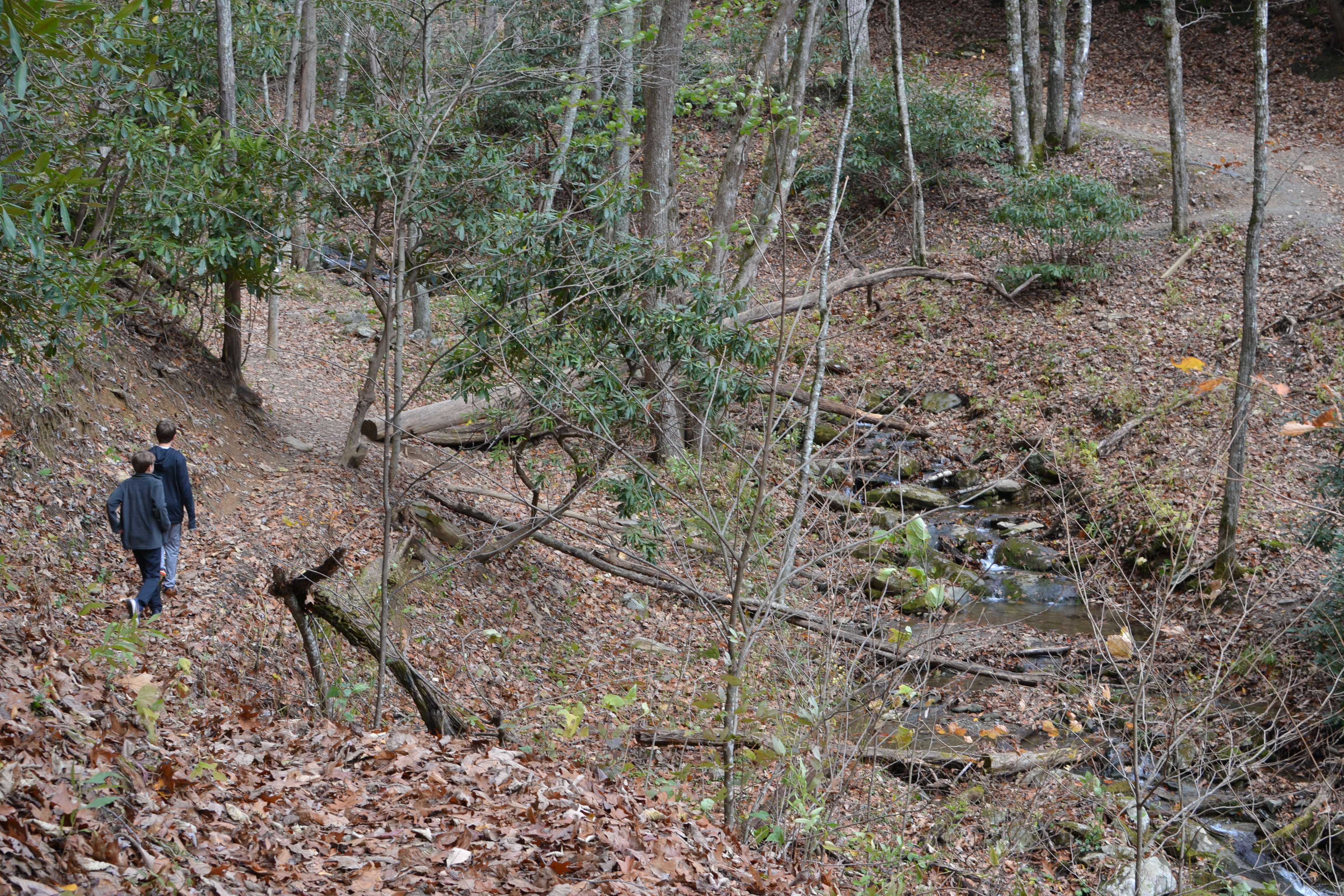 We headed down the trail and into the woods. On the red loop trail, we bore to the right. The boys had great fun running through the woods, climbing across fallen trees, and hopping from rock to rock to cross the stream.