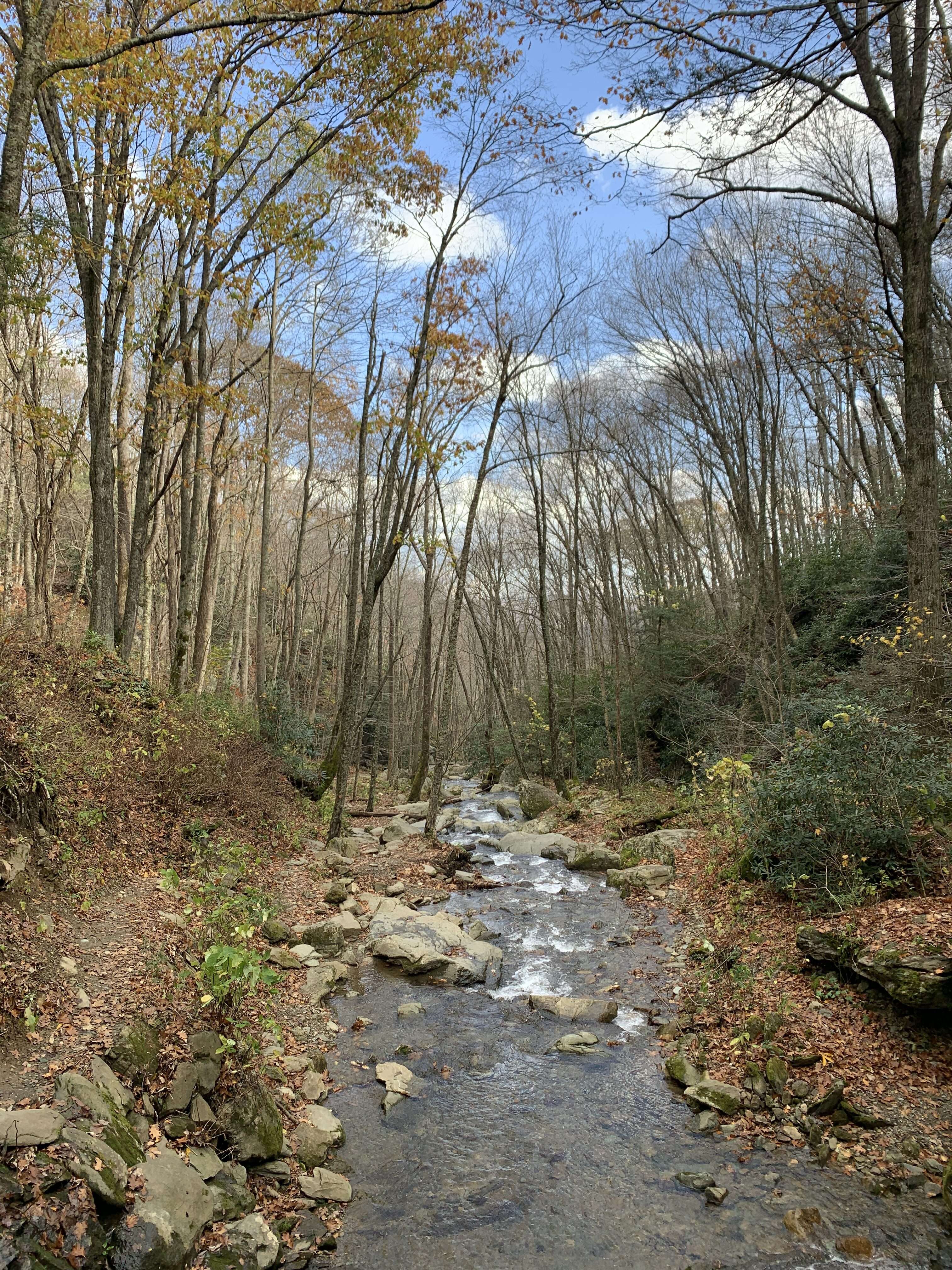 We enjoyed the sights and sounds of the waterfall from the observation deck for a while and then headed downstream. We had to take a chance at a slightly wet foot to get across the stream again and pick up the yellow trail. It was all part of the adventure though and the boys loved it. We walked along the stream for a bit and enjoyed the views looking back at the waterfall.