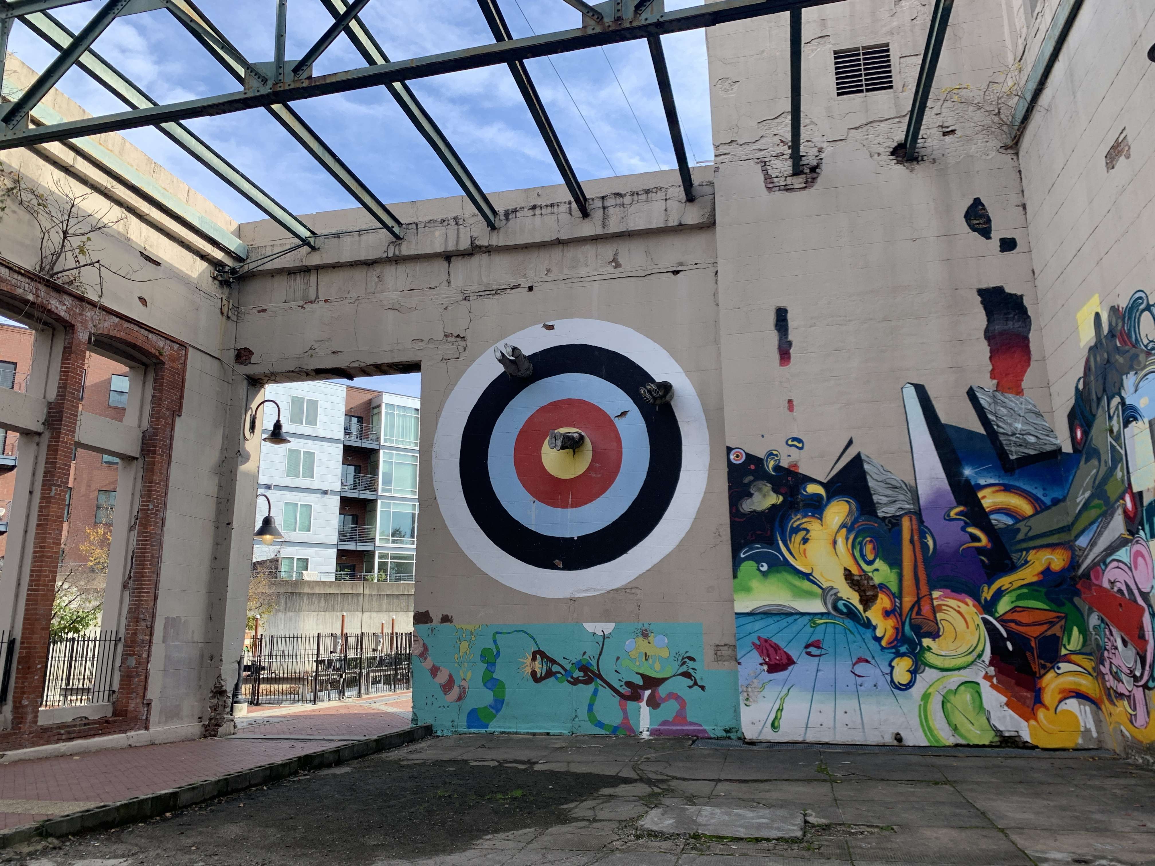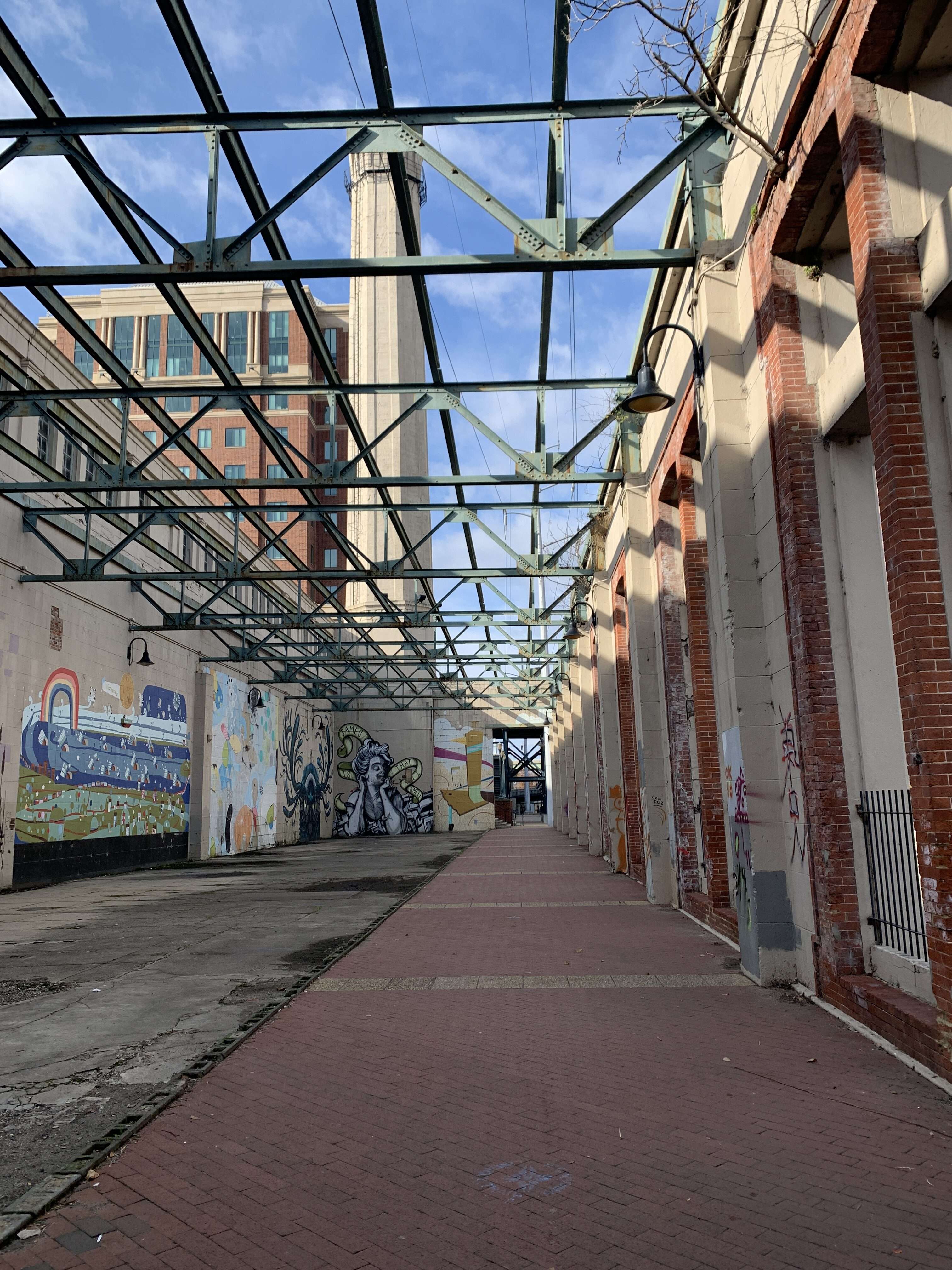 One of the biggest surprises for us on our walk was the discovery of some amazing street art. As we headed towards the canal, we stumbled upon a large open-air alley displaying some amazing artwork on the back of a building. These fantastic pieces of art were the result of the 2012 RVA Street Art Festival. Over a dozen artists decorated the James River Power Plant Building and Floodwall, resulting in a unique outdoor gallery.
