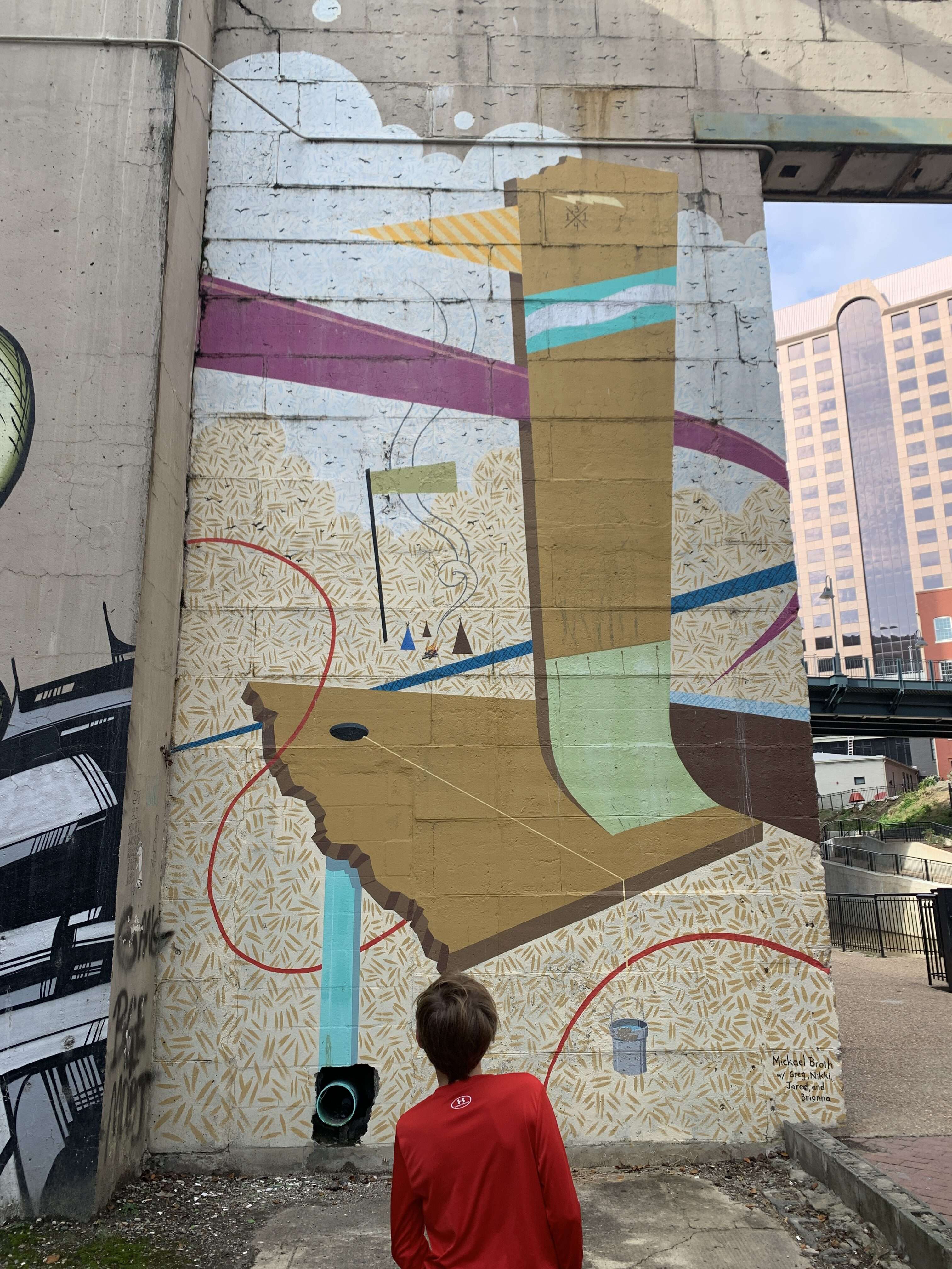 My youngest son and I continued all the way across the bridge, while my husband and oldest relaxed on a bench about half way across. Brown’s Island seemed like a really interesting spot. Part of the James River Park, it is popular for walking, jogging, and biking and hosts outdoor concerts and festivals (and in a normal year, the Richmond Marathon finish line). We watched people on the climbing wall and explored a little bit down the path before heading back to meet up with the more worn-out members of our family.