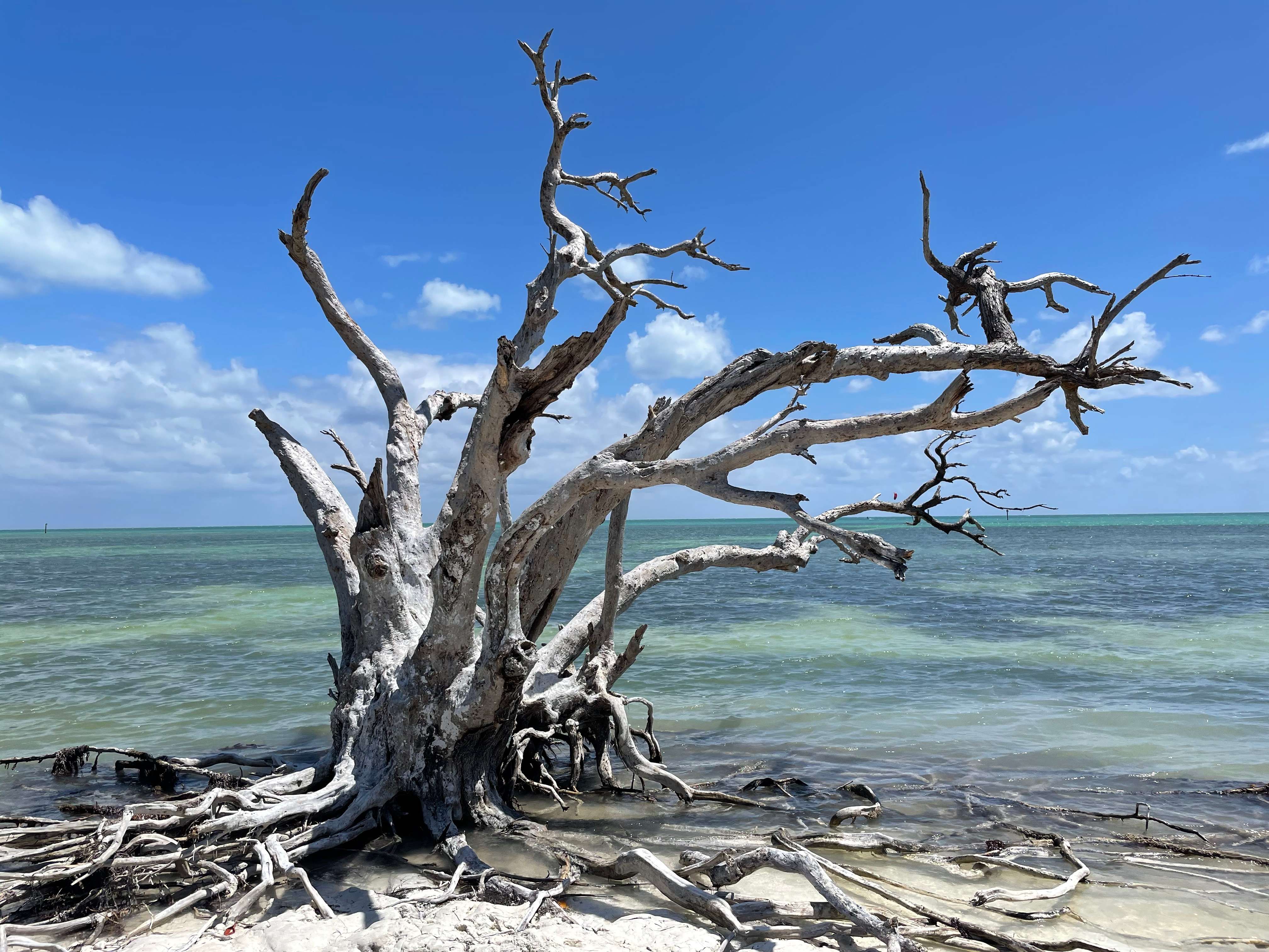 One of the scenic stops we did make was a little beach parking area in Islamorada. There was a boardwalk that ran parallel to the beach and lots of little openings in the brush to walk out onto little beaches. We found a great spot with a really cool tree stump and hung out there for a while. The different shades or greens and blues in the water was stunning.