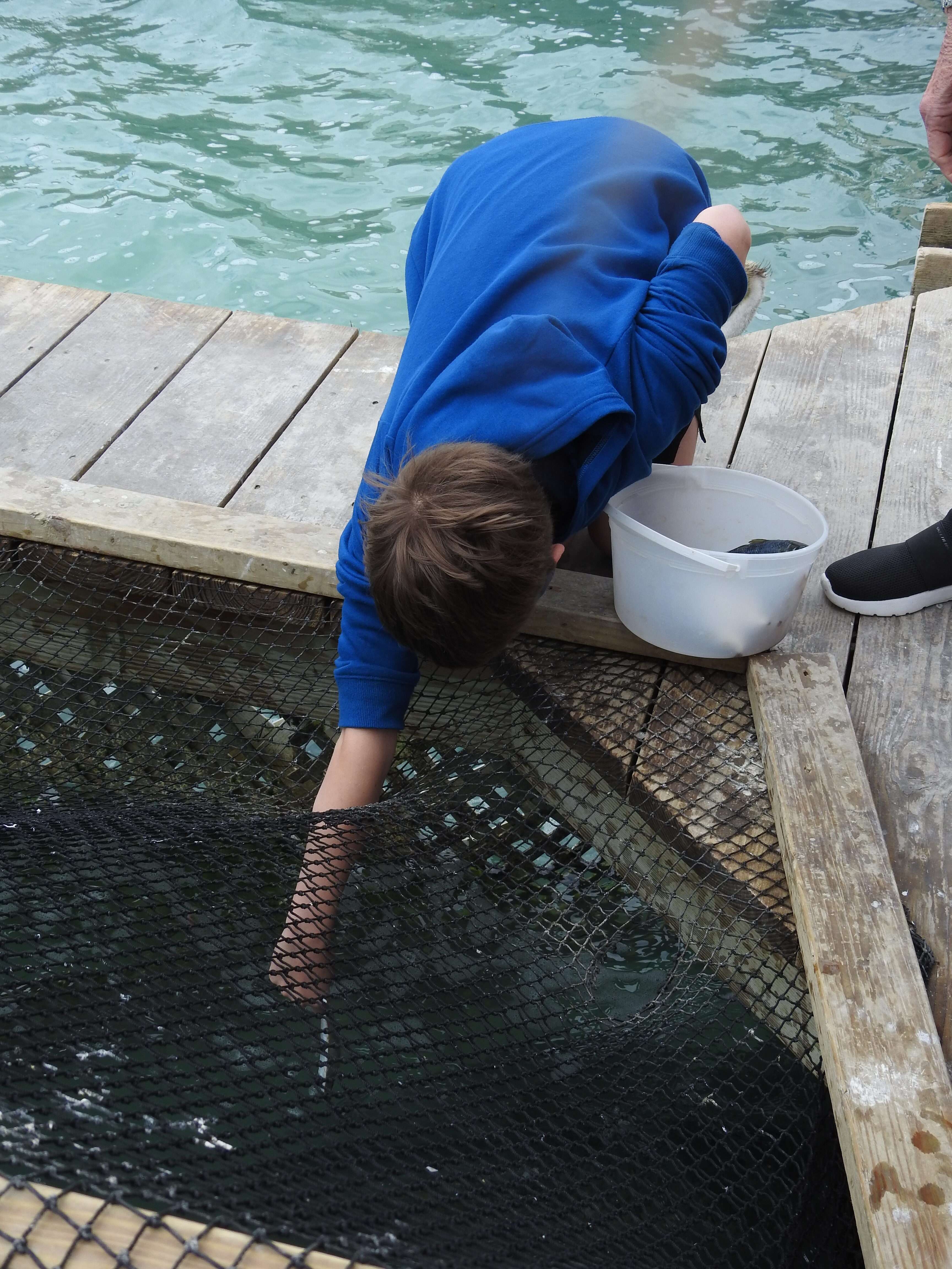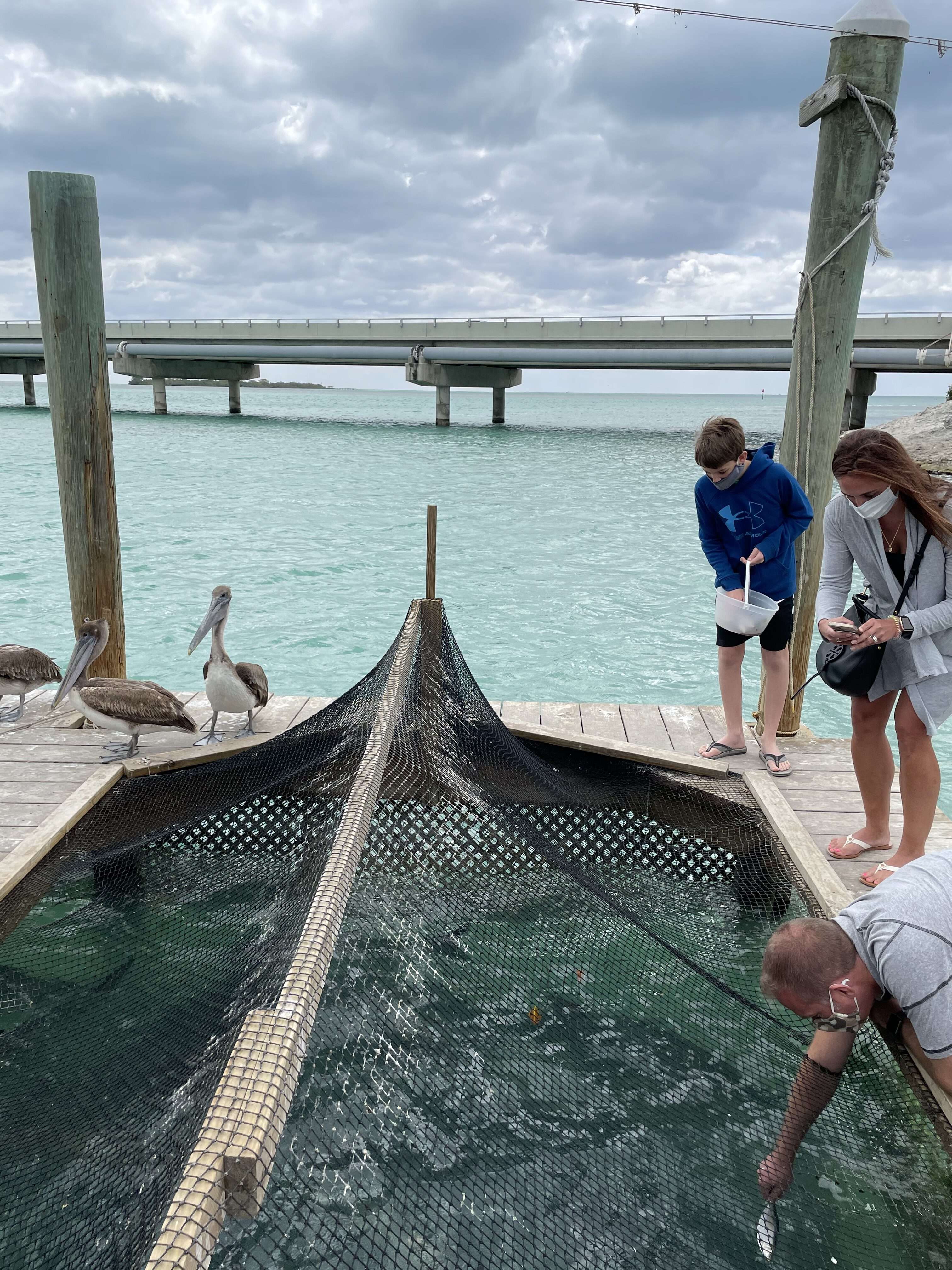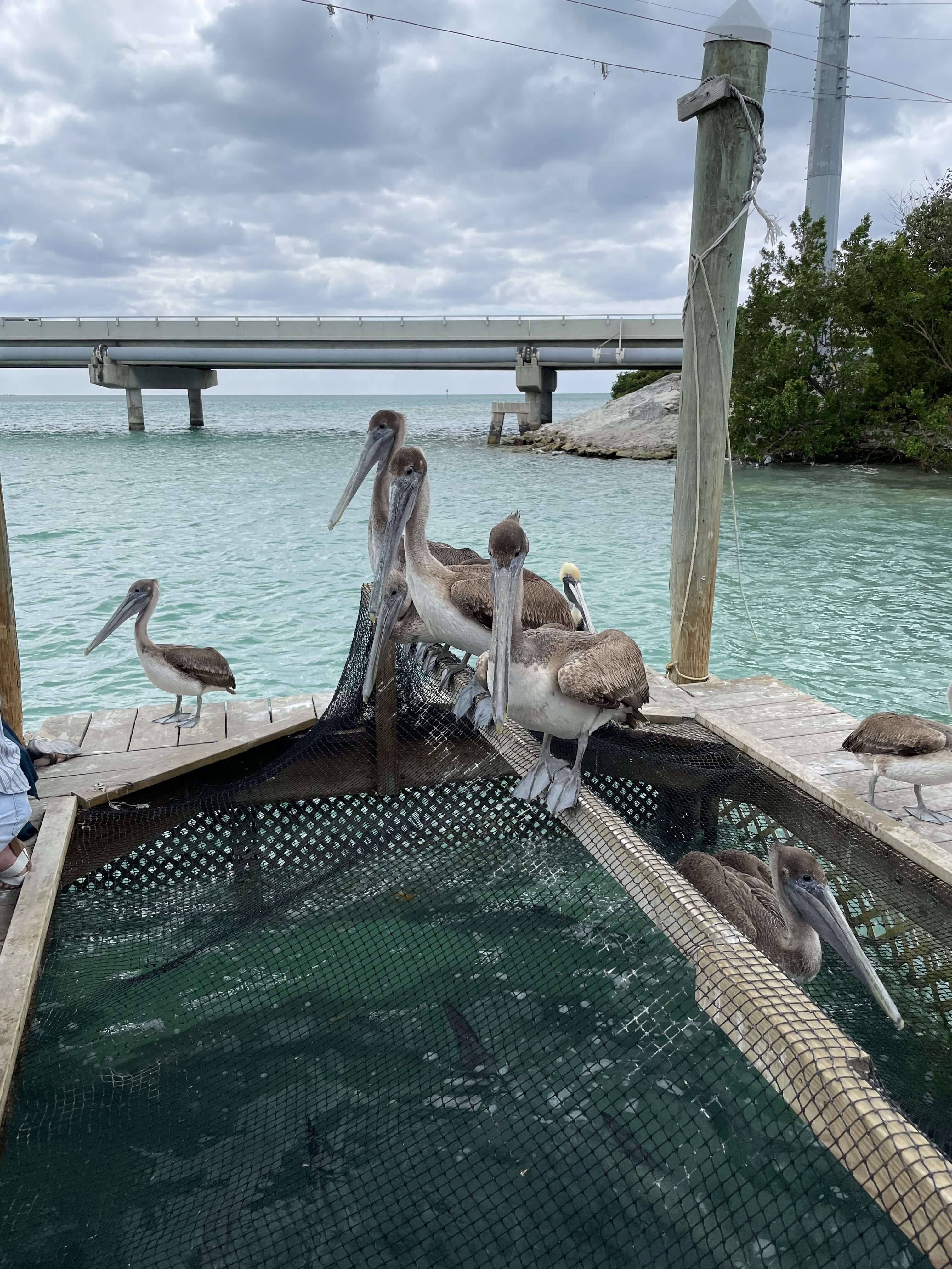 The setup was pretty ingenious. The dock was T shaped and on the sides of the T there were three openings cut in the dock with netting perched over them. The netting kept the pelicans out of the water and the fish in. There were holes cut in the netting to allow you to put your hand down into the water and feed the tarpon.